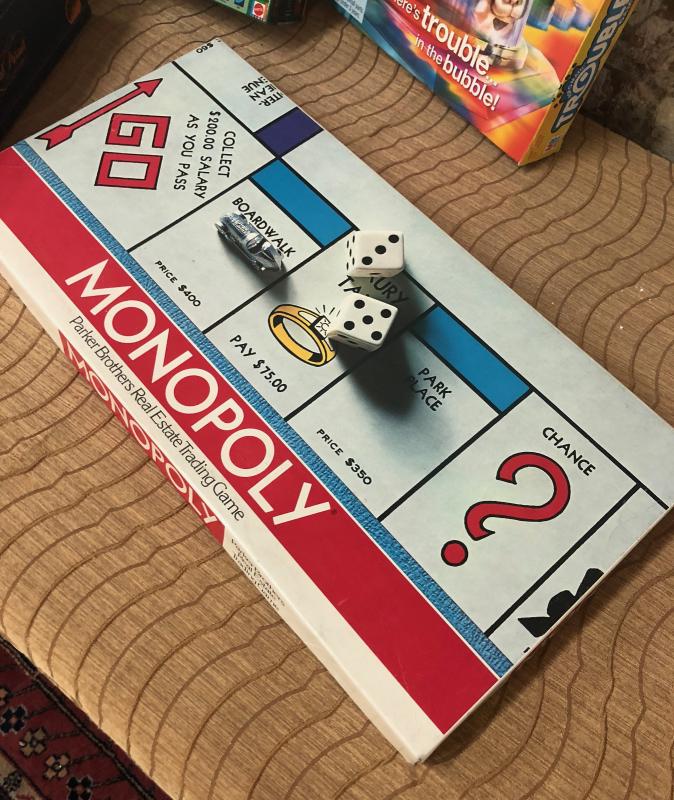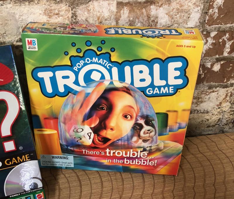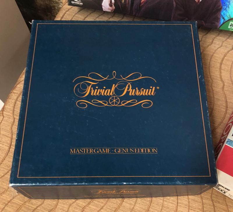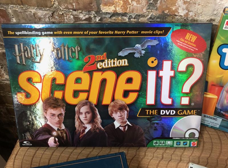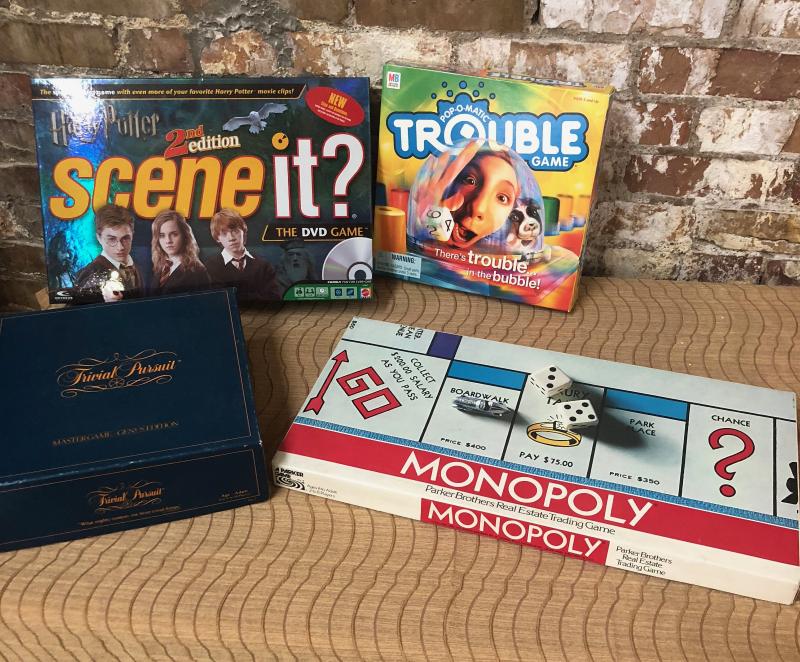Here are four(4) popular board games..slightest use if any...Includes Monopoly..Trivial pursuit..Trouble and scene it? from Harry Potter....