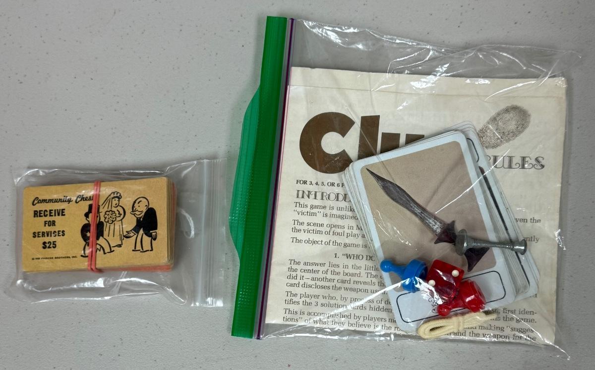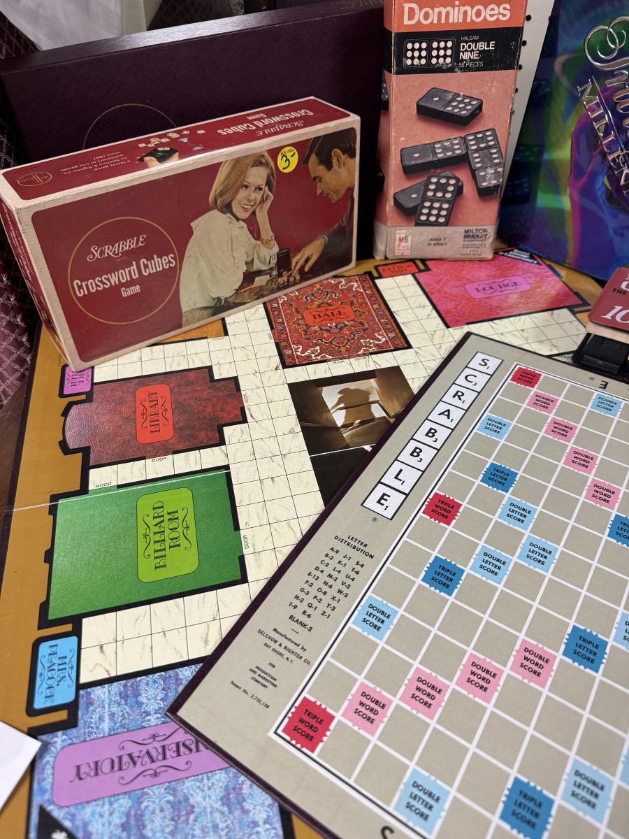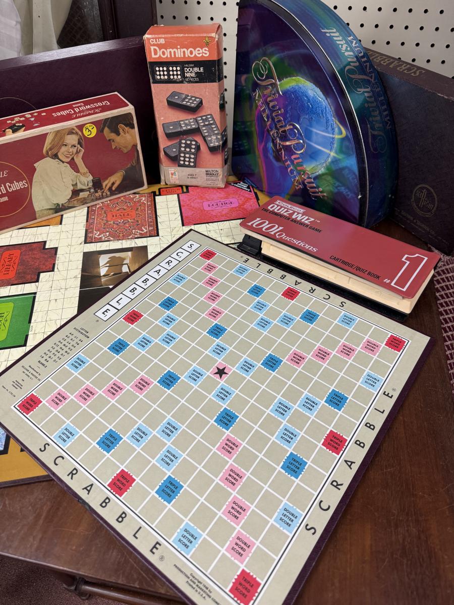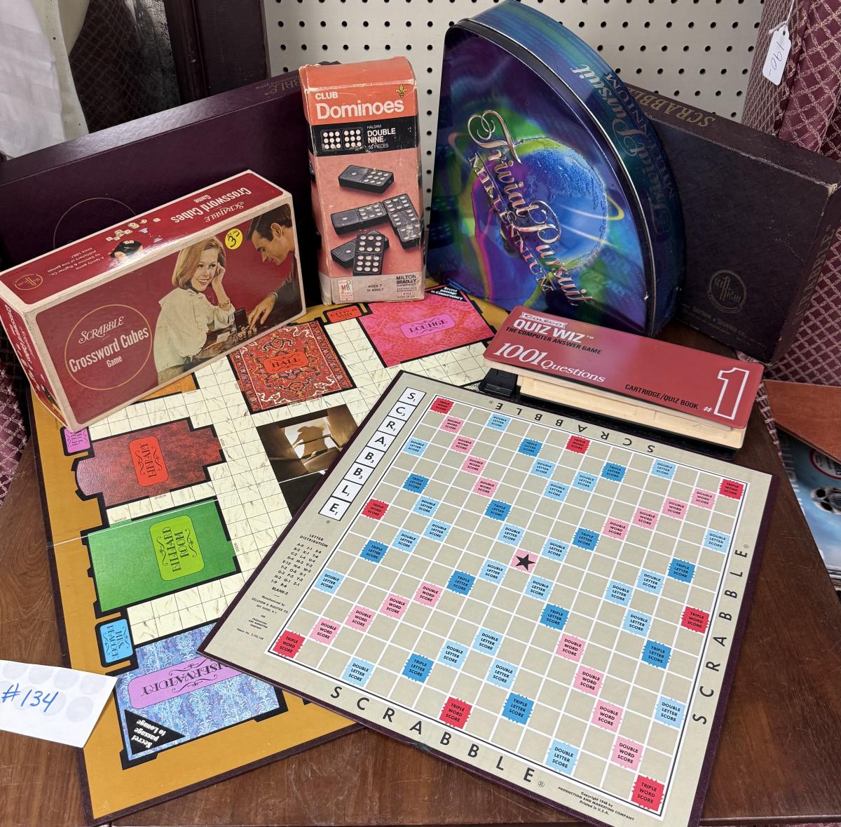 Vintage scrabble boxes x3 (only box included), scrabble board x1, clue board x1 with partial playing pieces. Vintage monopoly cards.