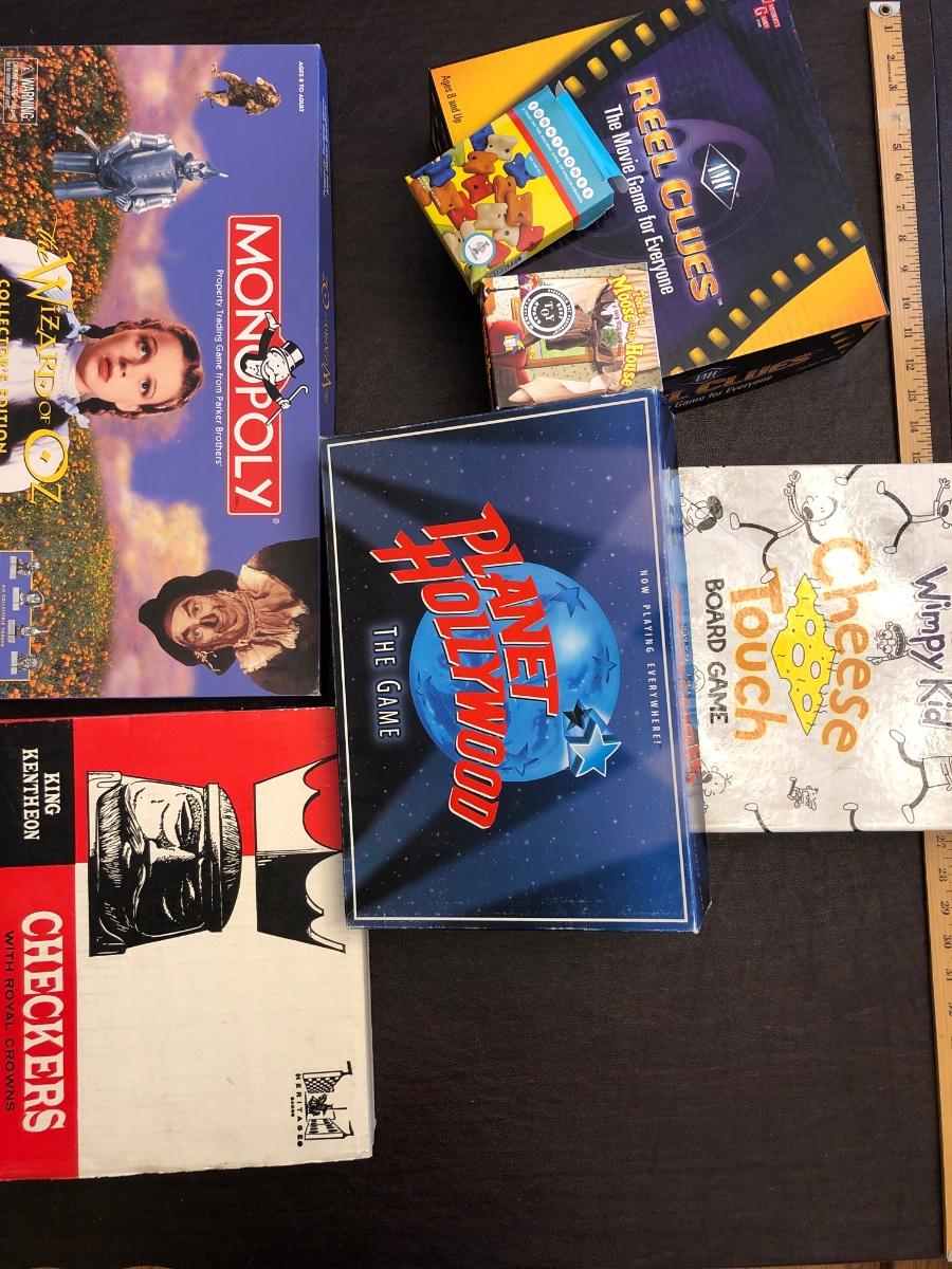 Titles include Wizard of Oz Monopoly, Planet Hollywood, Reel Clues, Diary of a Wimpy Kid Cheese Touch, King Kentheon checkers and more!