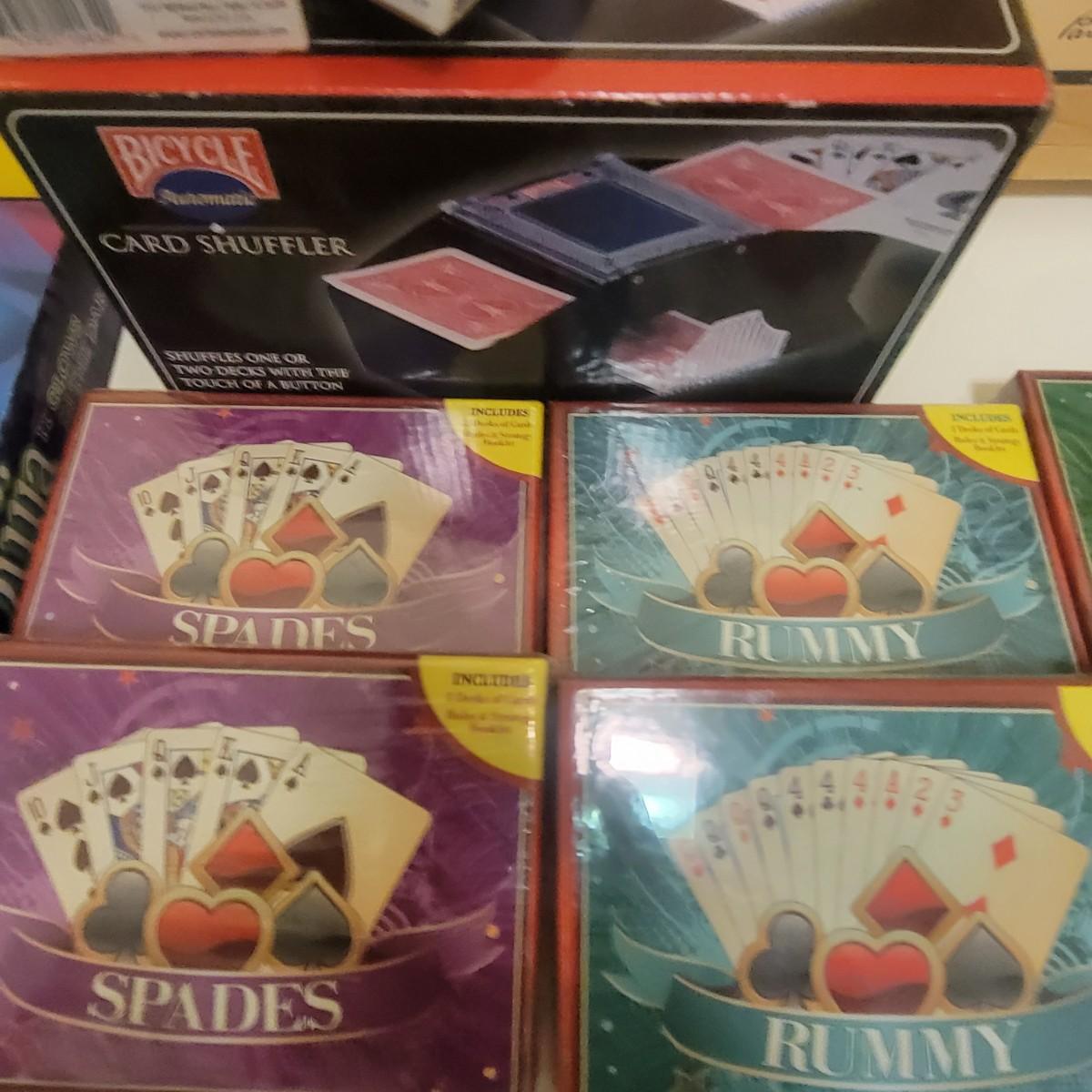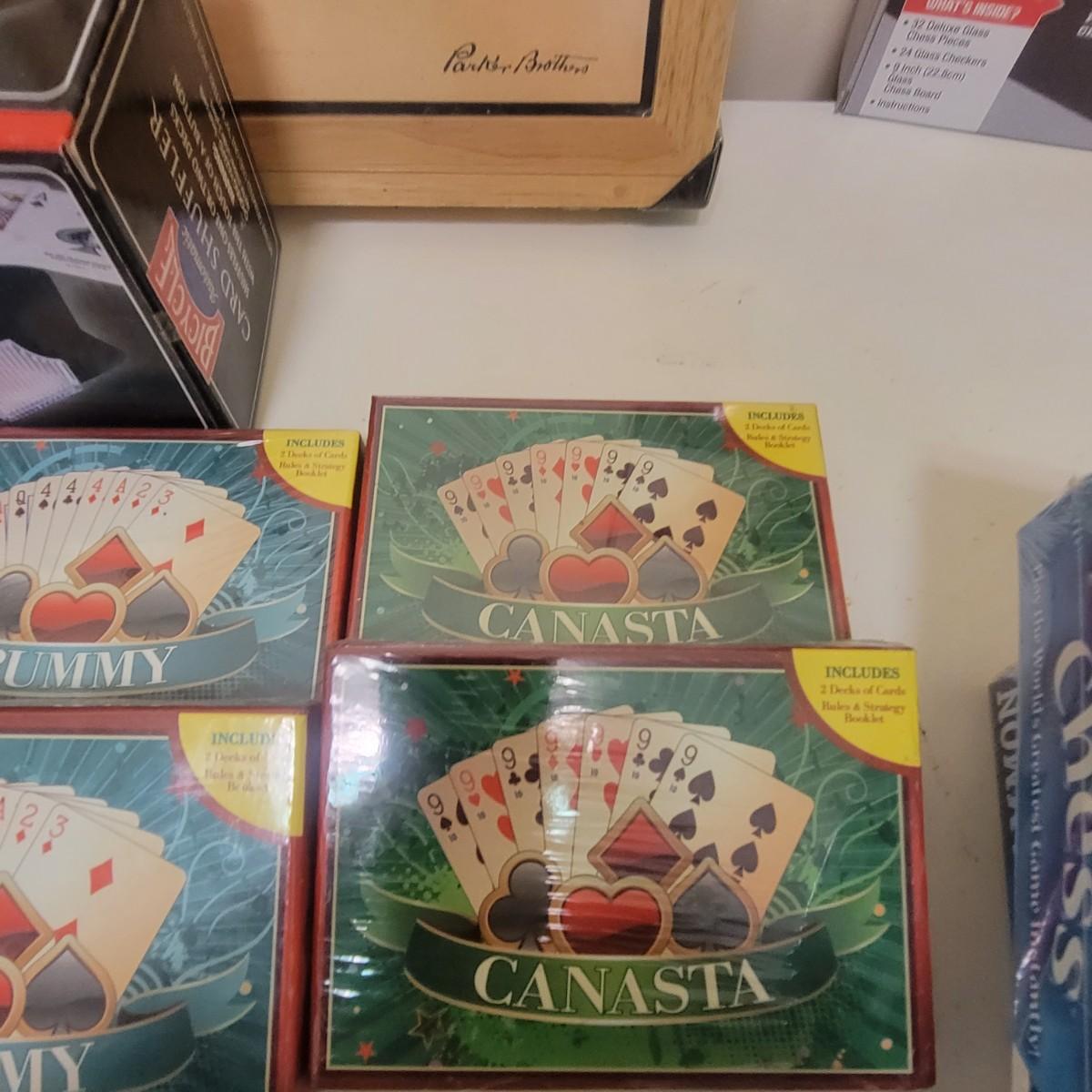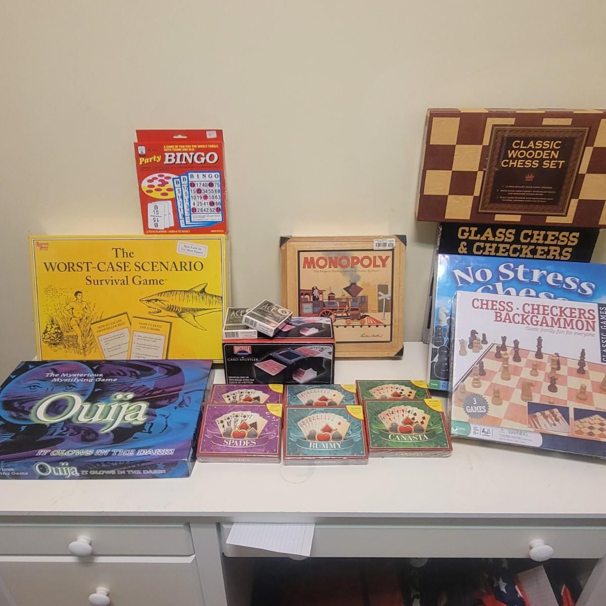 This fun lot includes four different chess sets, a unique Monopoly game in a wooden box, and a glow in the dark Ouija board. Also included is a card shuffler 14 decks of cards, Scrabble, Fib Nib, and more! Local pickup only