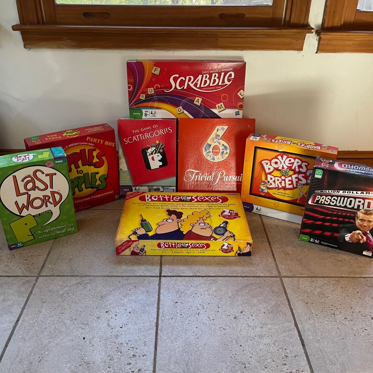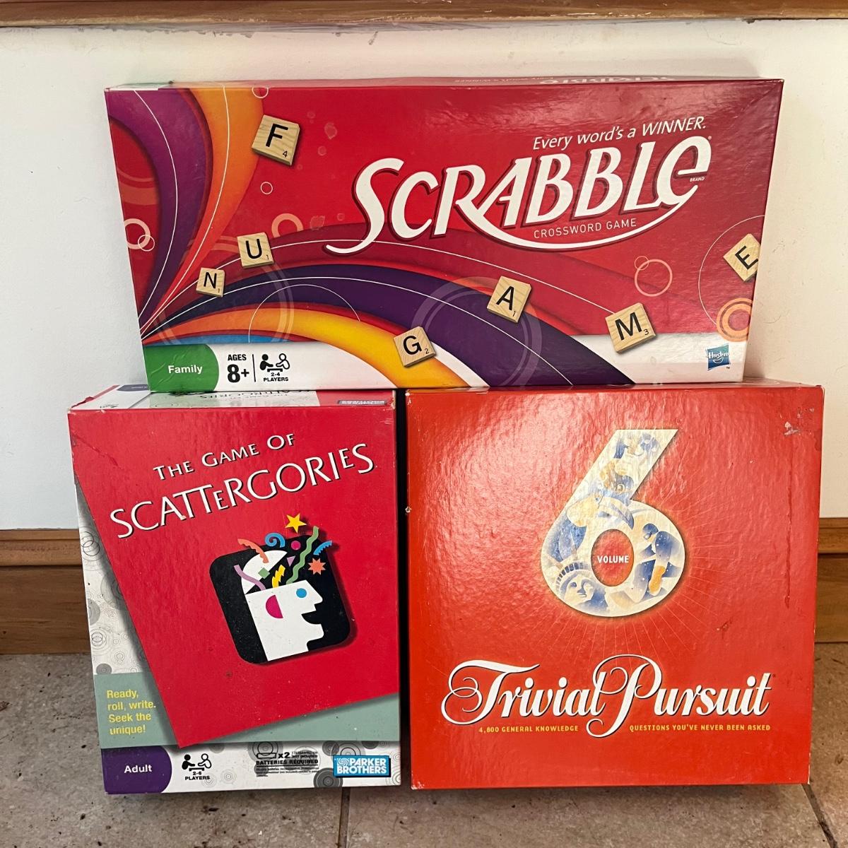 An array of board games here that includes Trivial Pursuit, Scrabble, Scattergories, Apples to Apples, Last Word and more.