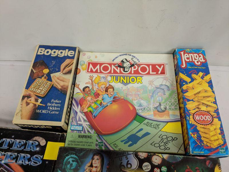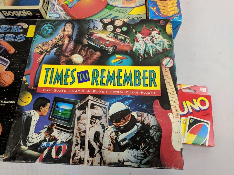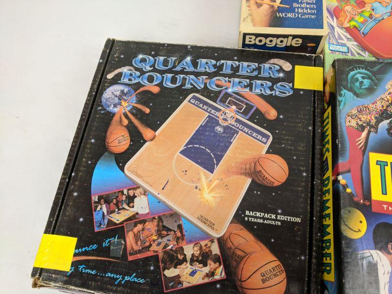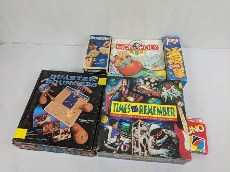 Board Games, Jenga, Boggle, Uno, Times to Remember, Quarter Bouncers