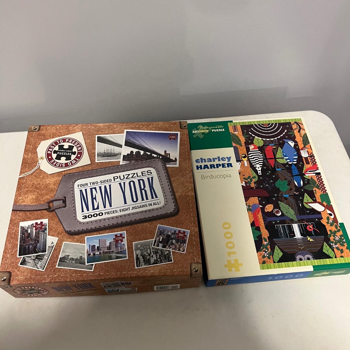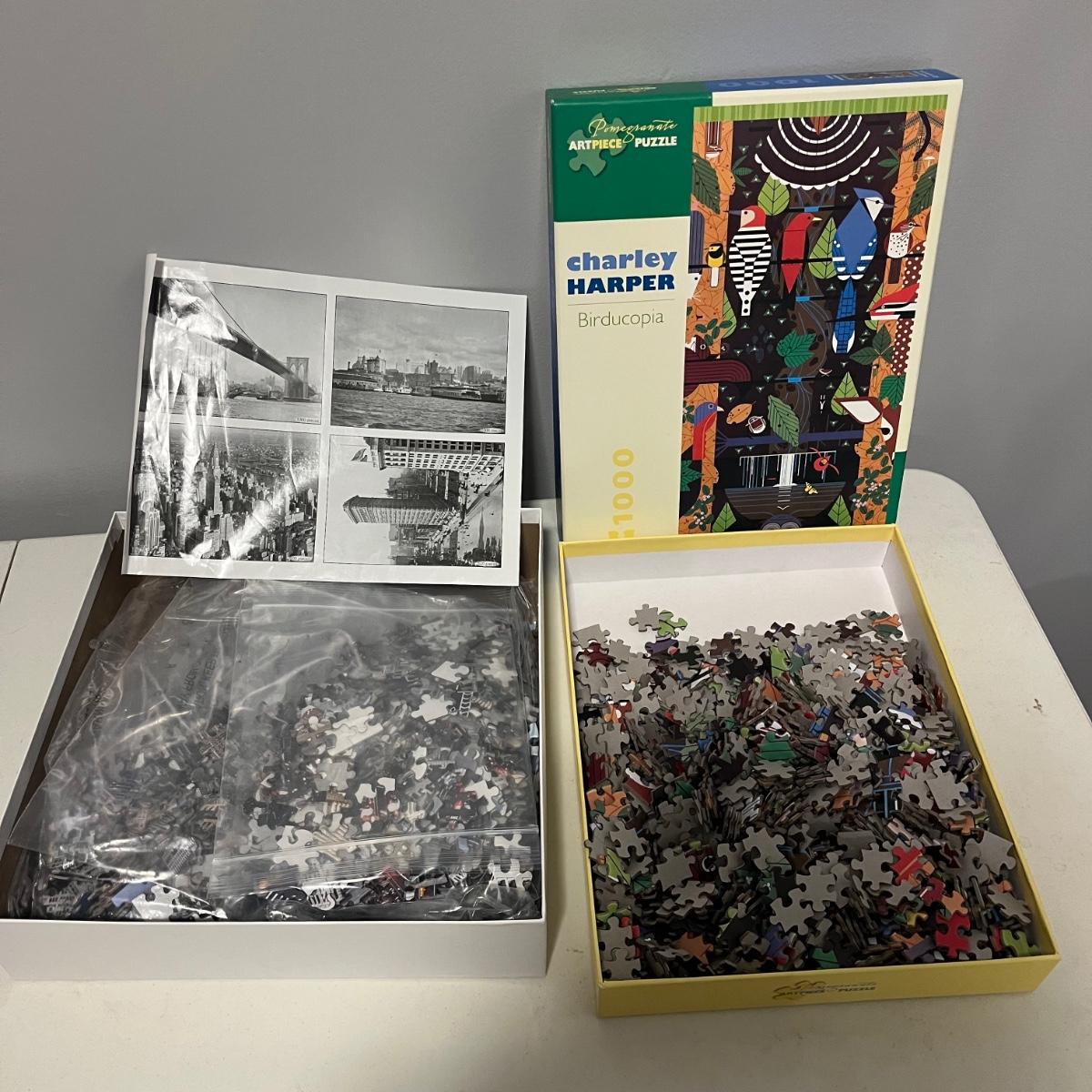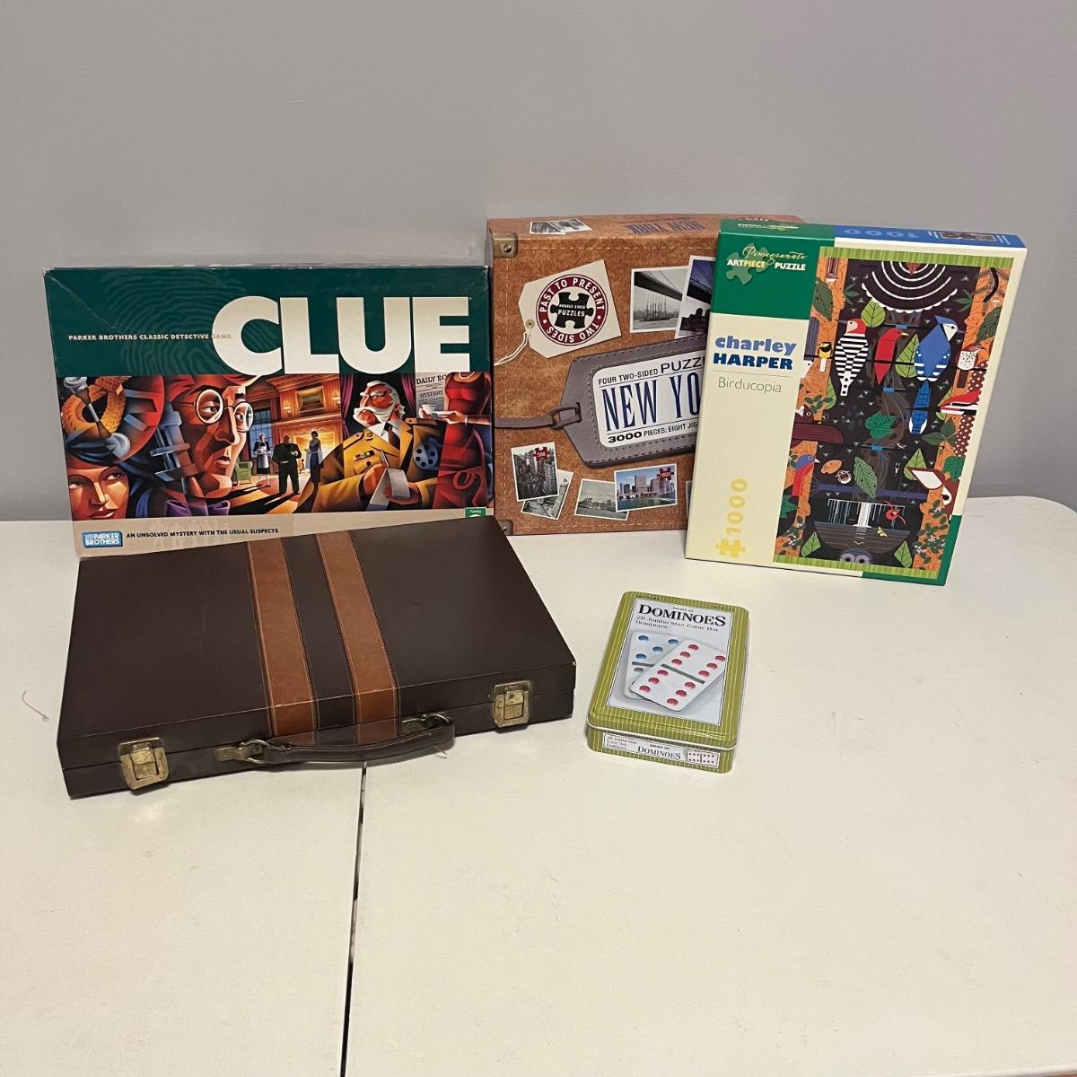 Lot includes Clue, Dominos, two sided puzzles, Charley Harper Puzzle and a backgammon set. We cannot guarantee that all pieces are present.