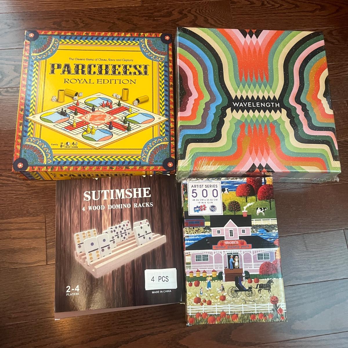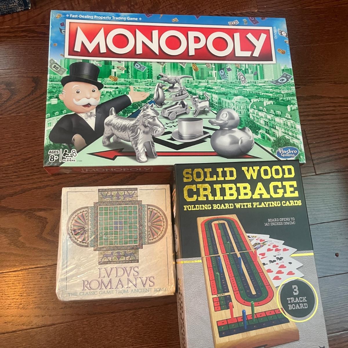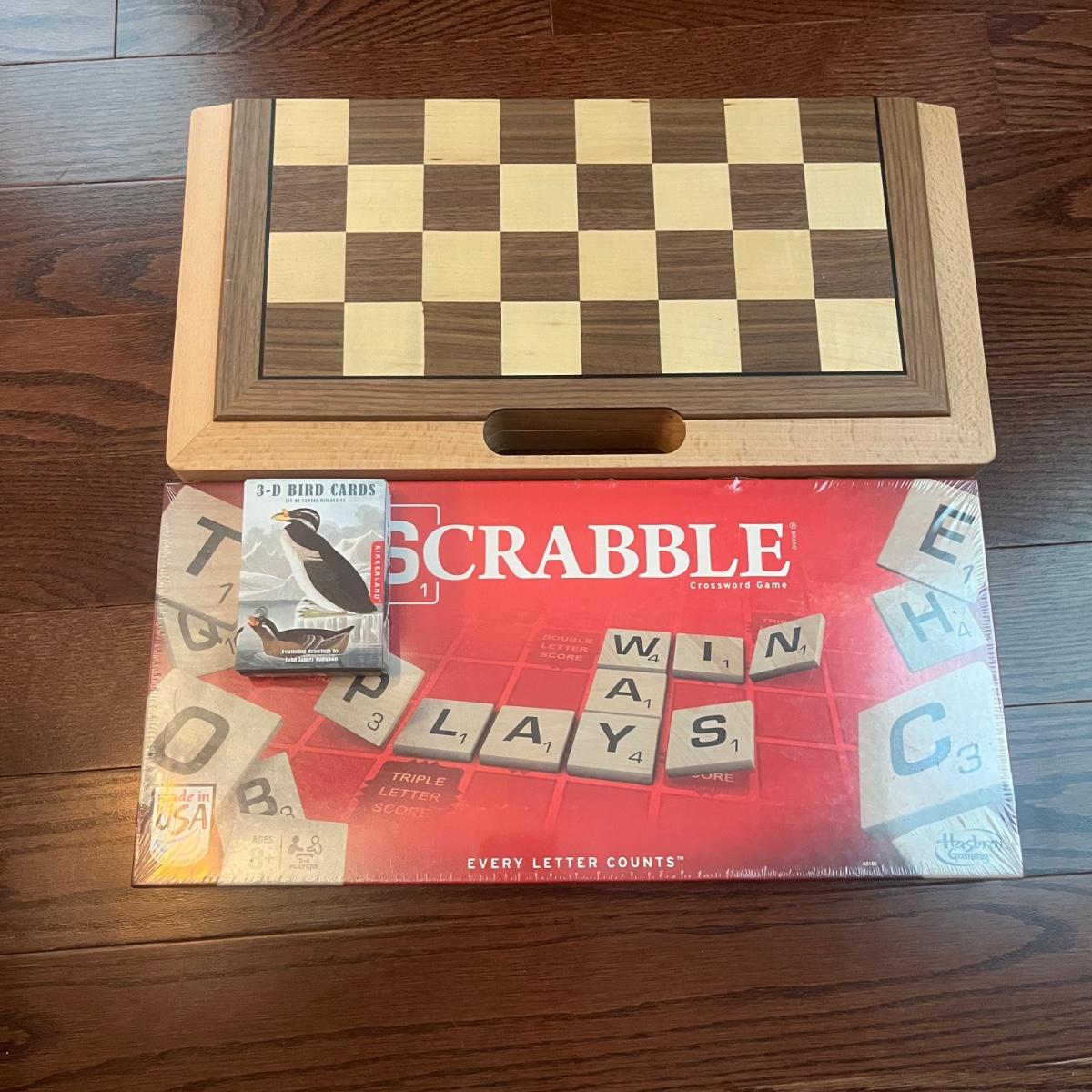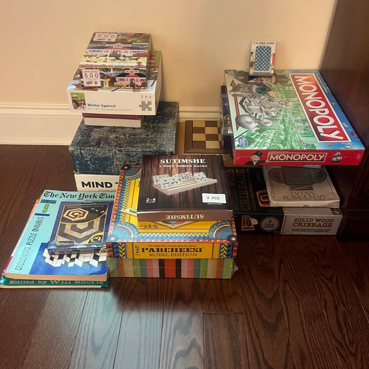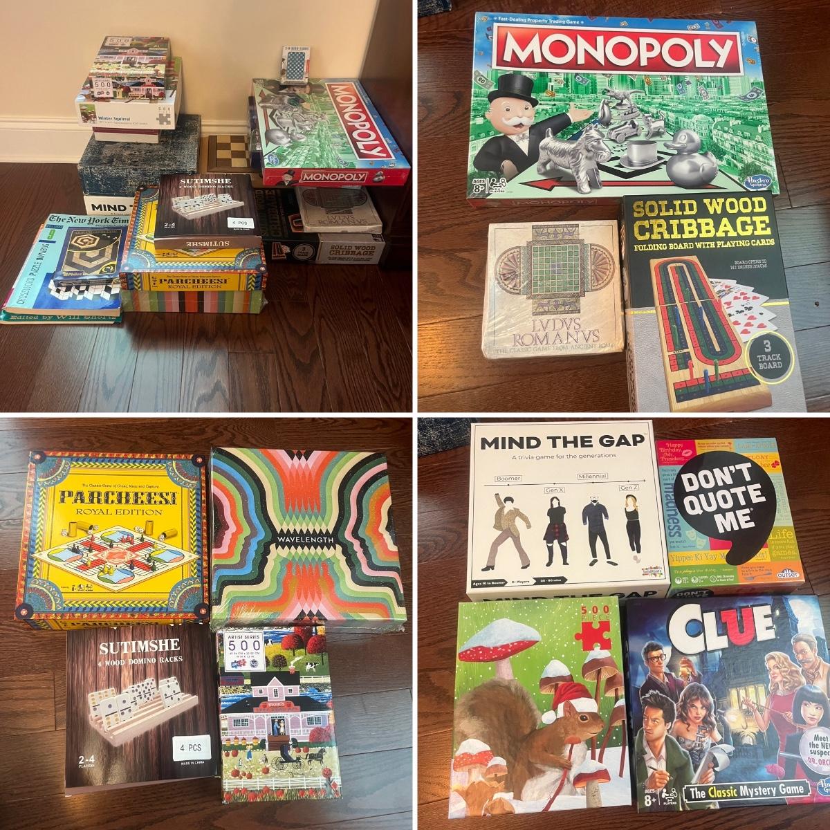 This collection of board games includes Monopoly, Parcheesi, Scrabble, Trivial Pursuit, Cribbage, folding wooden chess board with backgammon inside, puzzles and more.