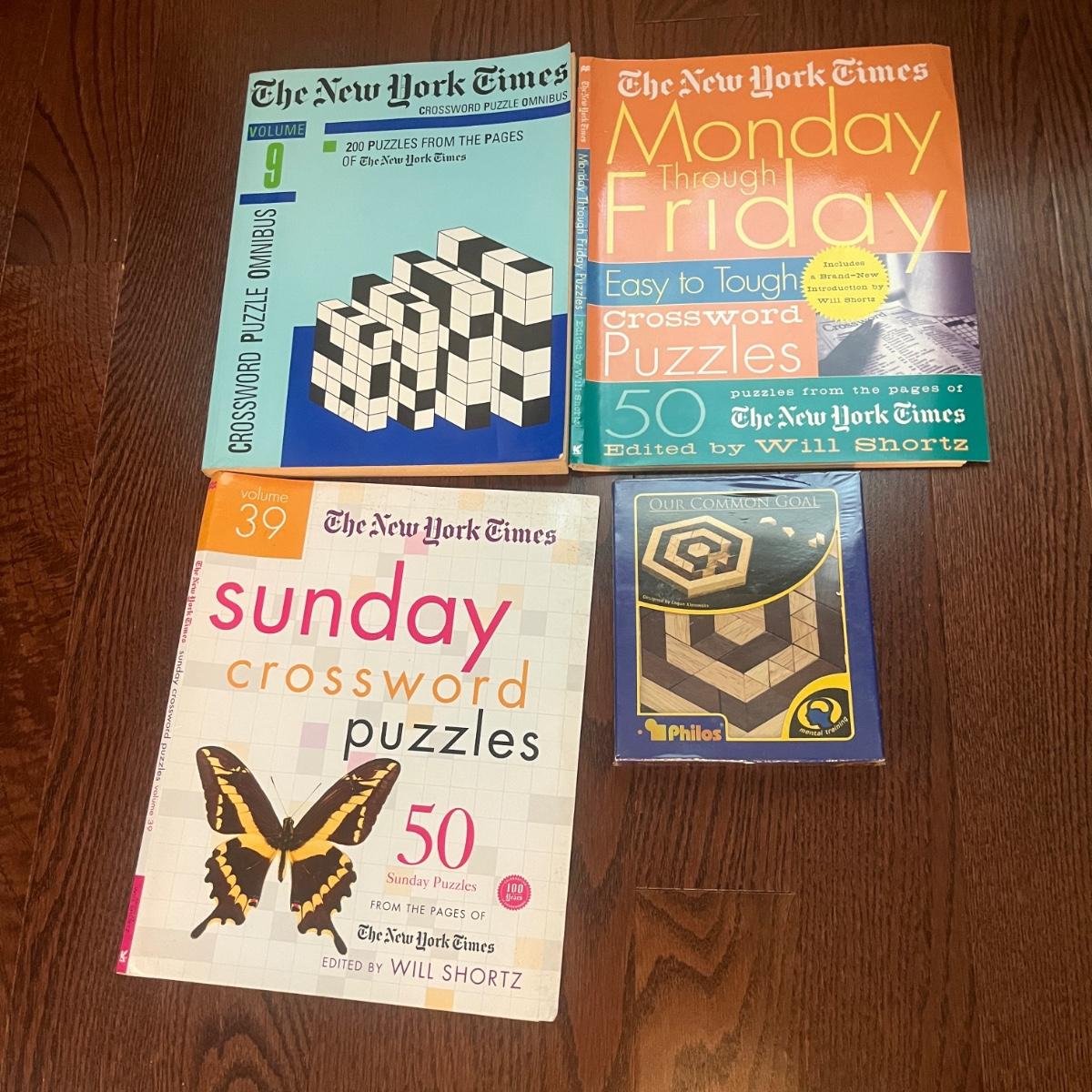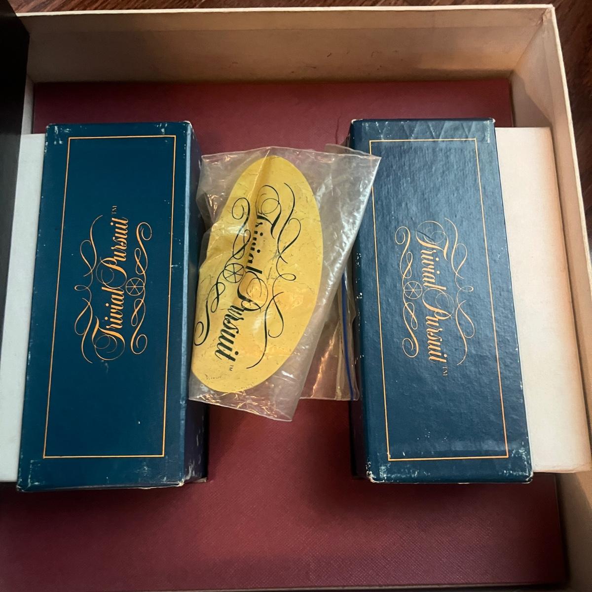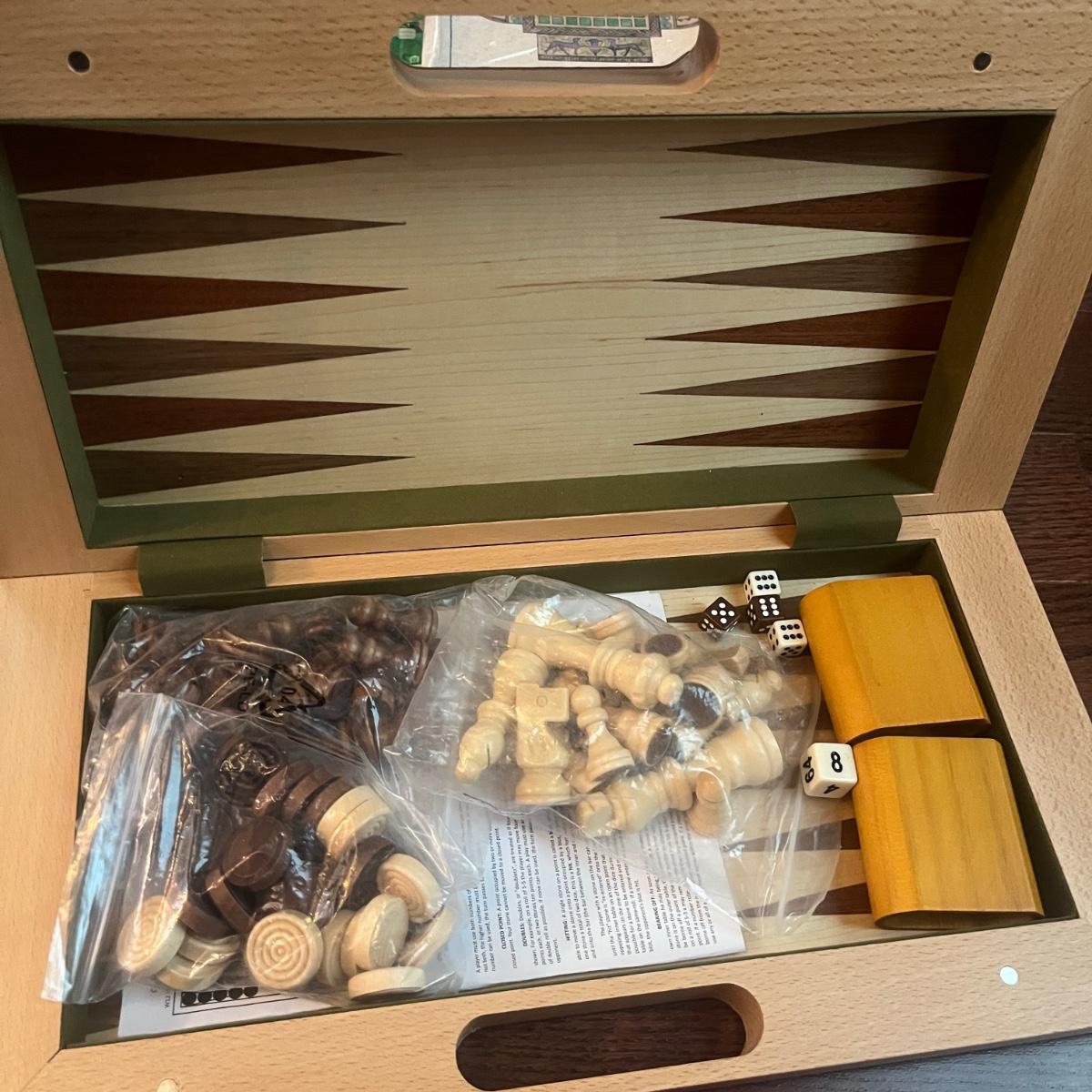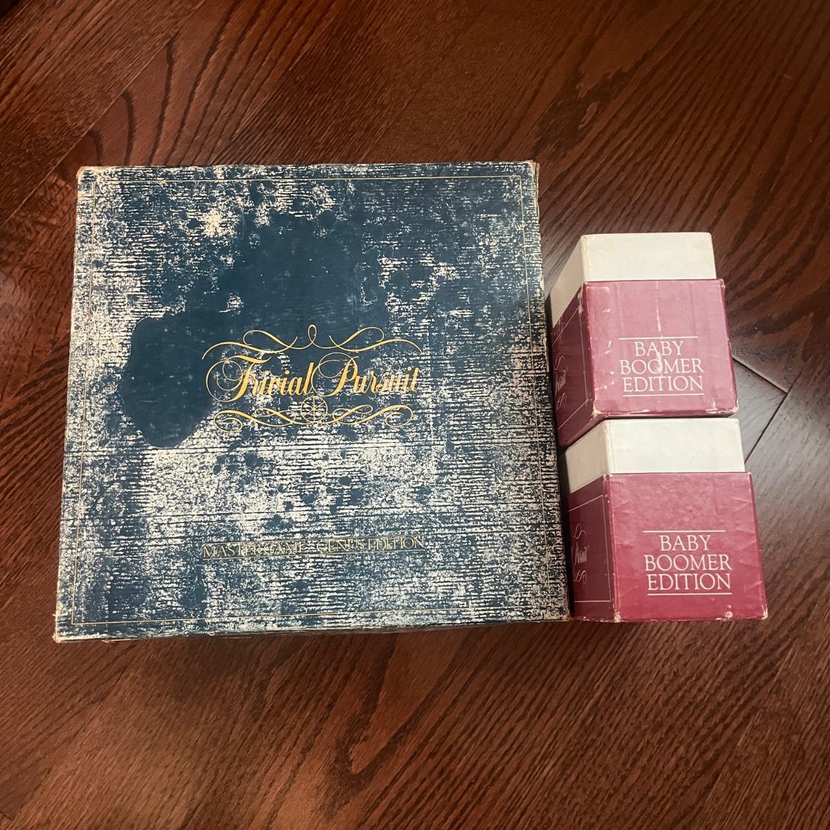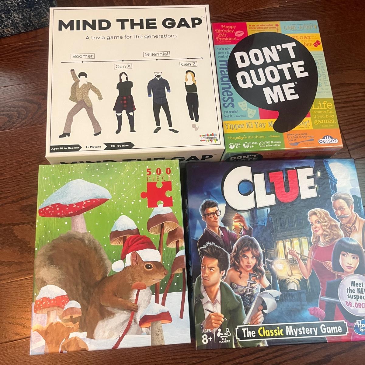 This collection of board games includes Monopoly, Parcheesi, Scrabble, Trivial Pursuit, Cribbage, folding wooden chess board with backgammon inside, puzzles and more.