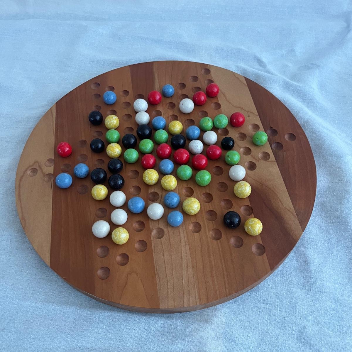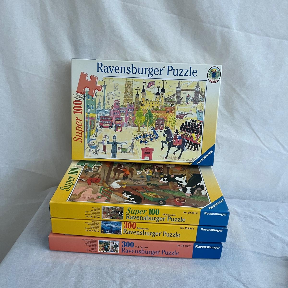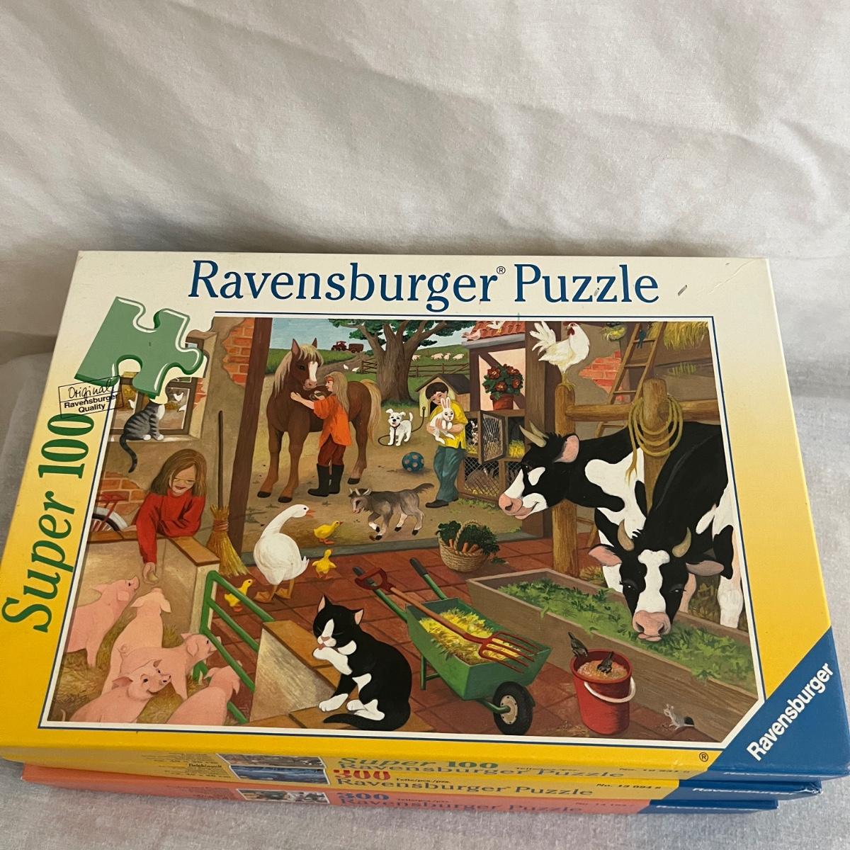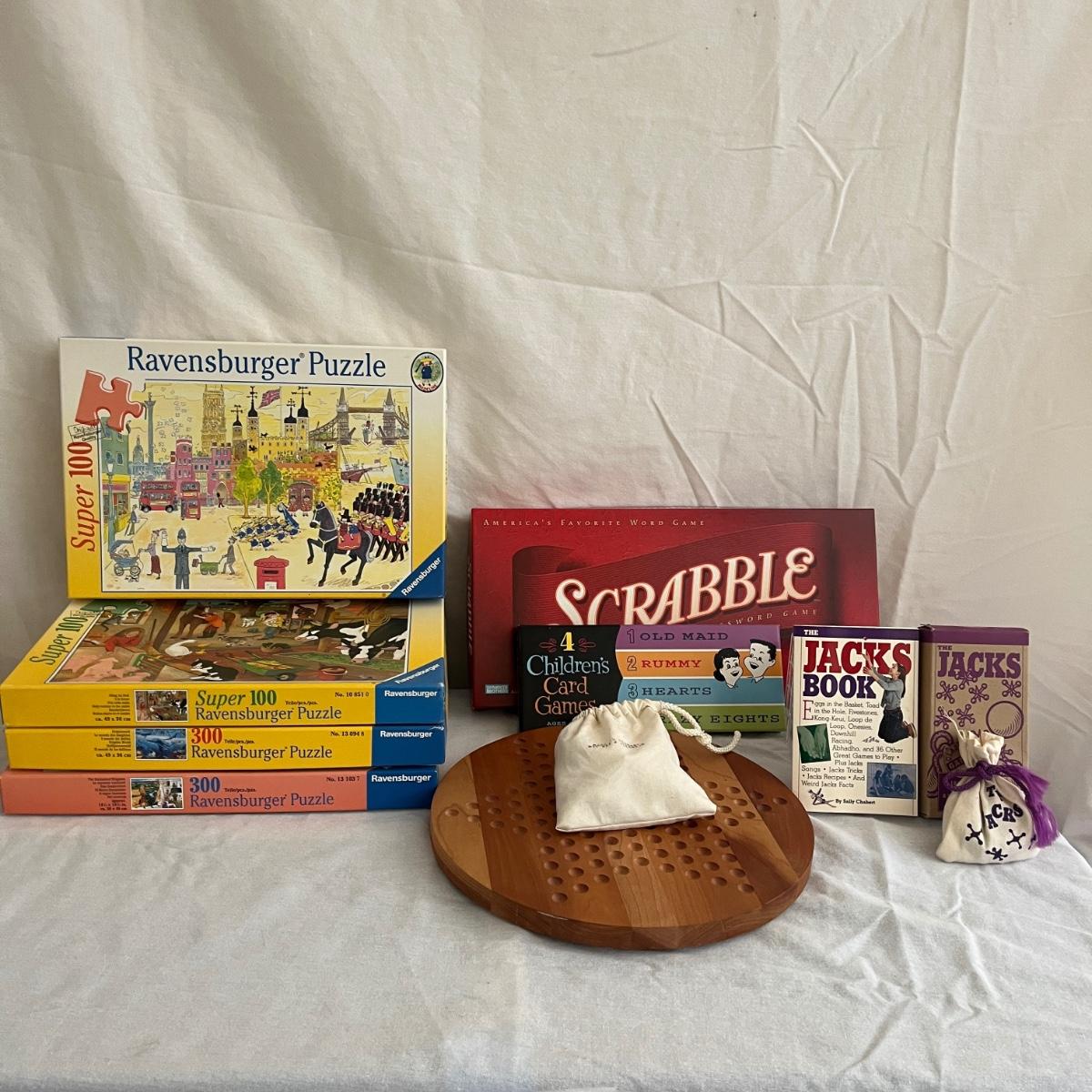 Lot includes Scrabble, four Ravensburger puzzles, wooden chinese Checker board, children’s card games, Milton Bradley cube game and jacks game and book. Chinese checker board measures 12”D. We cannot guarantee that all pieces are present.
