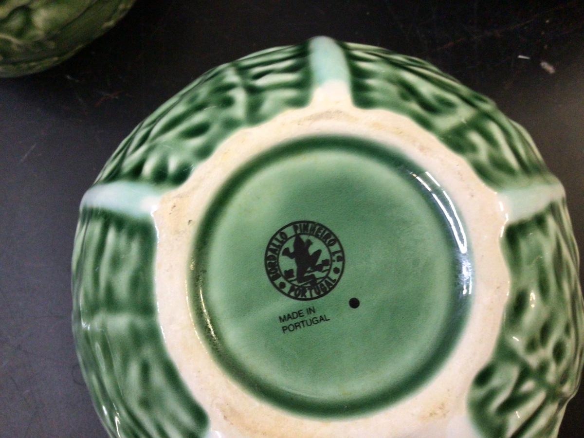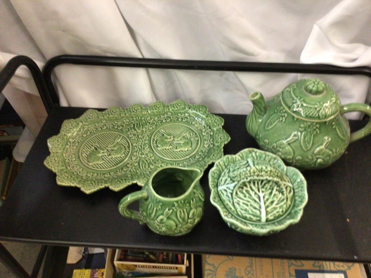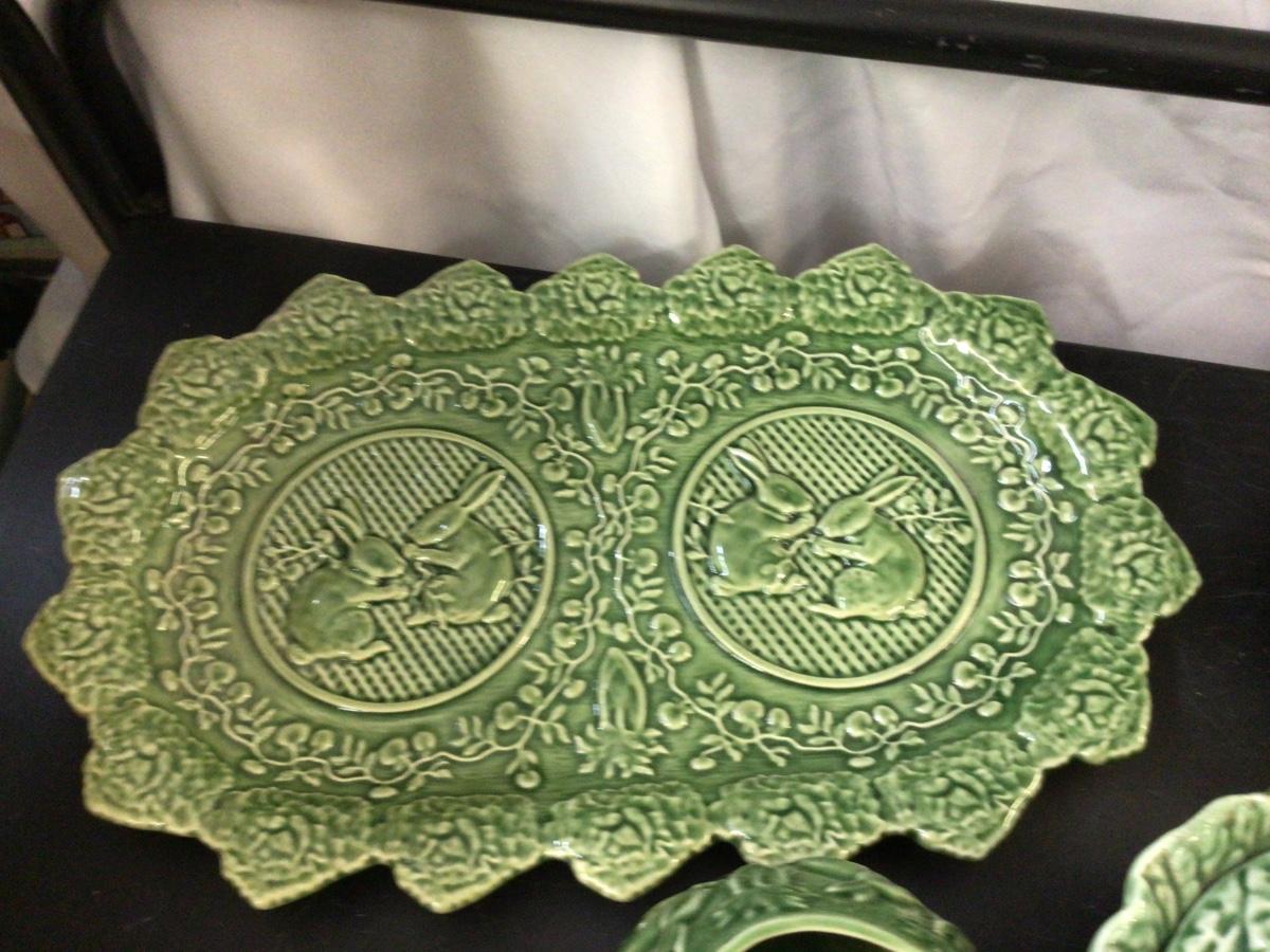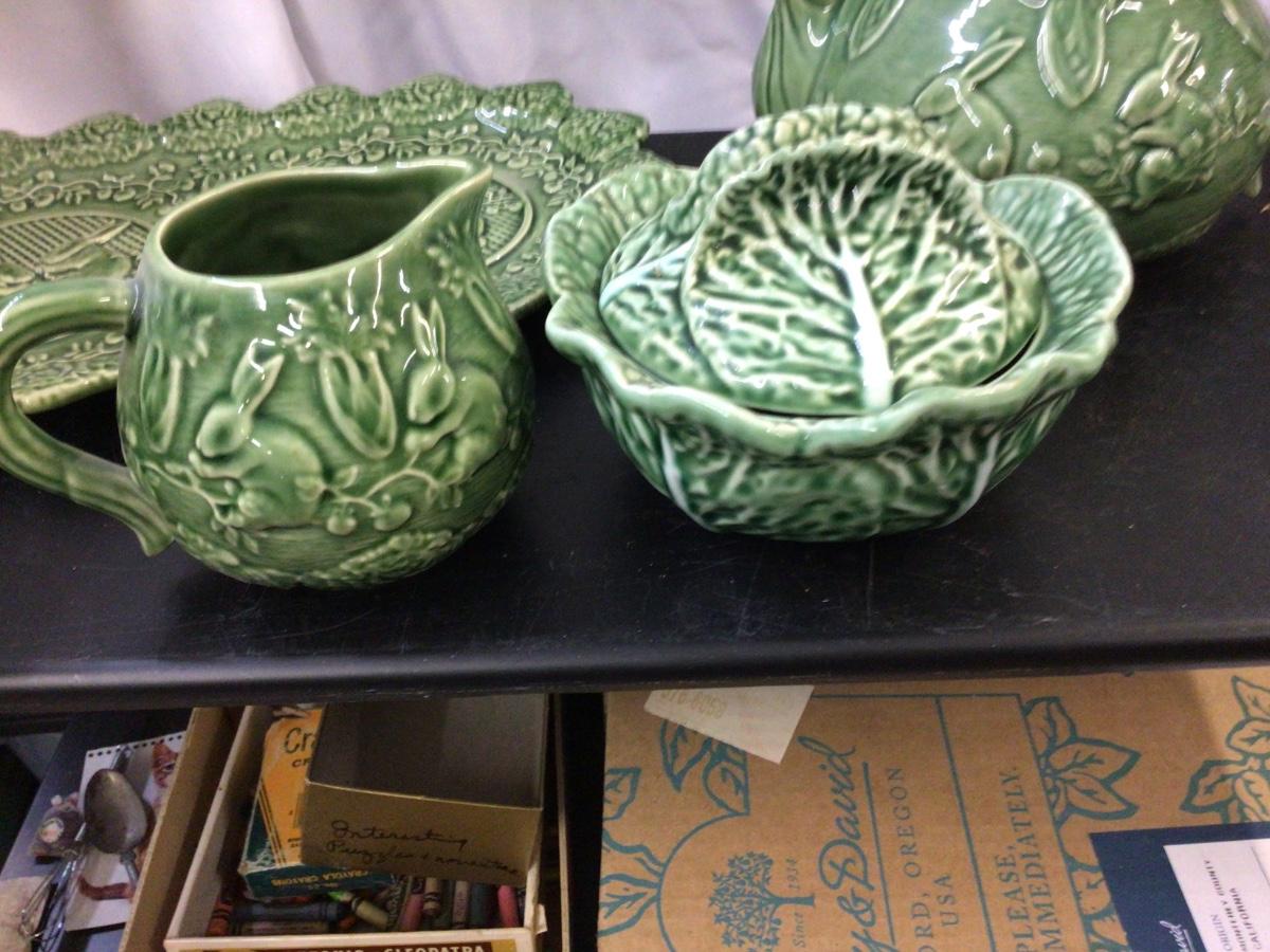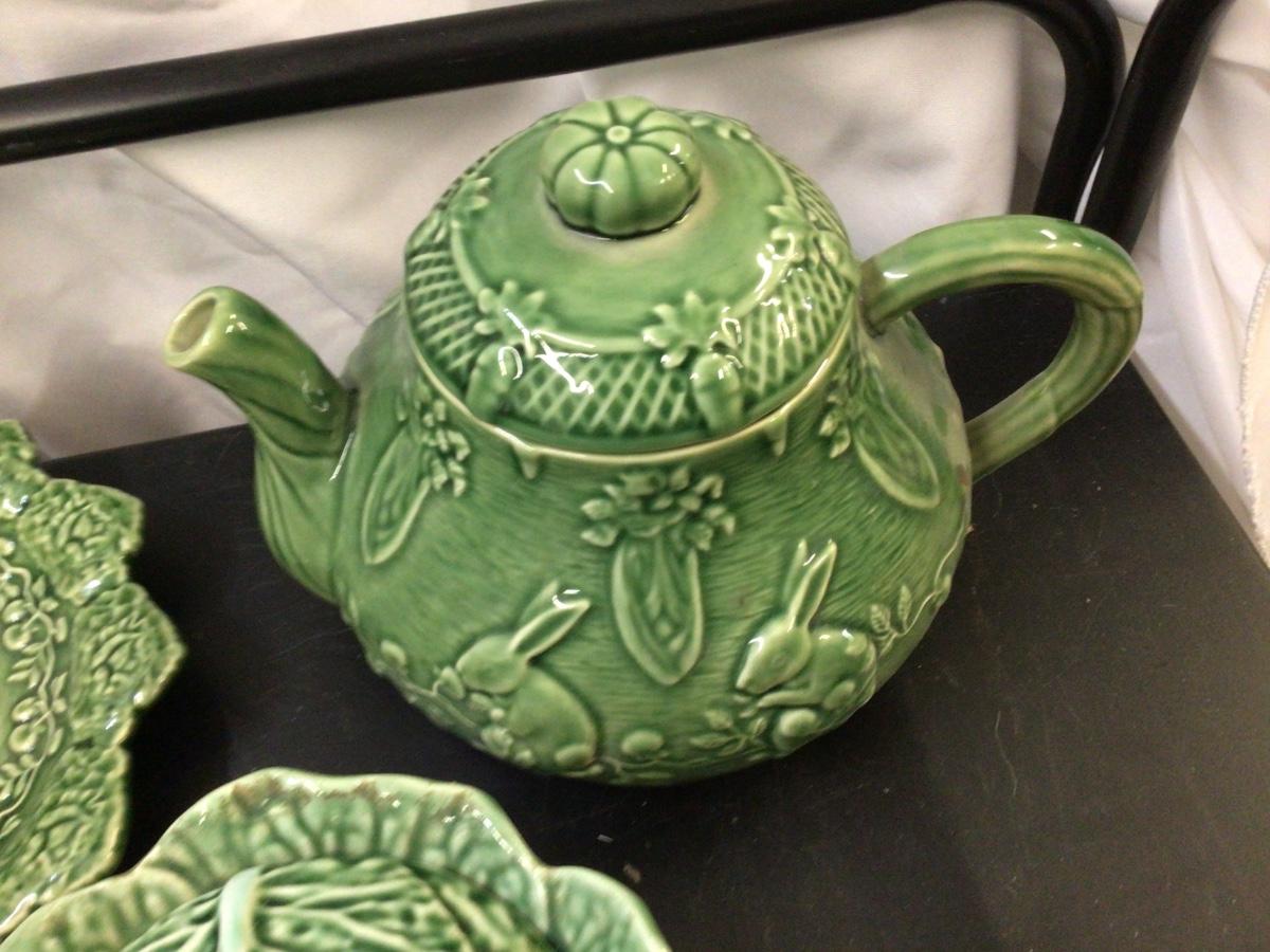 You get Boardallo Pinneiro Portugal dishes. There is tea pot, cream and sugar, and a nice oval tray. They all have design is bunny’s on leaves. All in good condition all have makers mark stamped on bottom.
