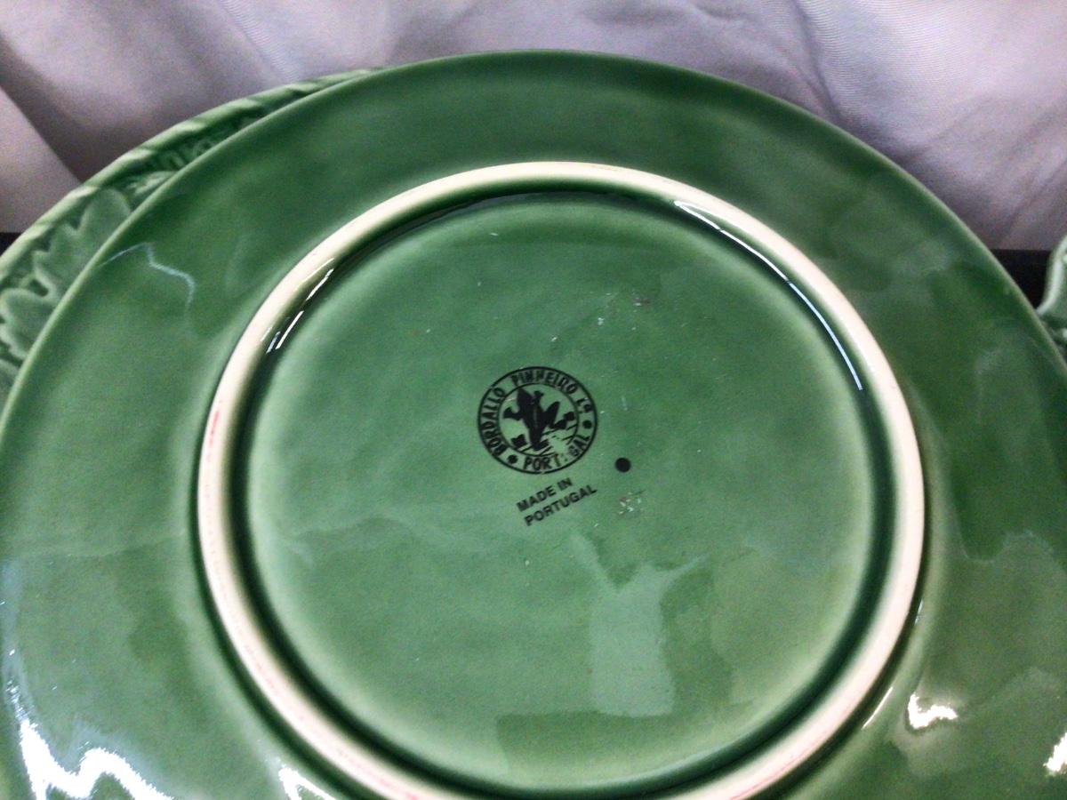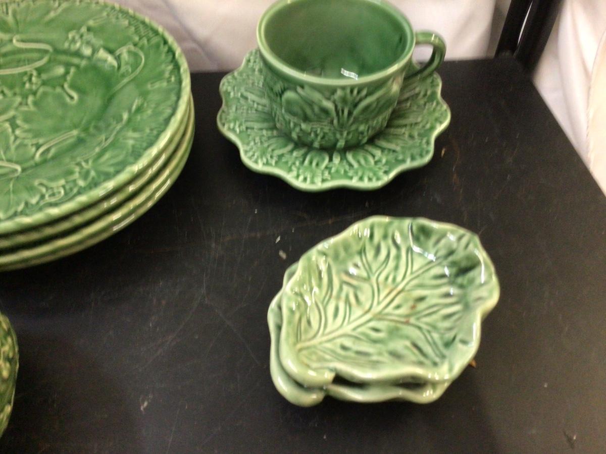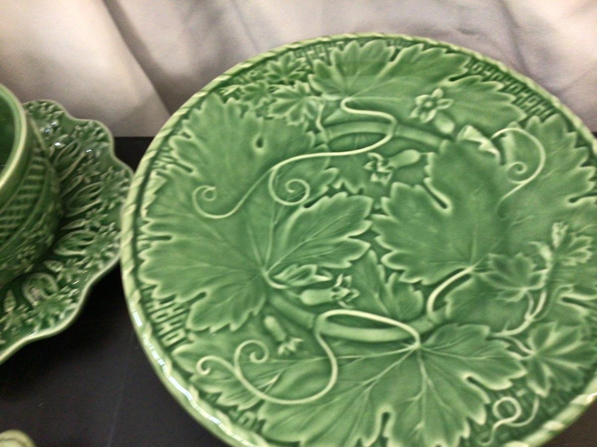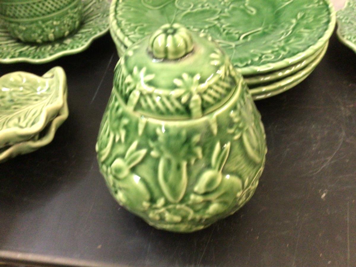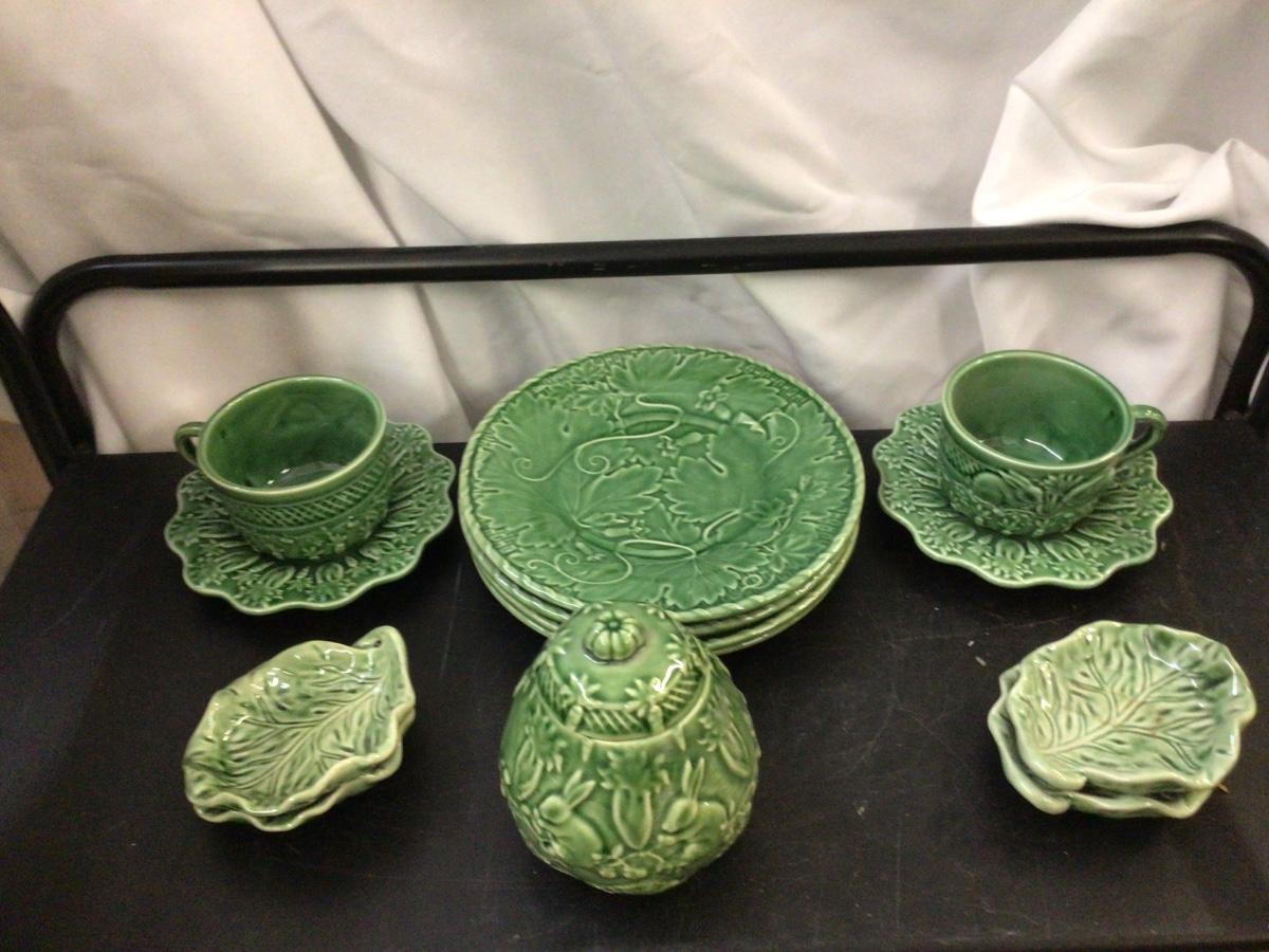 You get Boardallo Pinneiro Portugal dinnerware set. There are 4 dinner plates, 4 small trays, 2 cups and saucers, and honey jar with lid. They all have the maker stamps. On the bottom. All in good condition with nice bunny’s on leaves design.