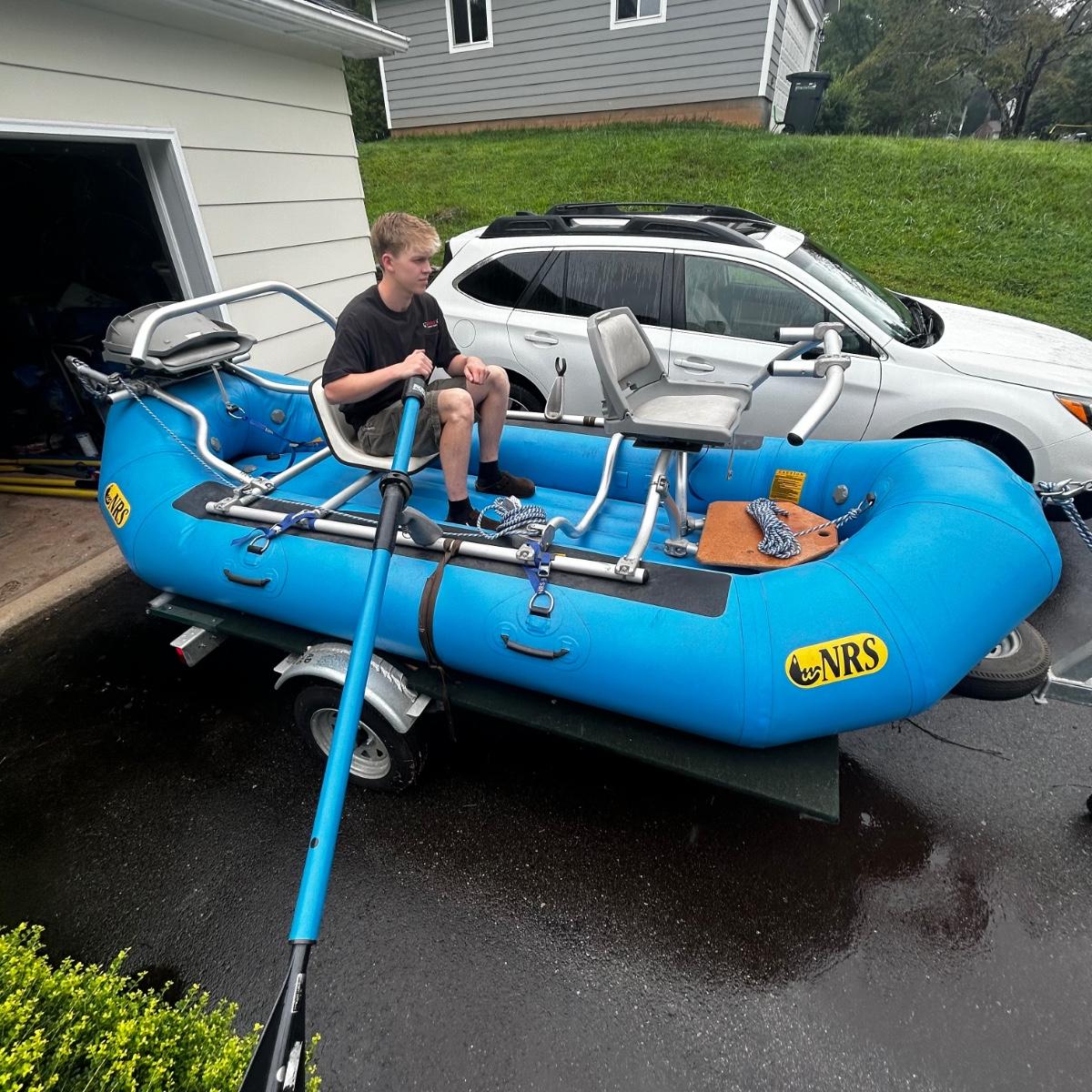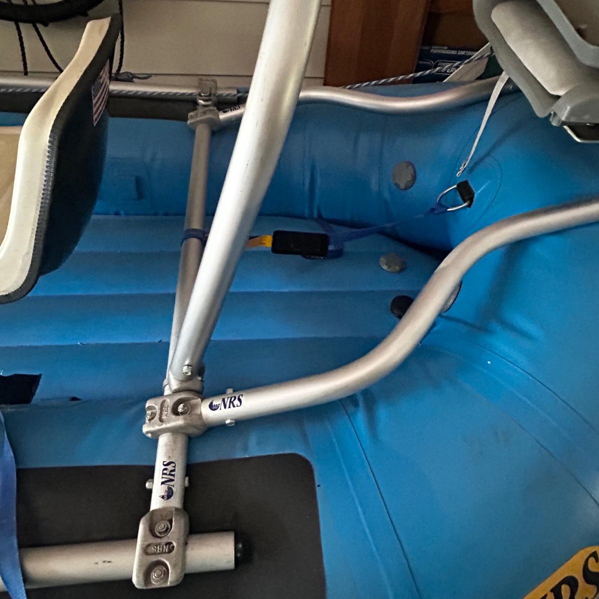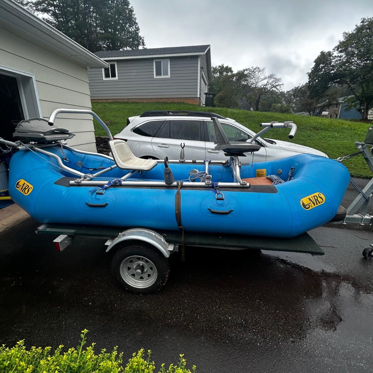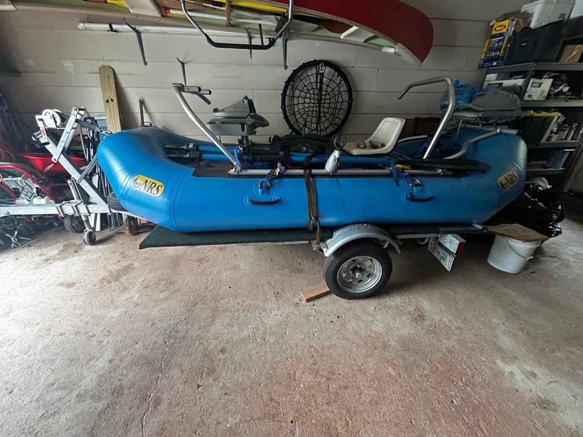 2001 NRS Giant Slalom Sport boat 1035 bought new and used that season and only once in 2024. Unit has been garage kept. Boat inflated with no leaks is self bailing. Has frame for fishing, three seats, with replacement beam to replace back fishing seat if desired. Two blue ores with sleeves and counter balances, three yellow ores also included. All have removable paddles. One NRS rescue rope bag, Leafield pressure gauge, repair kit, NRS hand pump, pair of shorter ore mounts alternatives. There are two thwarts for white water use if frame is removed (only four straps holding in place). Raft comes with titled Road King boat trailer that has been modified to have a carpeted plywood mount and 2.5" roller bearing to make for easy one person load and unload. Full unit measurement is with boat on trailer is 17'x78"