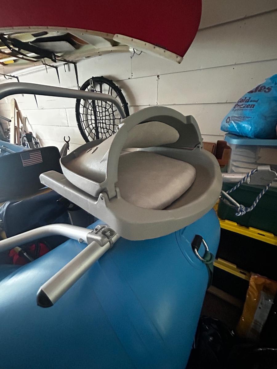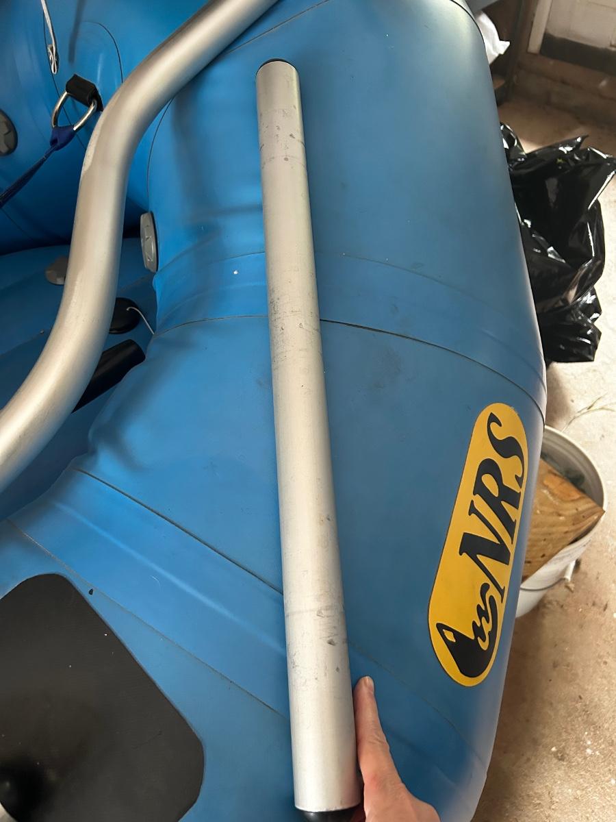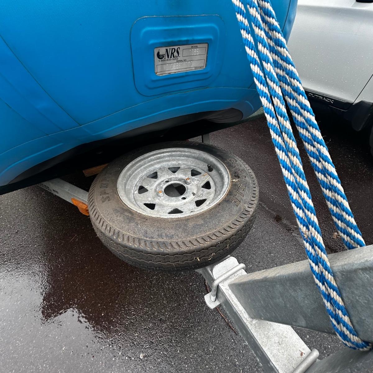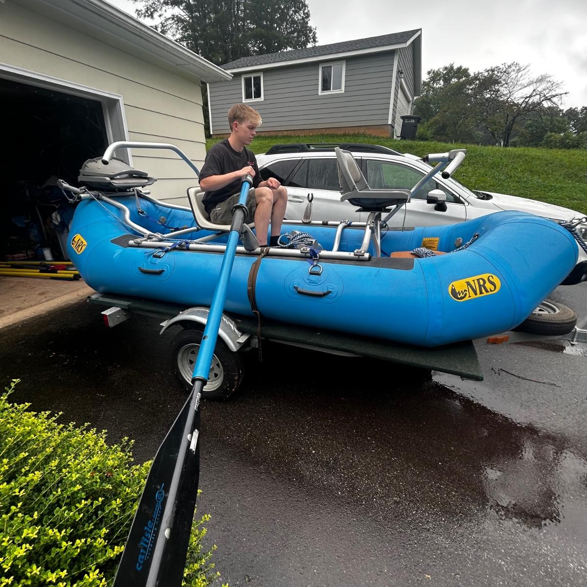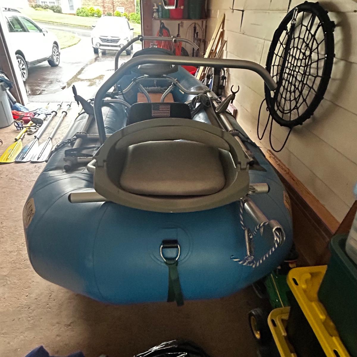 2001 NRS Giant Slalom Sport boat 1035 bought new and used that season and only once in 2024. Unit has been garage kept. Boat inflated with no leaks is self bailing. Has frame for fishing, three seats, with replacement beam to replace back fishing seat if desired. Two blue ores with sleeves and counter balances, three yellow ores also included. All have removable paddles. One NRS rescue rope bag, Leafield pressure gauge, repair kit, NRS hand pump, pair of shorter ore mounts alternatives. There are two thwarts for white water use if frame is removed (only four straps holding in place). Raft comes with titled Road King boat trailer that has been modified to have a carpeted plywood mount and 2.5" roller bearing to make for easy one person load and unload. Full unit measurement is with boat on trailer is 17'x78"