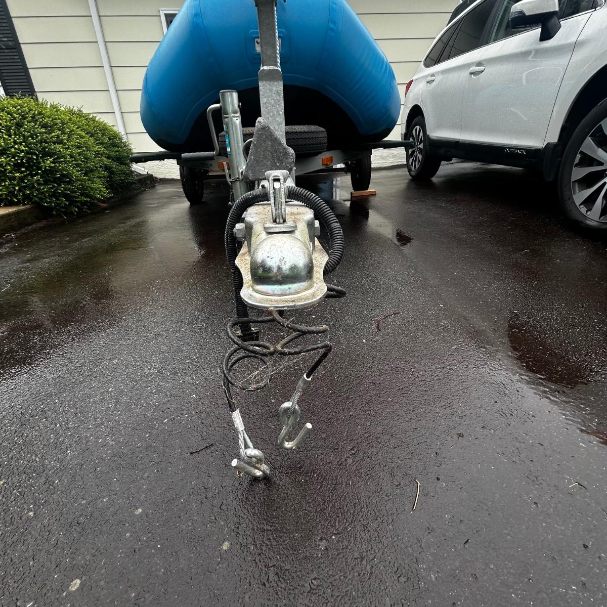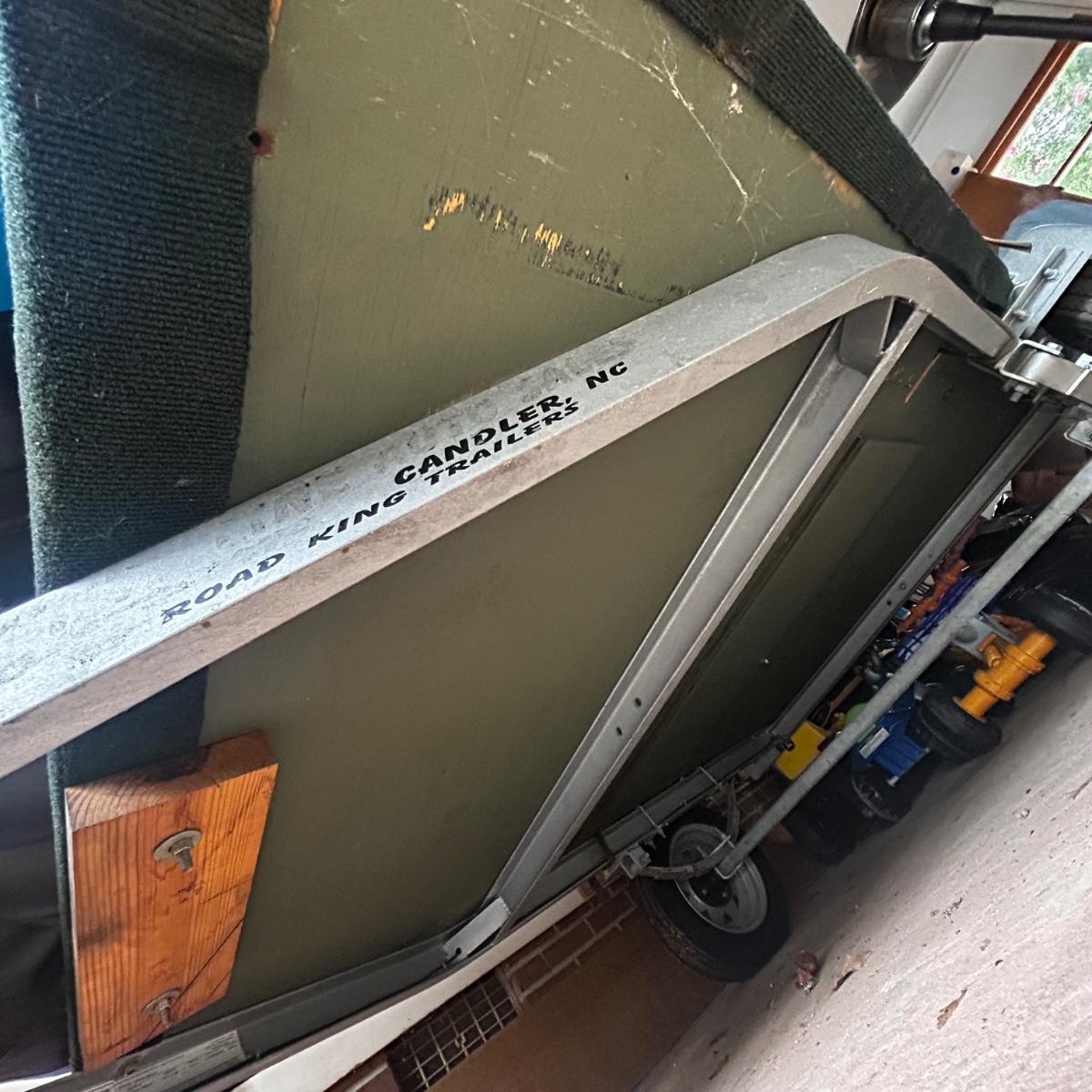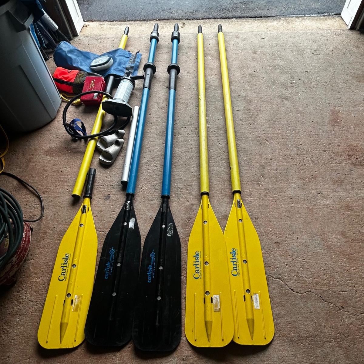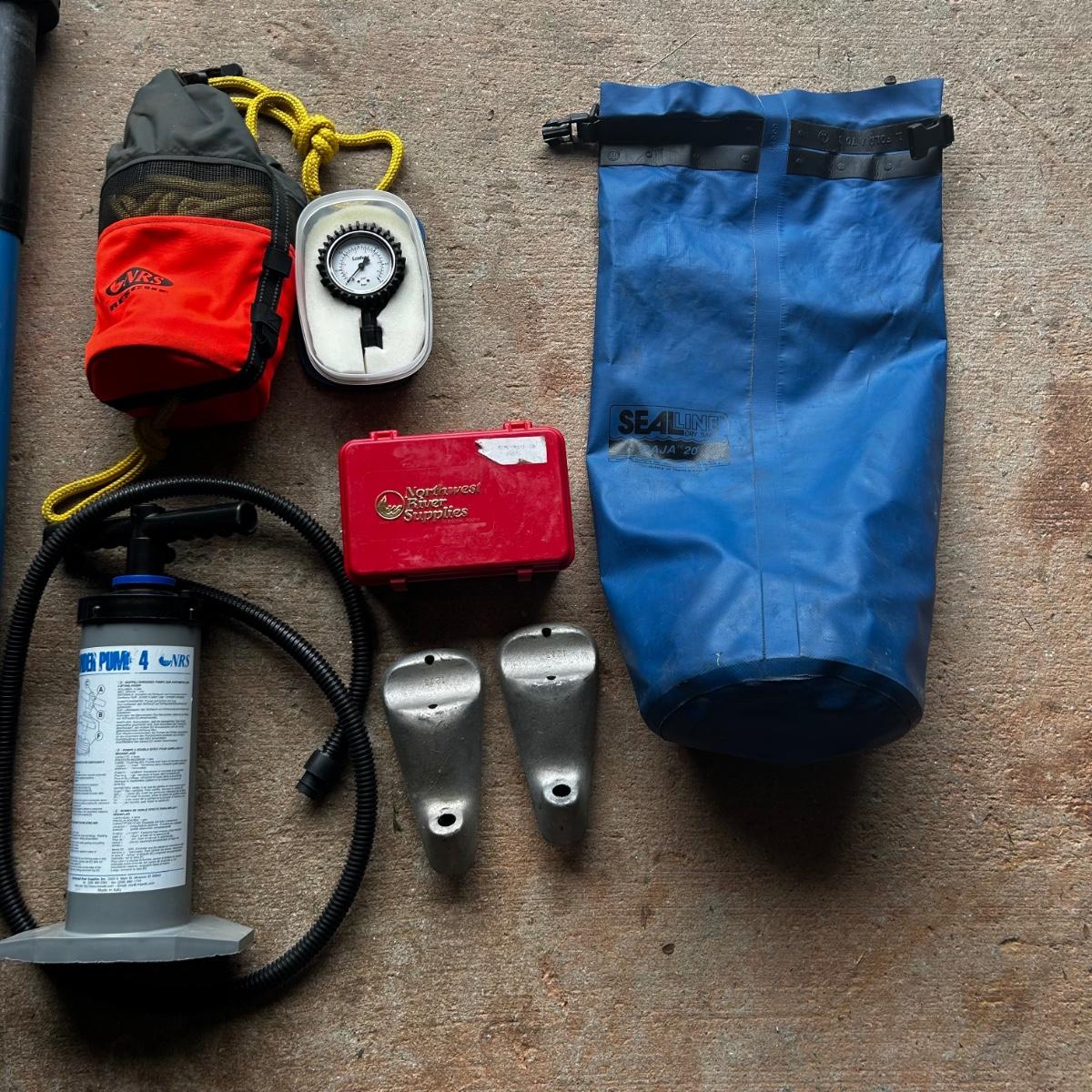 2001 NRS Giant Slalom Sport boat 1035 bought new and used that season and only once in 2024. Unit has been garage kept. Boat inflated with no leaks is self bailing. Has frame for fishing, three seats, with replacement beam to replace back fishing seat if desired. Two blue ores with sleeves and counter balances, three yellow ores also included. All have removable paddles. One NRS rescue rope bag, Leafield pressure gauge, repair kit, NRS hand pump, pair of shorter ore mounts alternatives. There are two thwarts for white water use if frame is removed (only four straps holding in place). Raft comes with titled Road King boat trailer that has been modified to have a carpeted plywood mount and 2.5" roller bearing to make for easy one person load and unload. Full unit measurement is with boat on trailer is 17'x78"