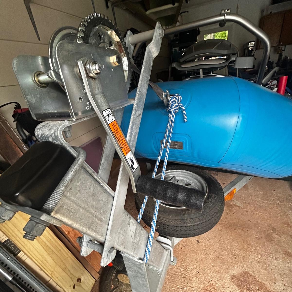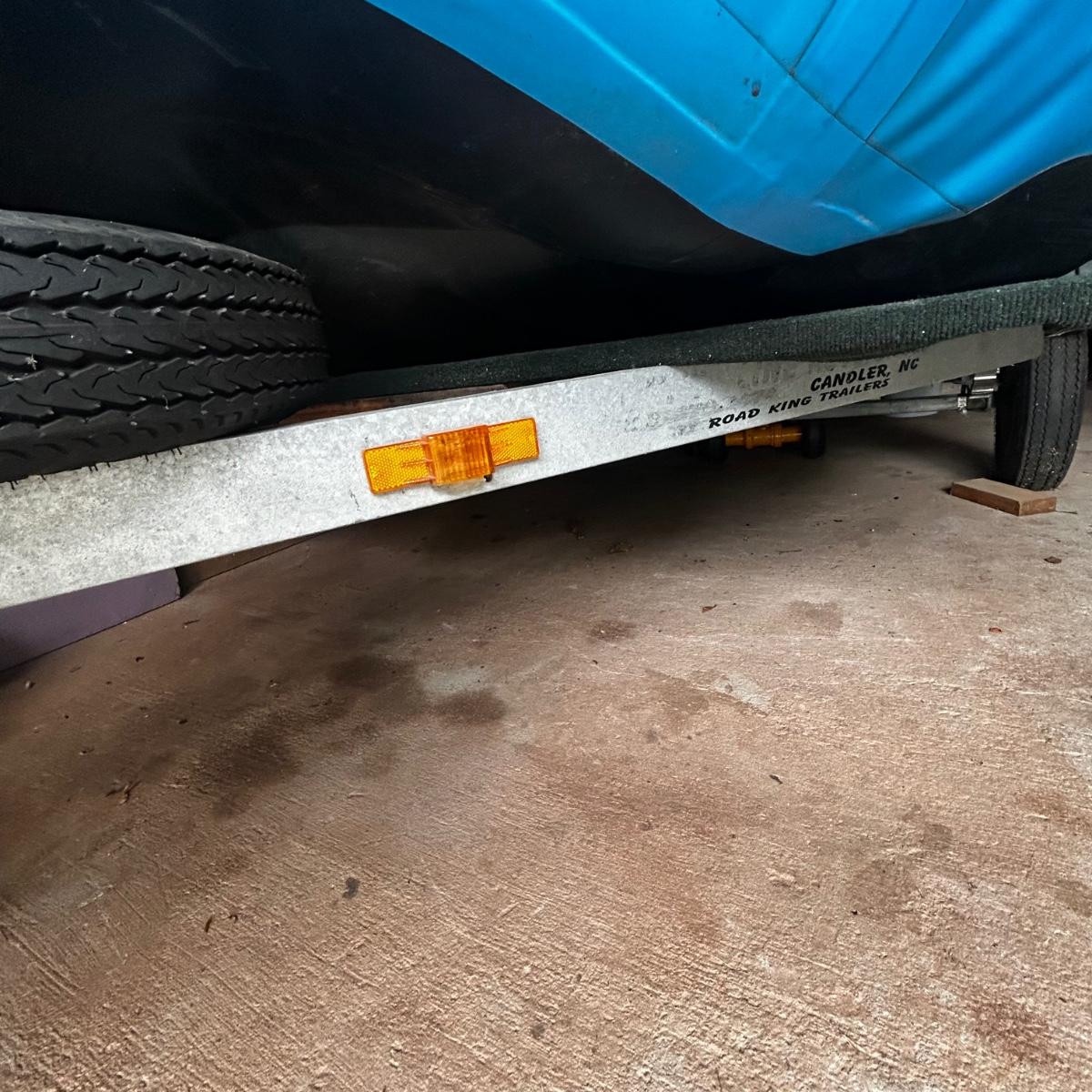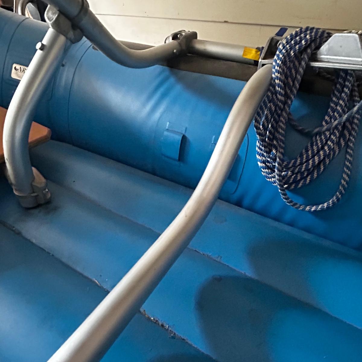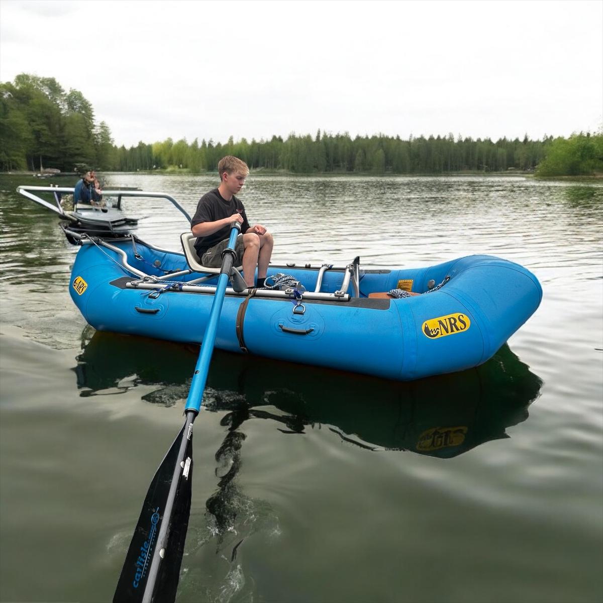 2001 NRS Giant Slalom Sport boat 1035 bought new and used that season and only once in 2024. Unit has been garage kept. Boat inflated with no leaks is self bailing. Has frame for fishing, three seats, with replacement beam to replace back fishing seat if desired. Two blue ores with sleeves and counter balances, three yellow ores also included. All have removable paddles. One NRS rescue rope bag, Leafield pressure gauge, repair kit, NRS hand pump, pair of shorter ore mounts alternatives. There are two thwarts for white water use if frame is removed (only four straps holding in place). Raft comes with titled Road King boat trailer that has been modified to have a carpeted plywood mount and 2.5" roller bearing to make for easy one person load and unload. Full unit measurement is with boat on trailer is 17'x78"