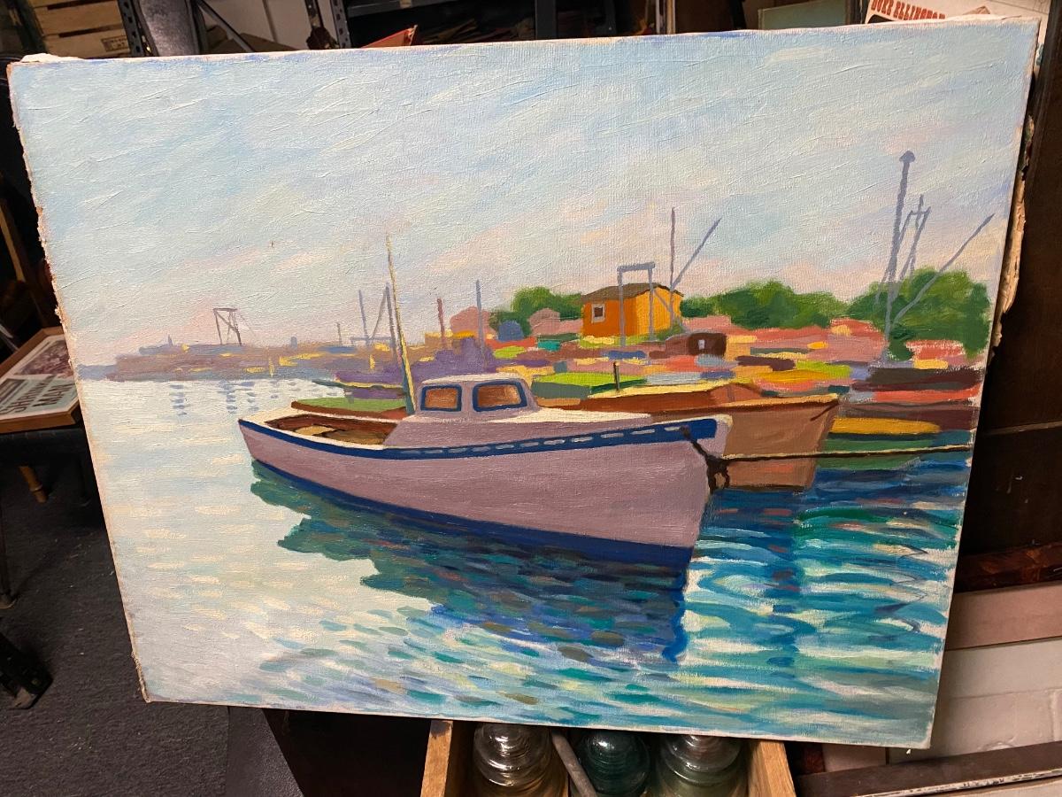 Unframed Boat on the water painting on canvas. Love the lighting! Approx 22" x 28"