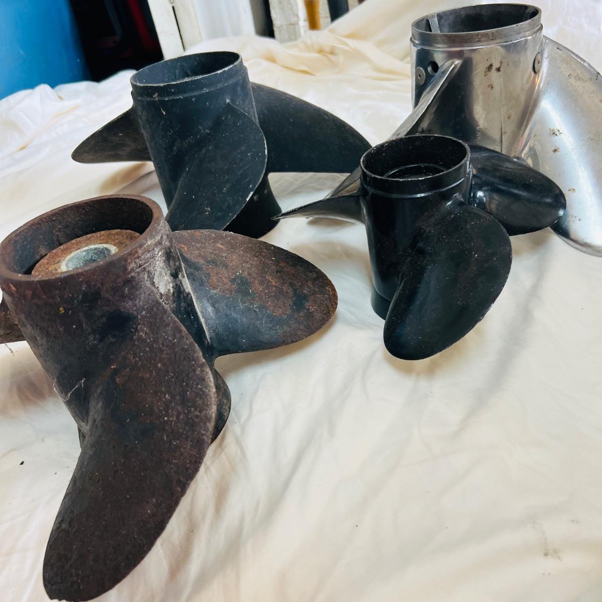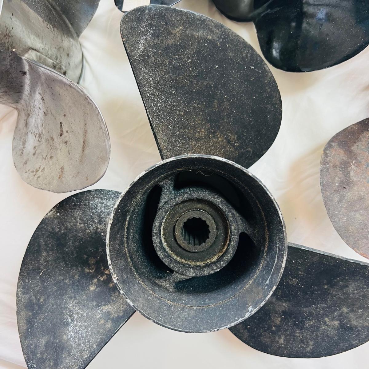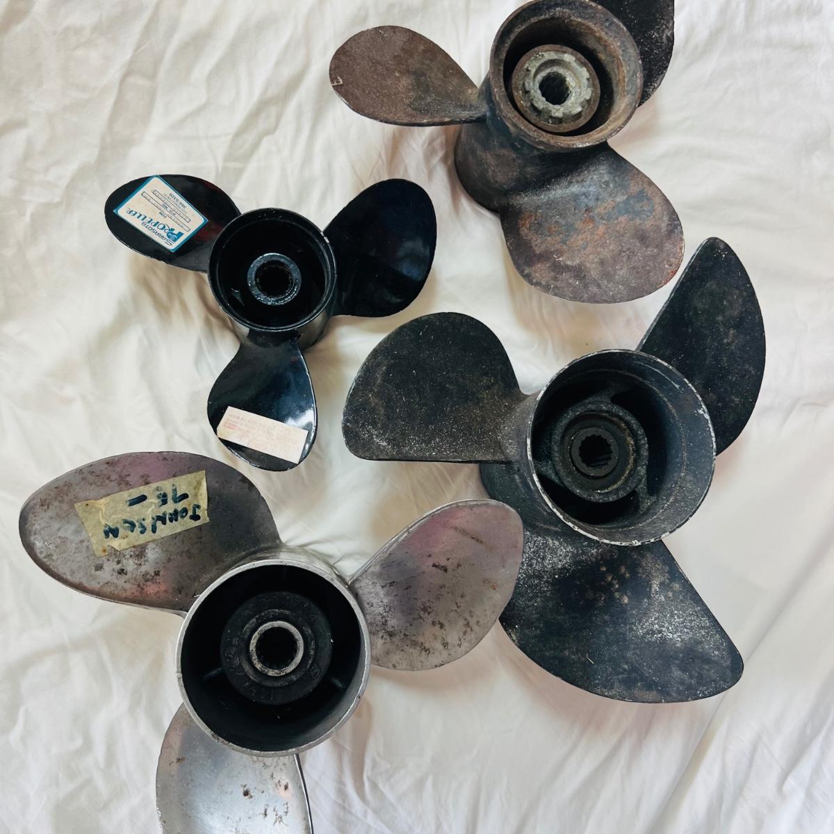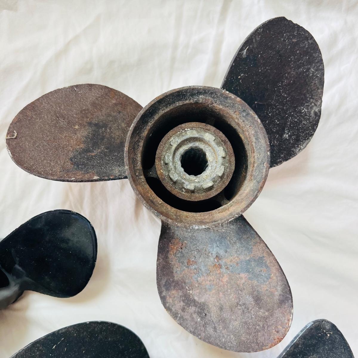 Lot includes four boat props. Largest measures 13”W, small black prop like new and measures 9”W.