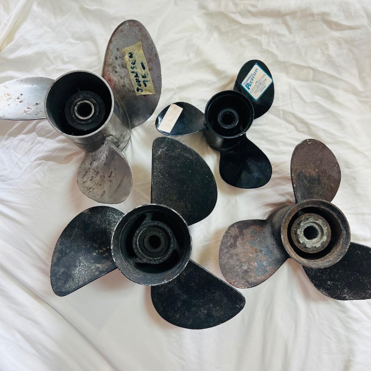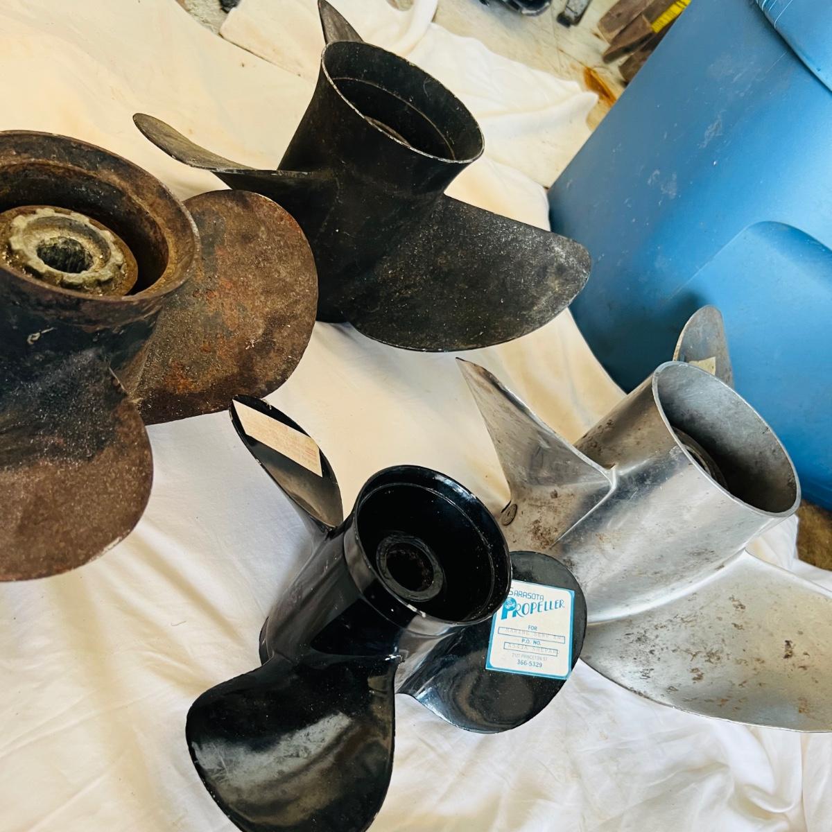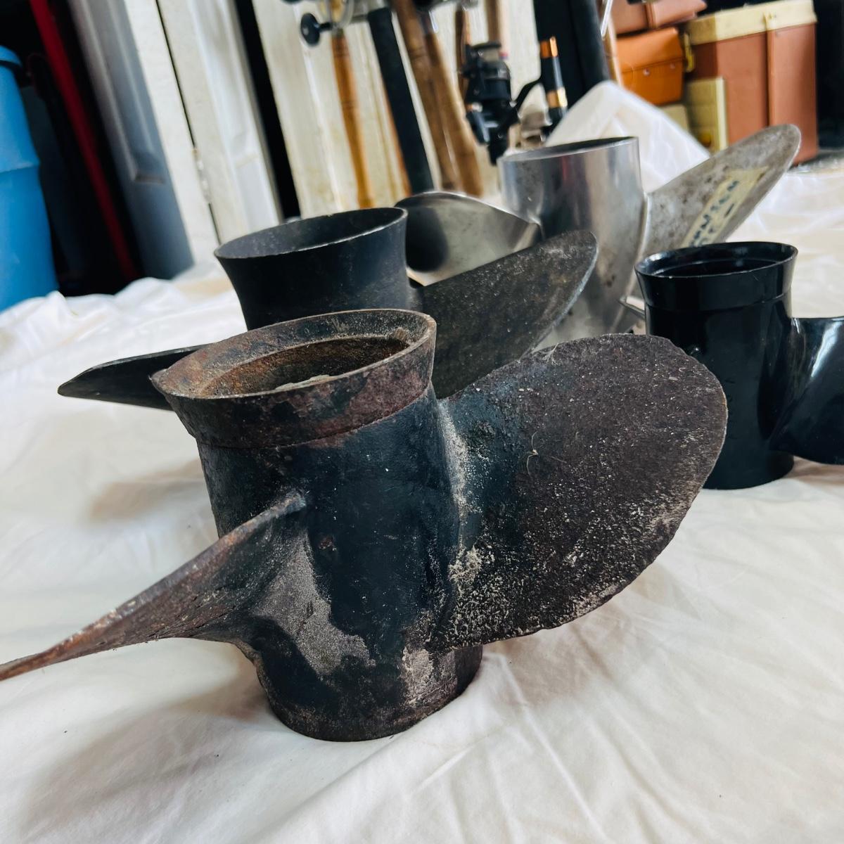 Lot includes four boat props. Largest measures 13”W, small black prop like new and measures 9”W.
