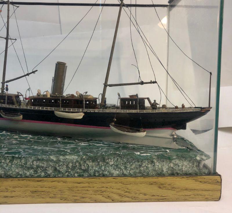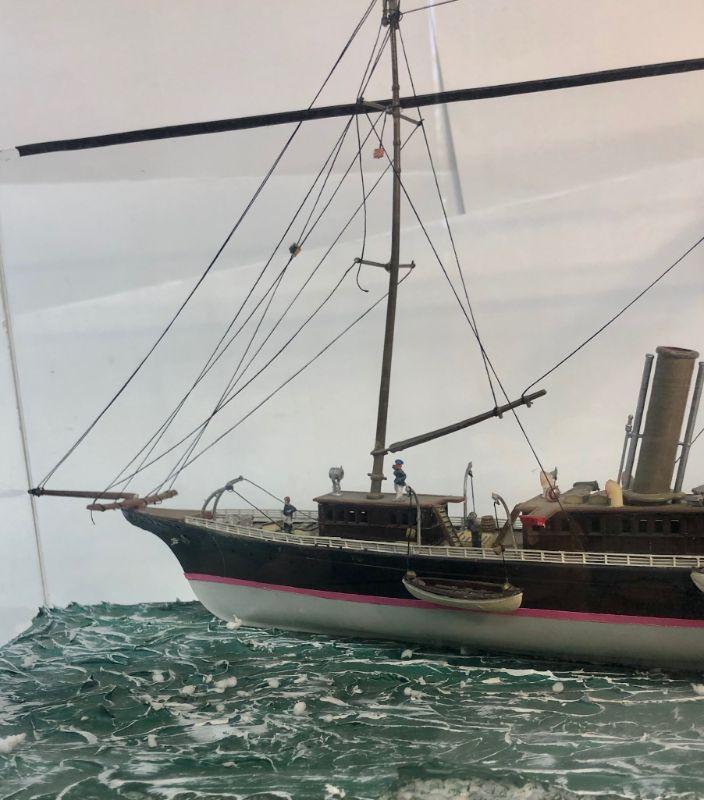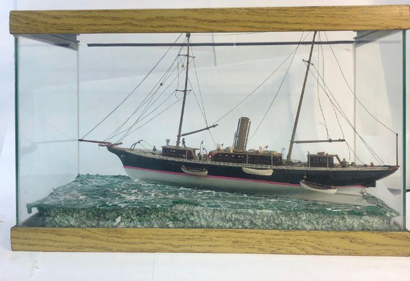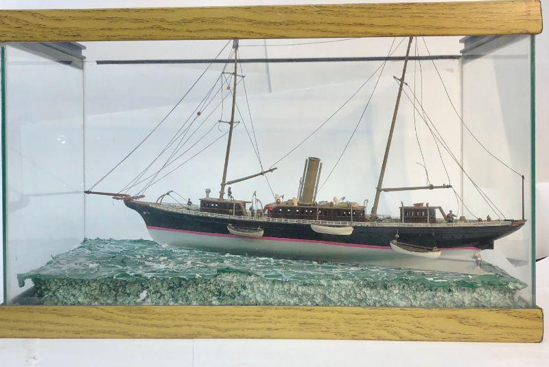 2-masted sailing ship model with steam-powered screw propulsion representing 1840-1870 technology. In a glass aquarium display box.