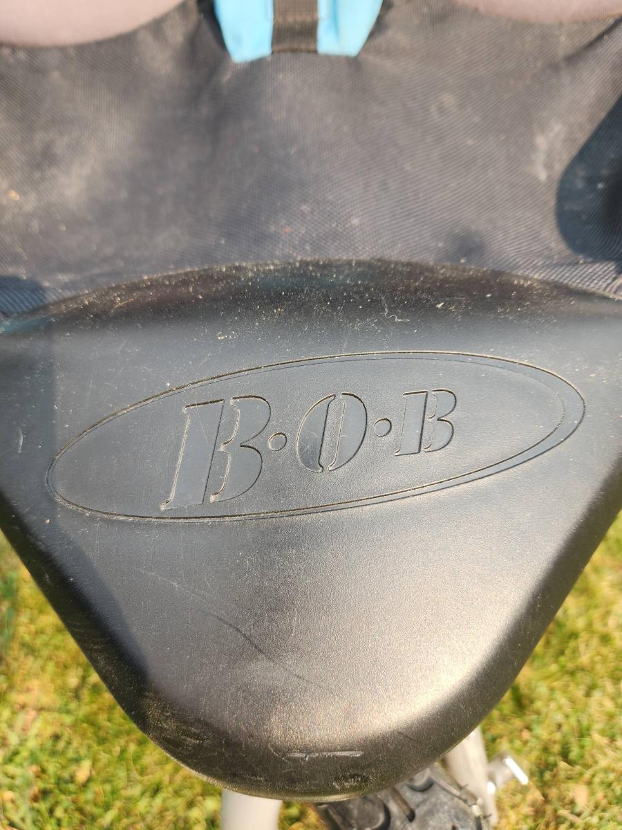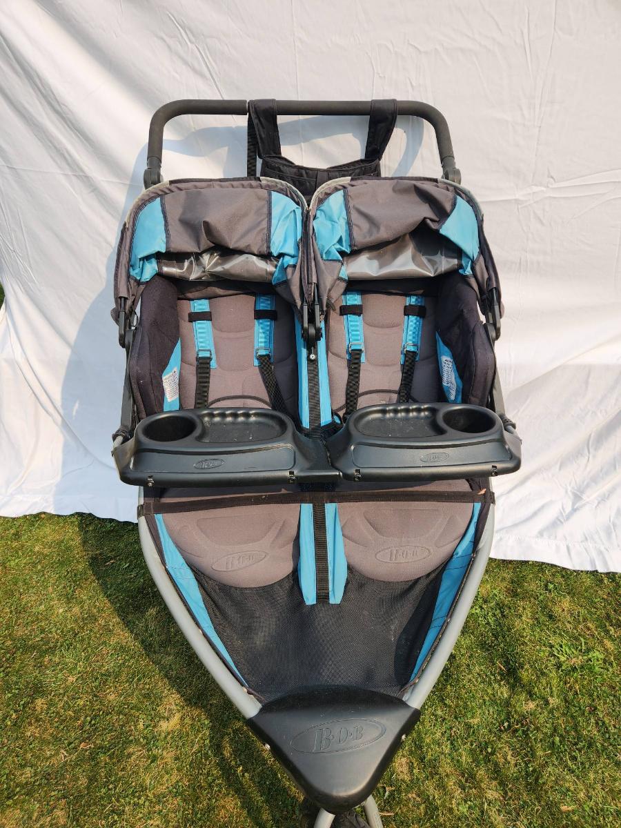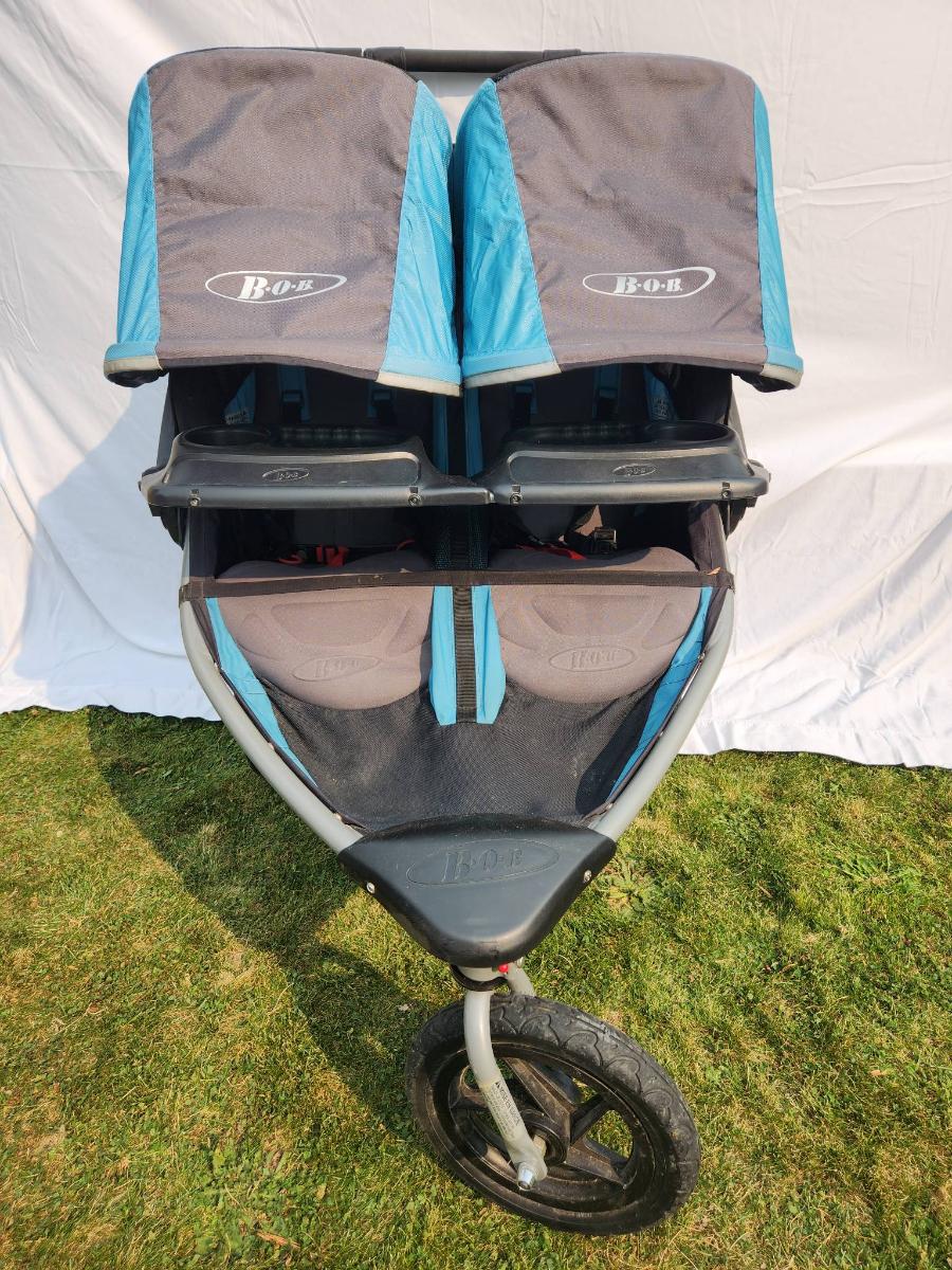 BOB Gear Revolution SE Duallie double jogging stroller, featuring a durable aluminum frame and fabric seats. Includes a front swivel locking wheel for improved maneuverability, adjustable canopies, and 5-point safety harnesses for both seats. Equipped with dual cup holders and storage compartments. Suitable for two children. Shows signs of prior use, with minor dirt present.