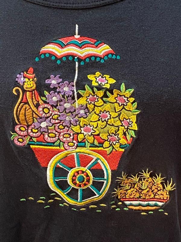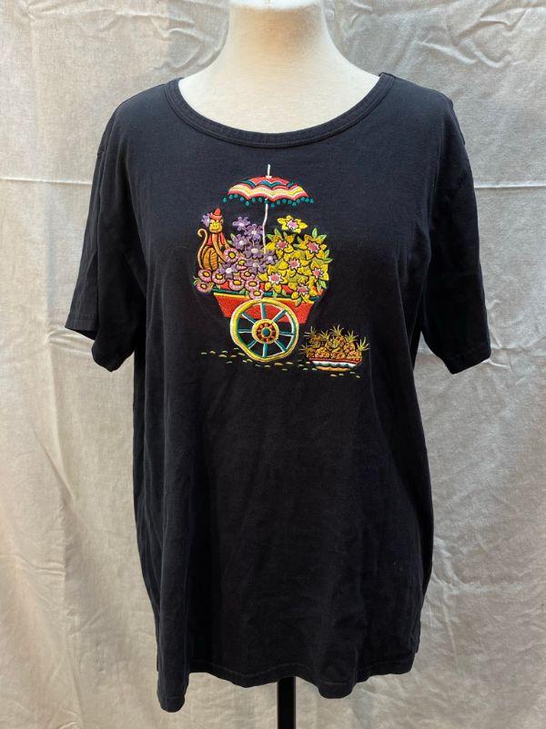 Bob Mackie Wearable Art embroidered t-shirt. Black short sleeve shirt. Features a monkey with a flower cart on the front. Size large. Good condition.