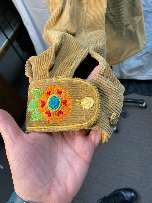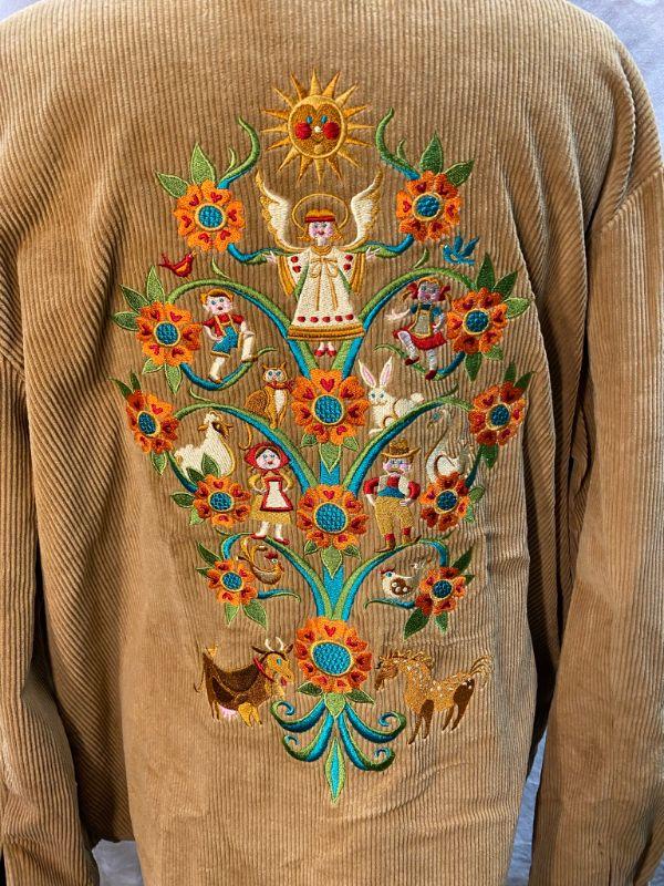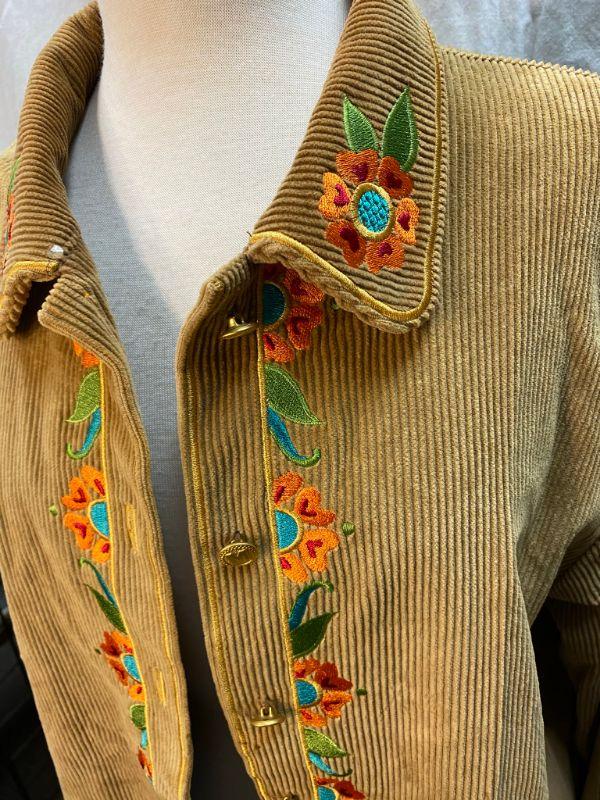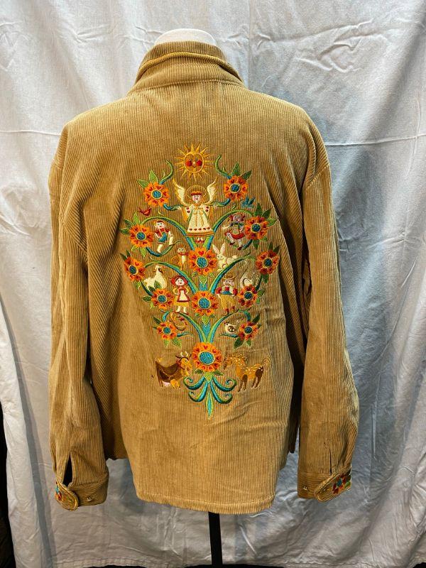 Bob Mackie Wearable Art corduroy embroidered button up shirt. Tan corduroy with orange and blue floral up the front Large tree of Life style design embroidered on the back. Good condition. Size XL.