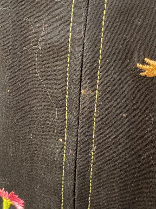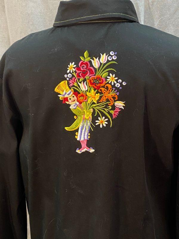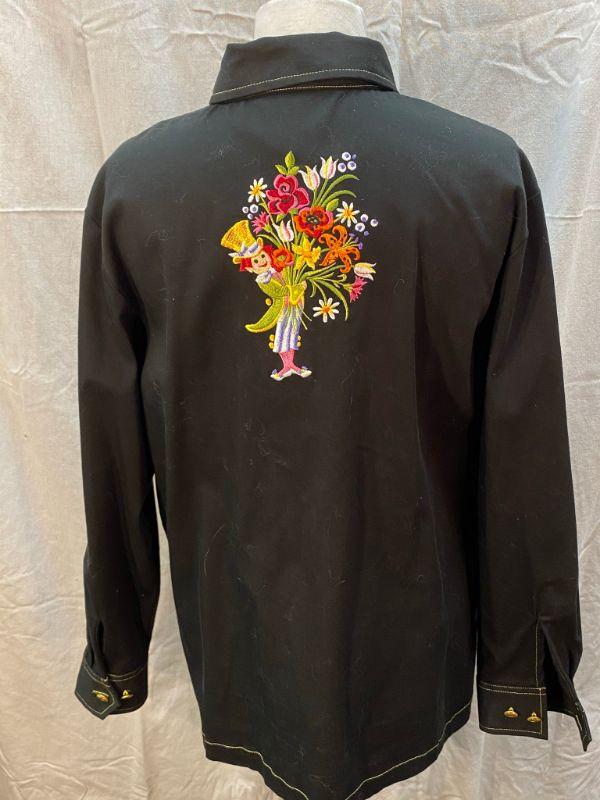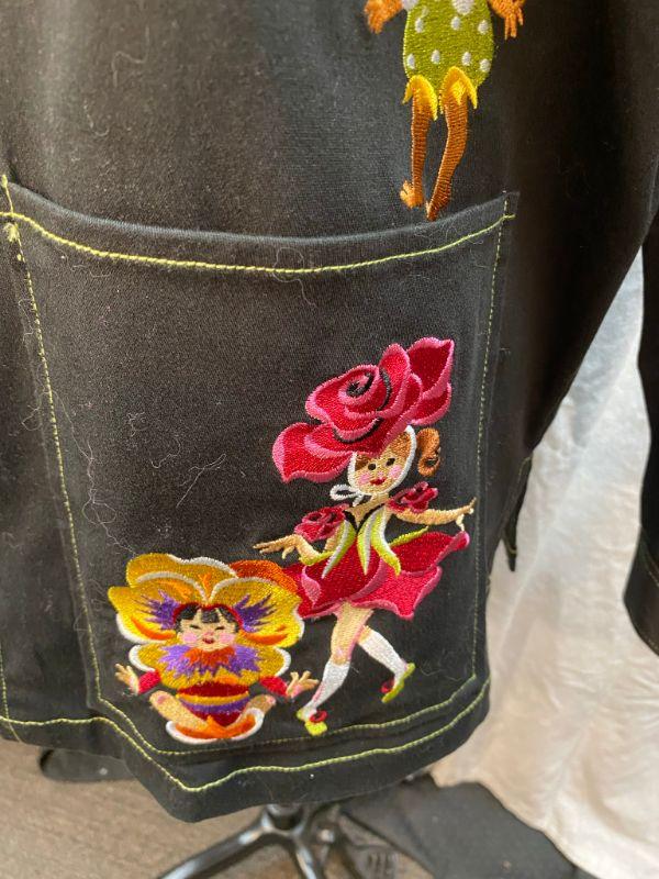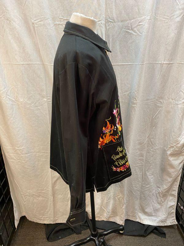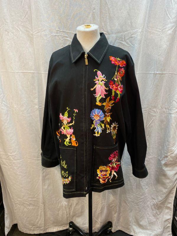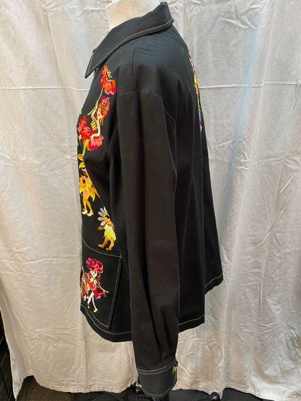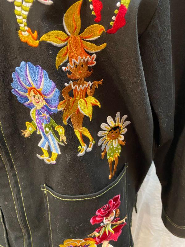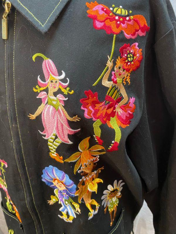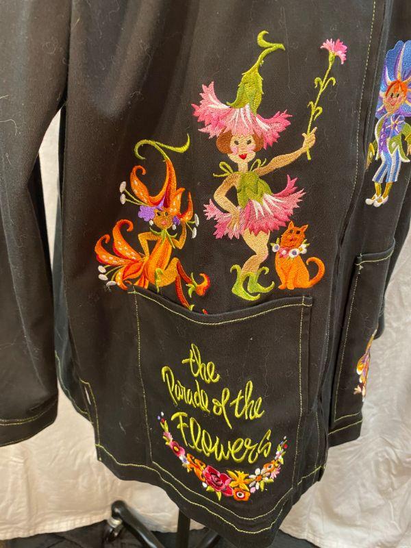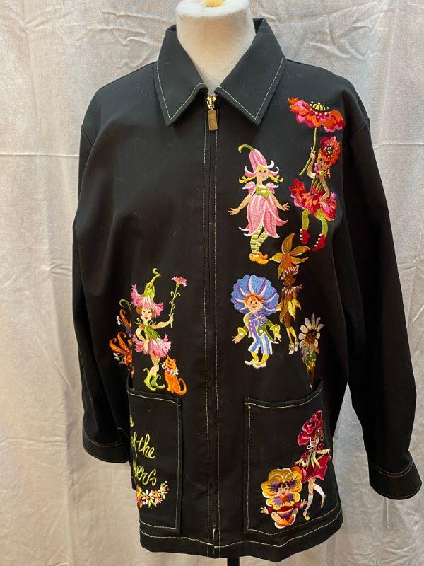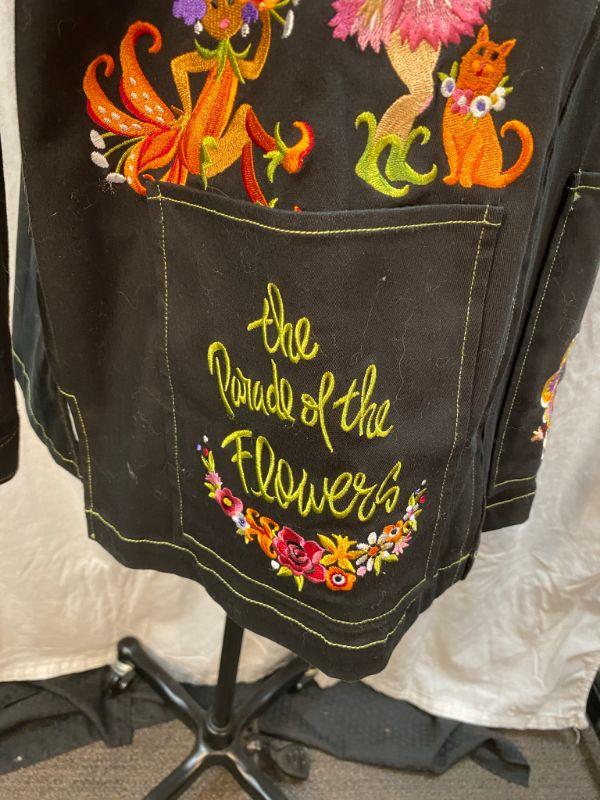 Bob Mackie Wearable Art "Parade of the Flowers" zip front jacket. Embroidered on the front and back. front pockets. There is a couple spots nears zipper, they look to be surface, probably come out when washed. Size Large.