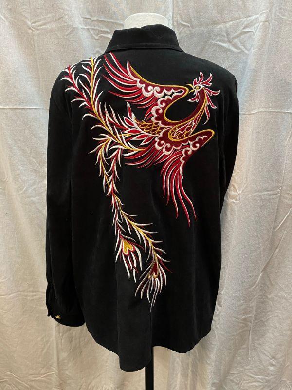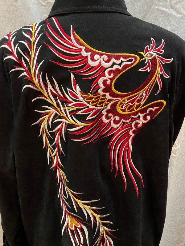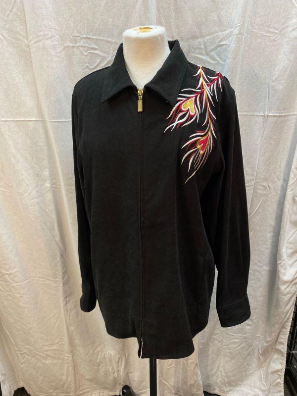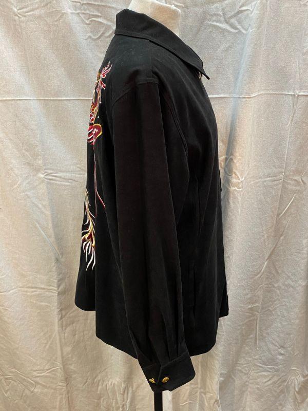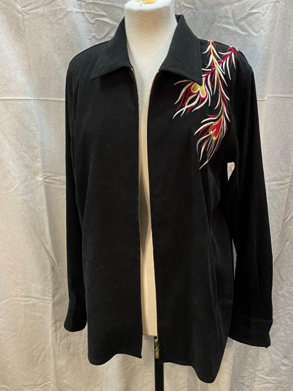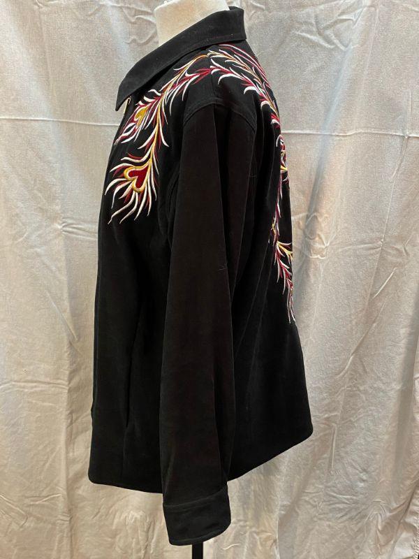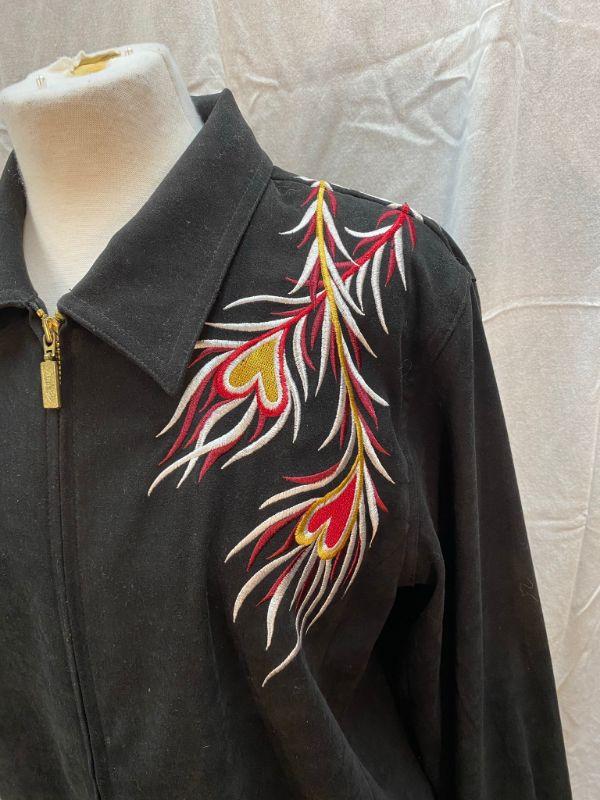 Bob Mackie Wearable Art zip front embroidered jacket. Beautiful phoenix bird embroidered on the back with tail feathers coming over the shoulder. Size large. Good condition.
