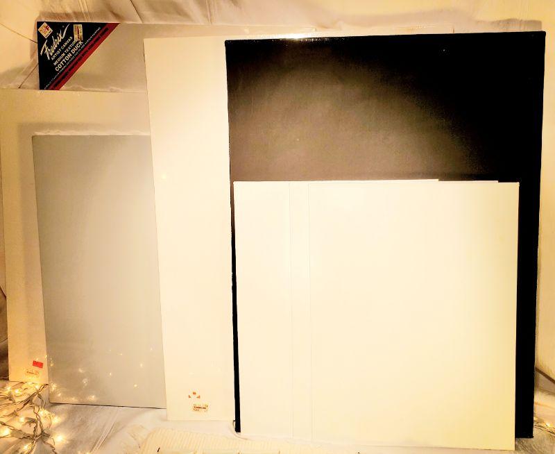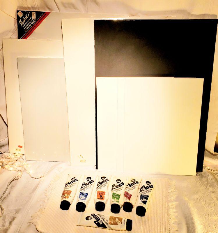 8 canvas (only 1 painted, the black one) and 7 used tube of Bob Ross paints