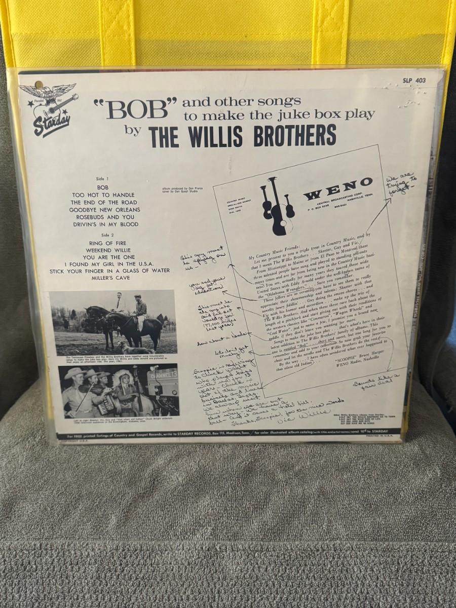 The image you provided shows the vinyl album titled "Bob" And Other Songs To Make The Jukebox Play by the country music group, The Willis Brothers.