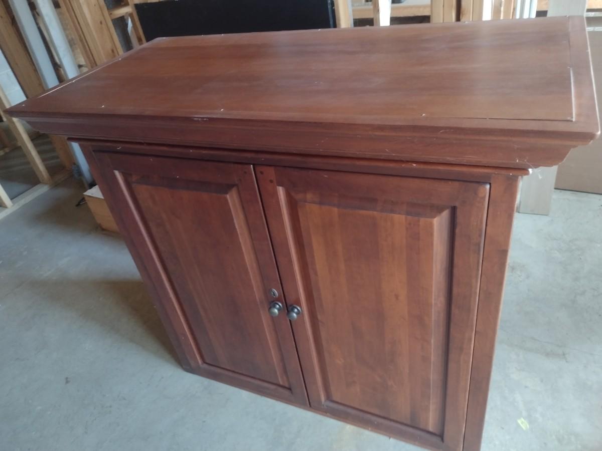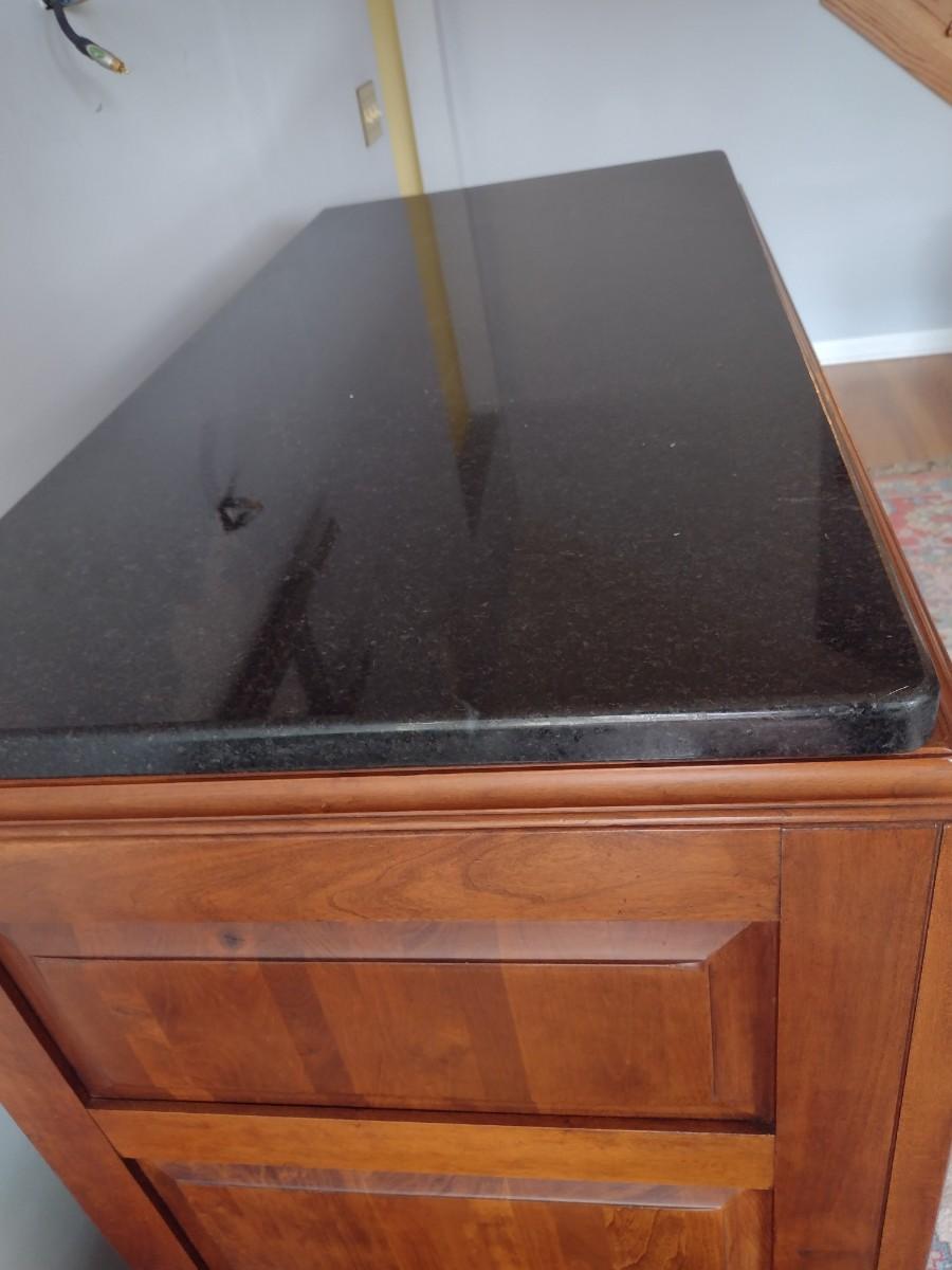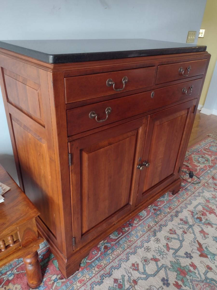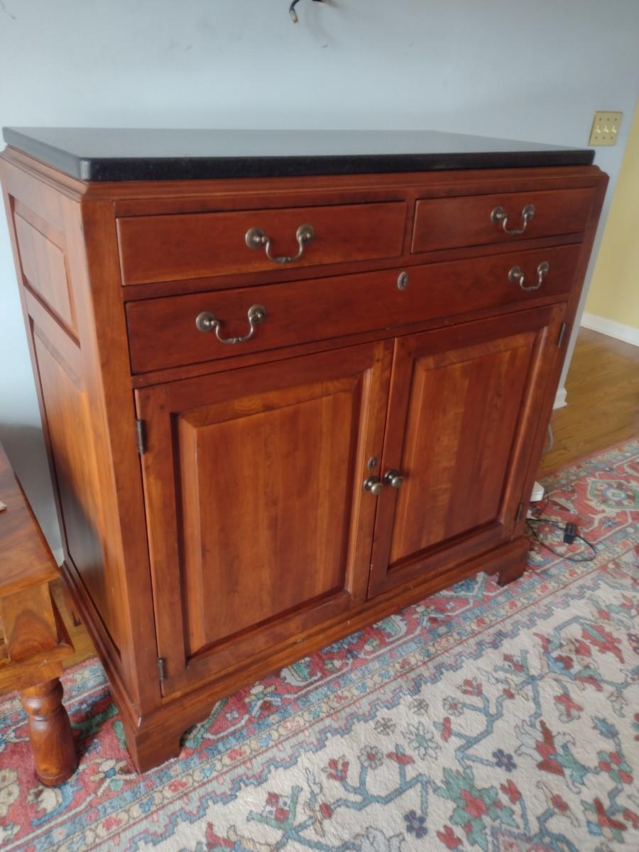 Bob Timberlake Cherry Wood Finish Two Piece Armoire and Media Cabinet with Added Granite Slab Topper. Bottom piece is on main floor and used as a buffet piece. Upper portion is media cabinet is downstairs. The slab was added later to allow as a table surface.