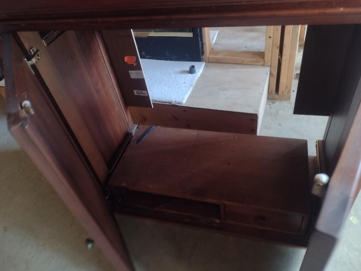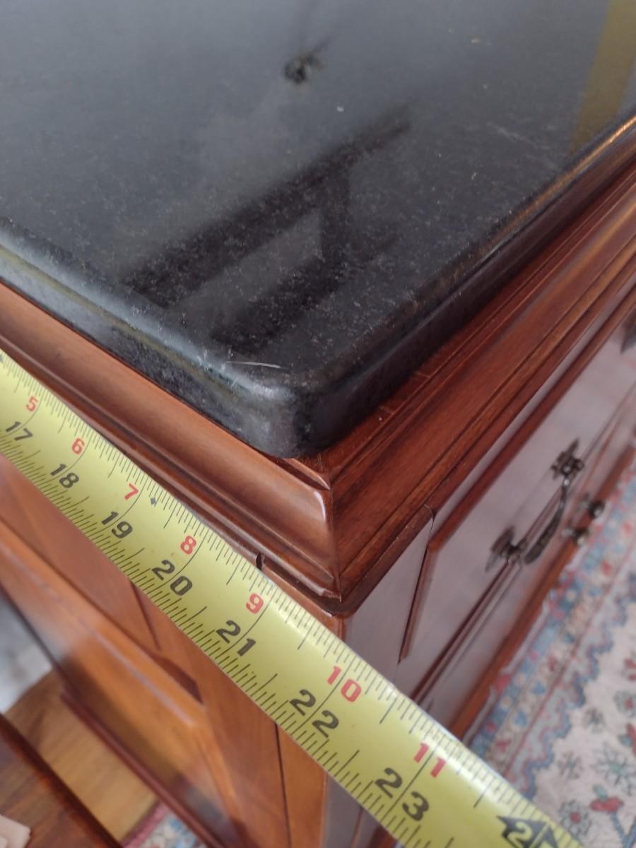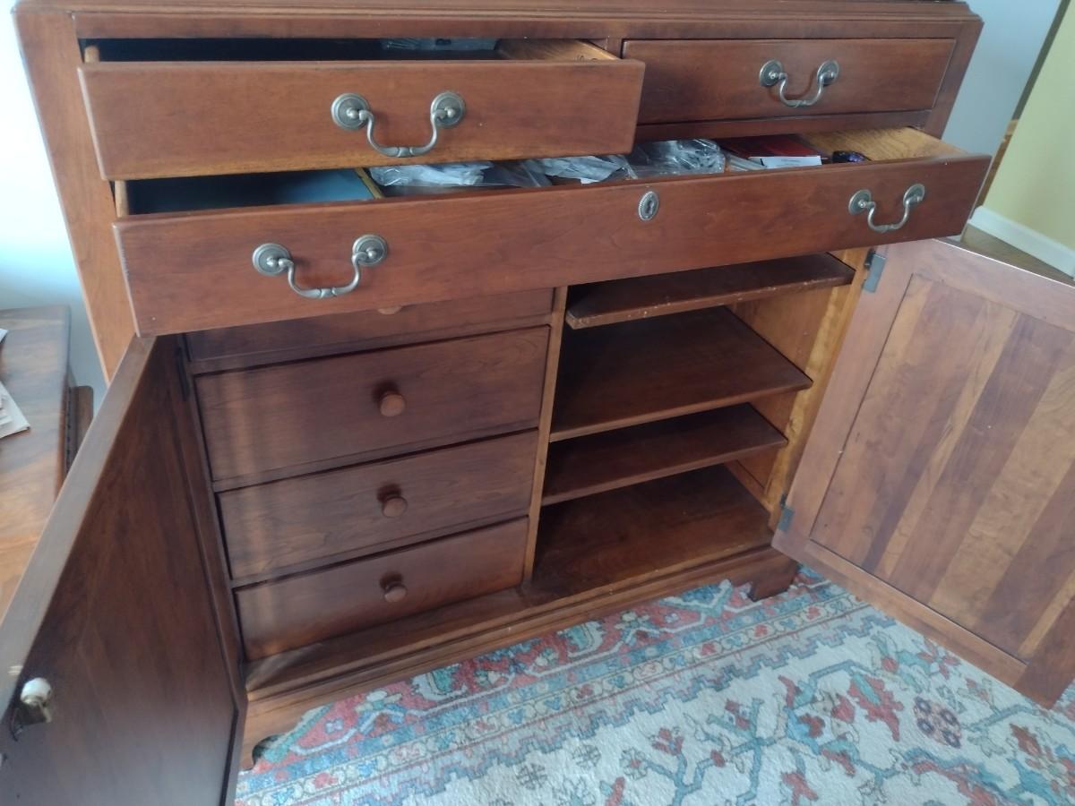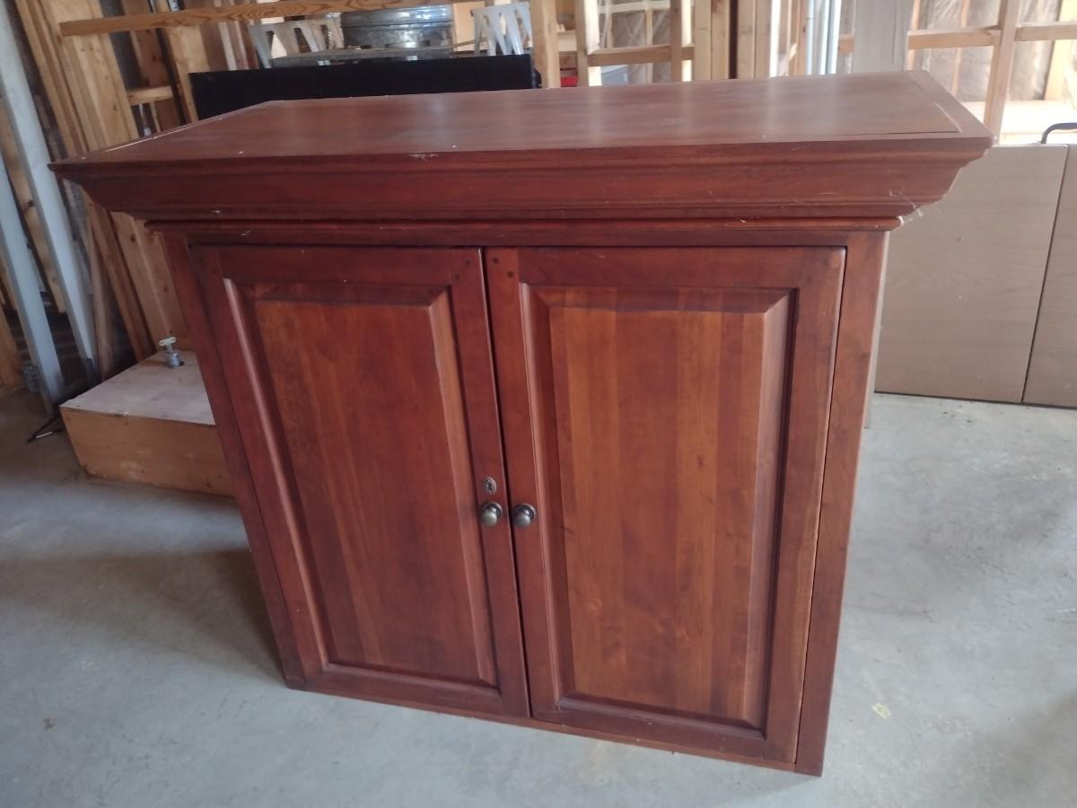 Bob Timberlake Cherry Wood Finish Two Piece Armoire and Media Cabinet with Added Granite Slab Topper. Bottom piece is on main floor and used as a buffet piece. Upper portion is media cabinet is downstairs. The slab was added later to allow as a table surface.