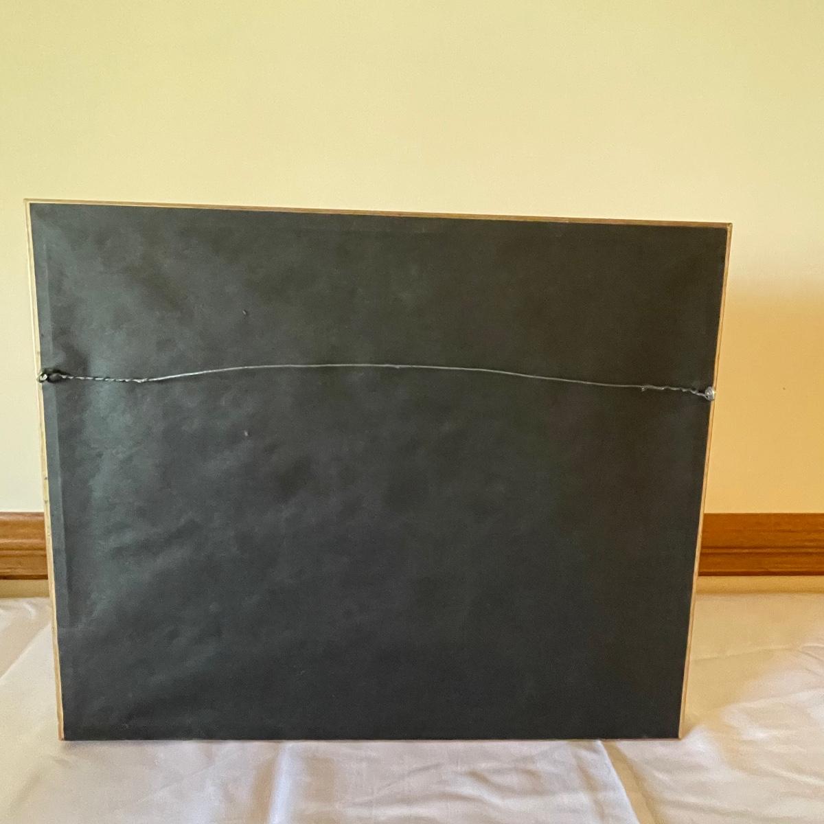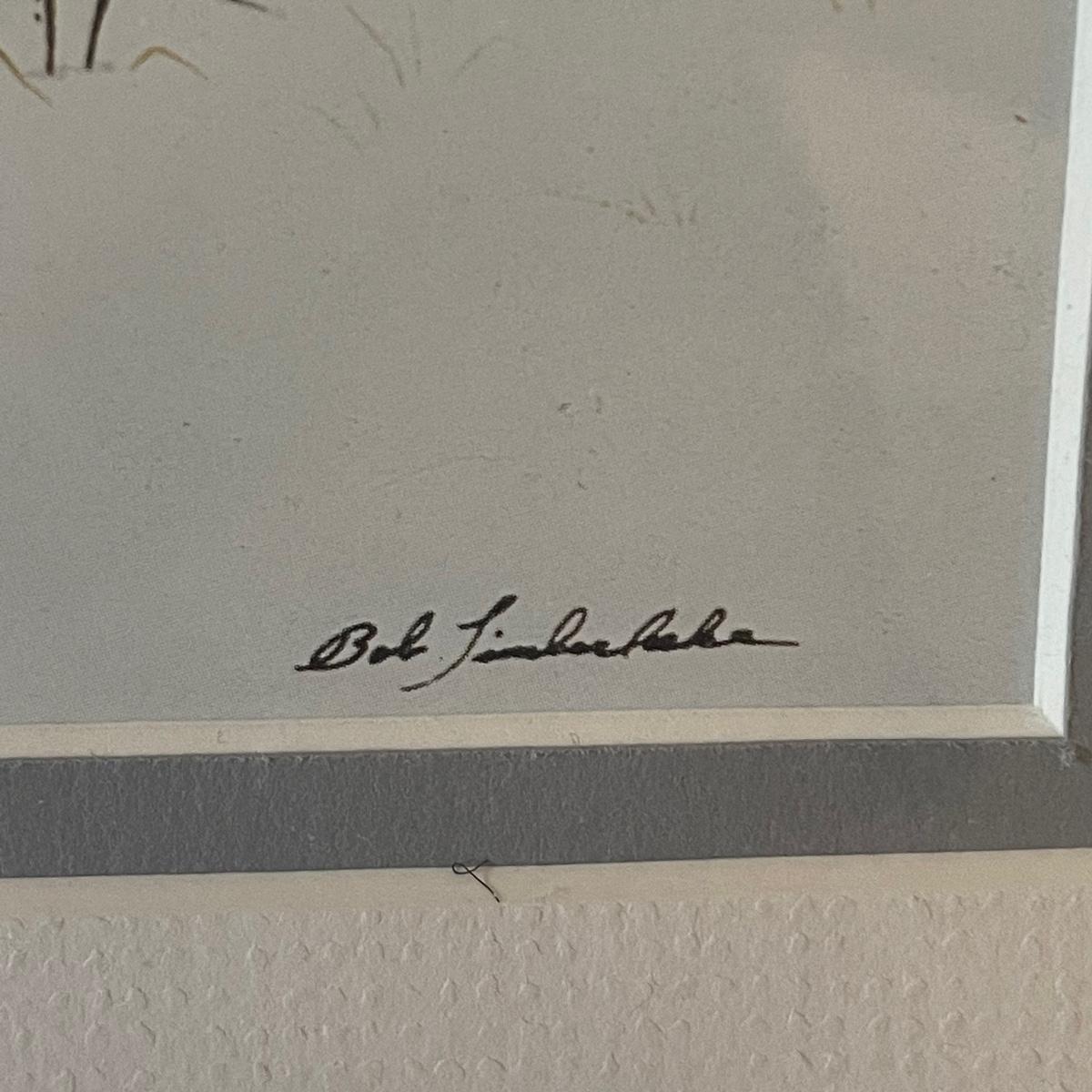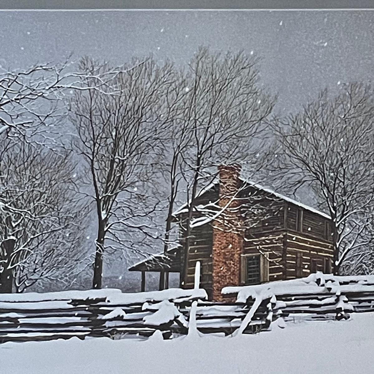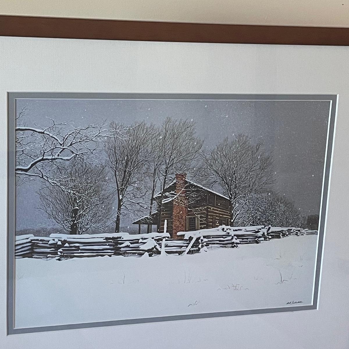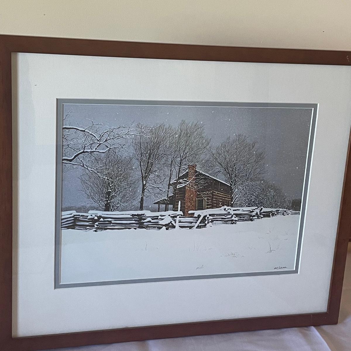 This superb snowy log cabin scene is by famed NC artist Bob Timberlake and has a signature. Matted and mounted in a simple wood frame, it measures 16” x 20”.