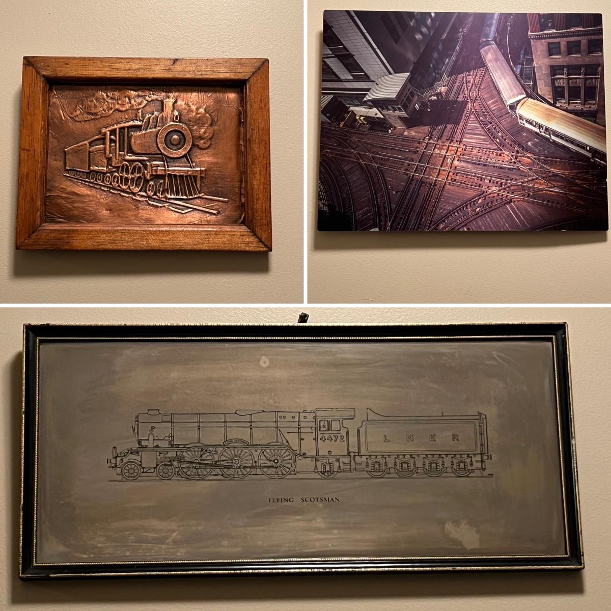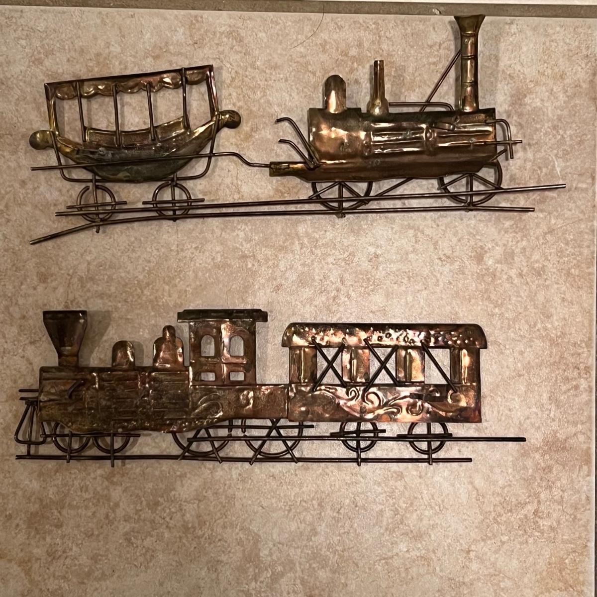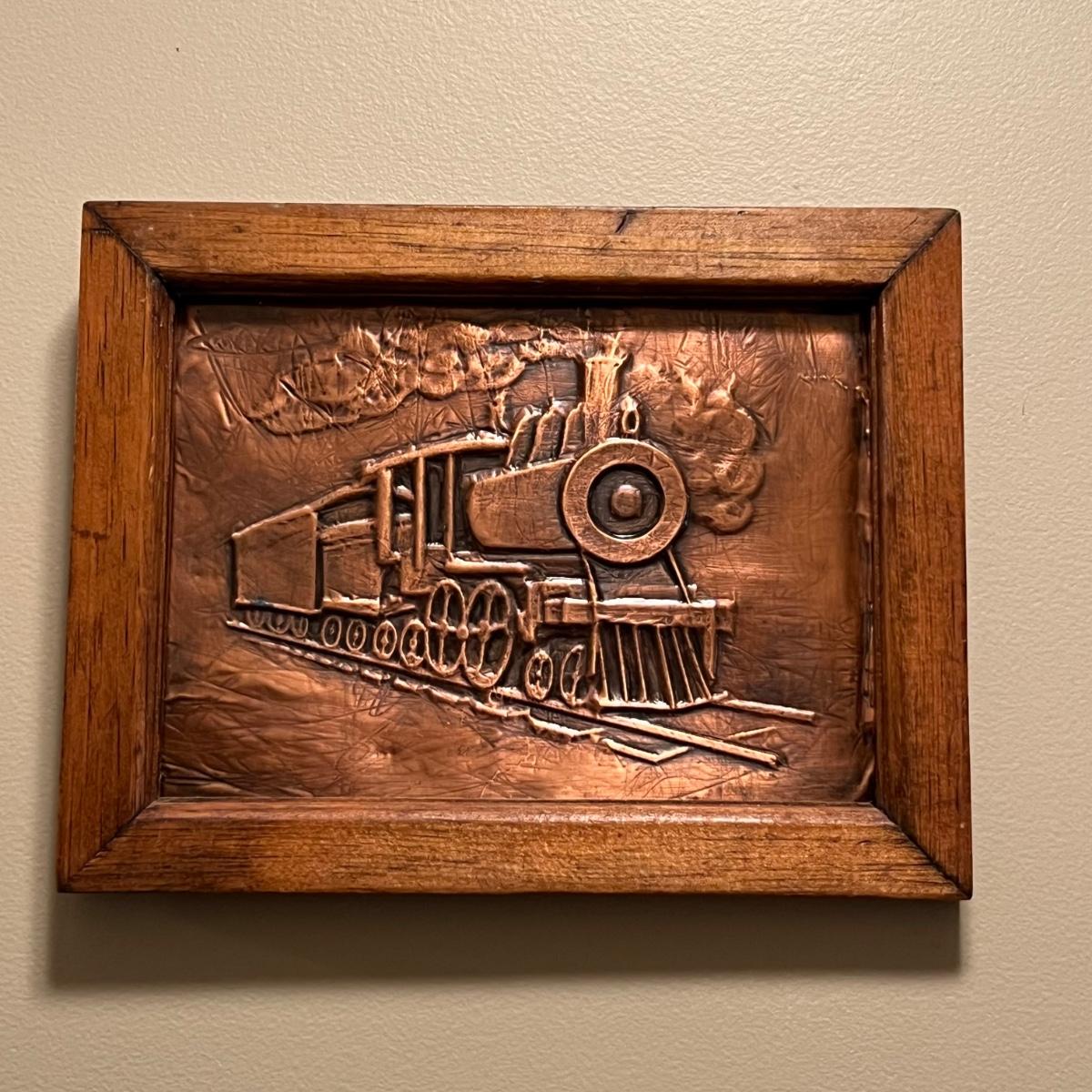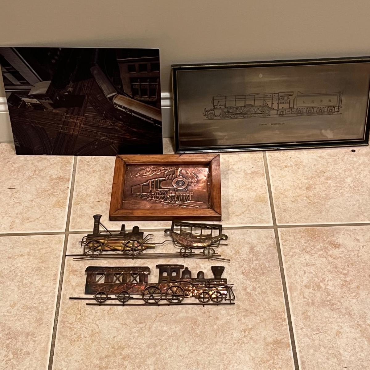 A great assortment of metal art for the train lover. The Bobbi Teal is a color photo on metal title ‘Change (Chicago), it measures 14” x 11”; appears to be aluminum and does have a small dent, see pic. The train in a small wooden frame appears to be copper as do the two small wall hangings. The Flying Scotsman is metal, possibly tin and is mounted in a black plastic frame. No pieces are under glass.
