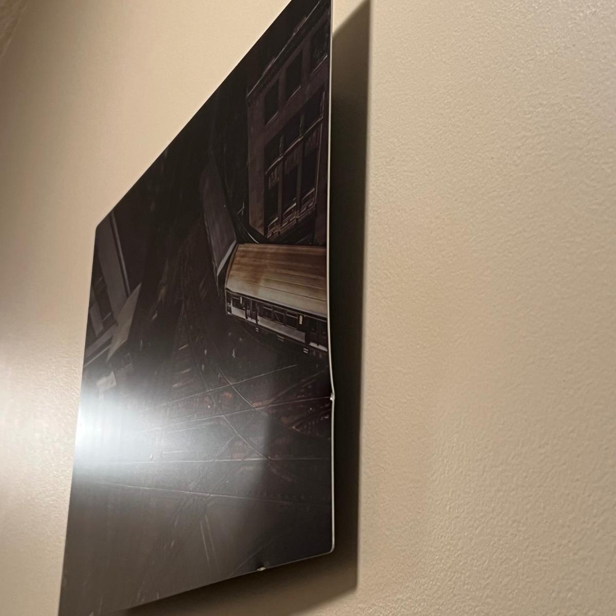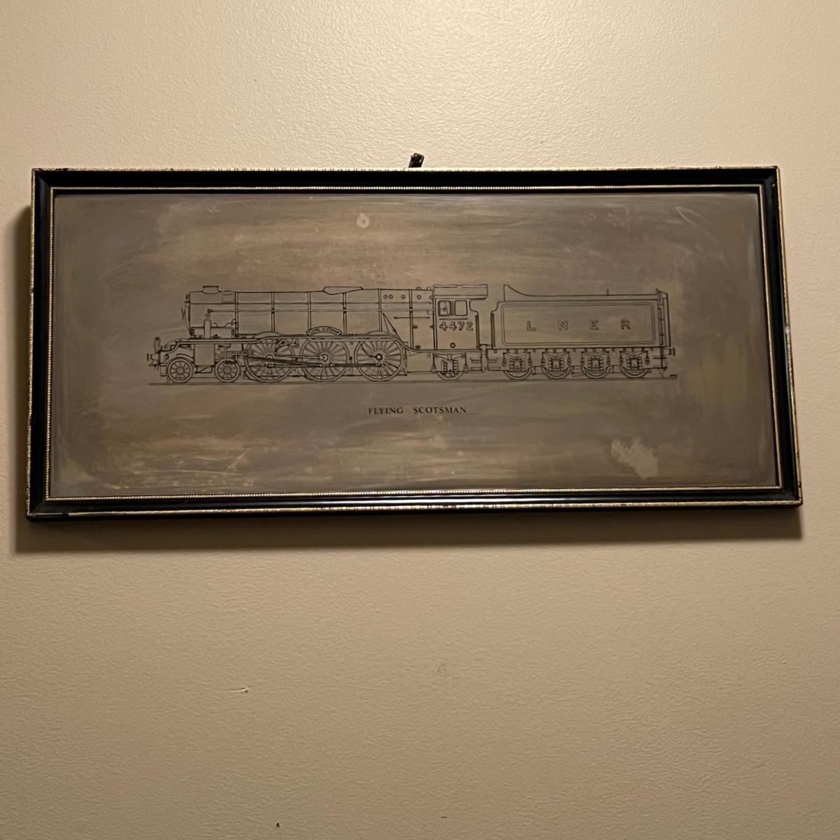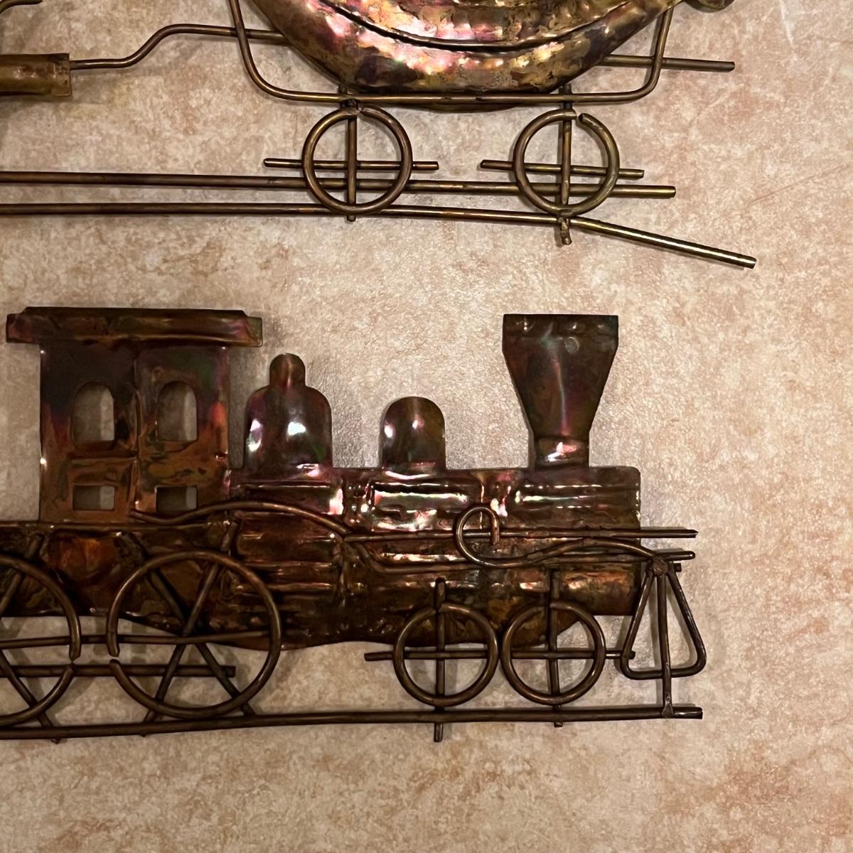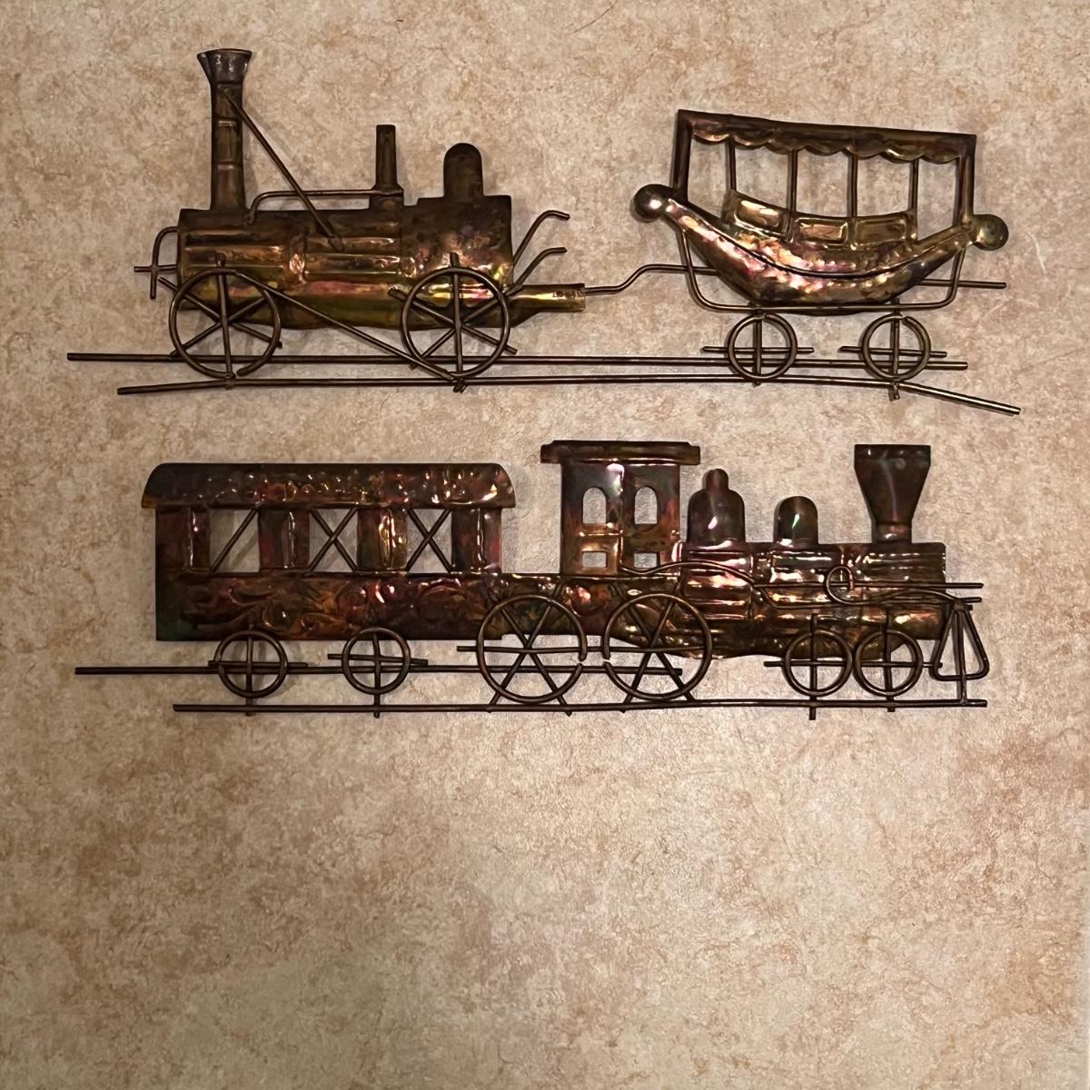 A great assortment of metal art for the train lover. The Bobbi Teal is a color photo on metal title ‘Change (Chicago), it measures 14” x 11”; appears to be aluminum and does have a small dent, see pic. The train in a small wooden frame appears to be copper as do the two small wall hangings. The Flying Scotsman is metal, possibly tin and is mounted in a black plastic frame. No pieces are under glass.