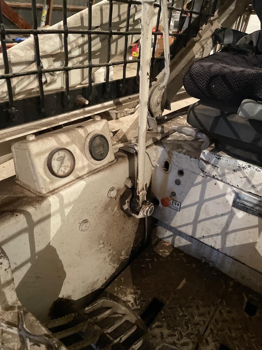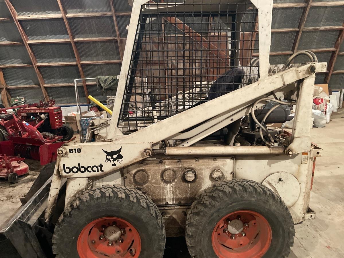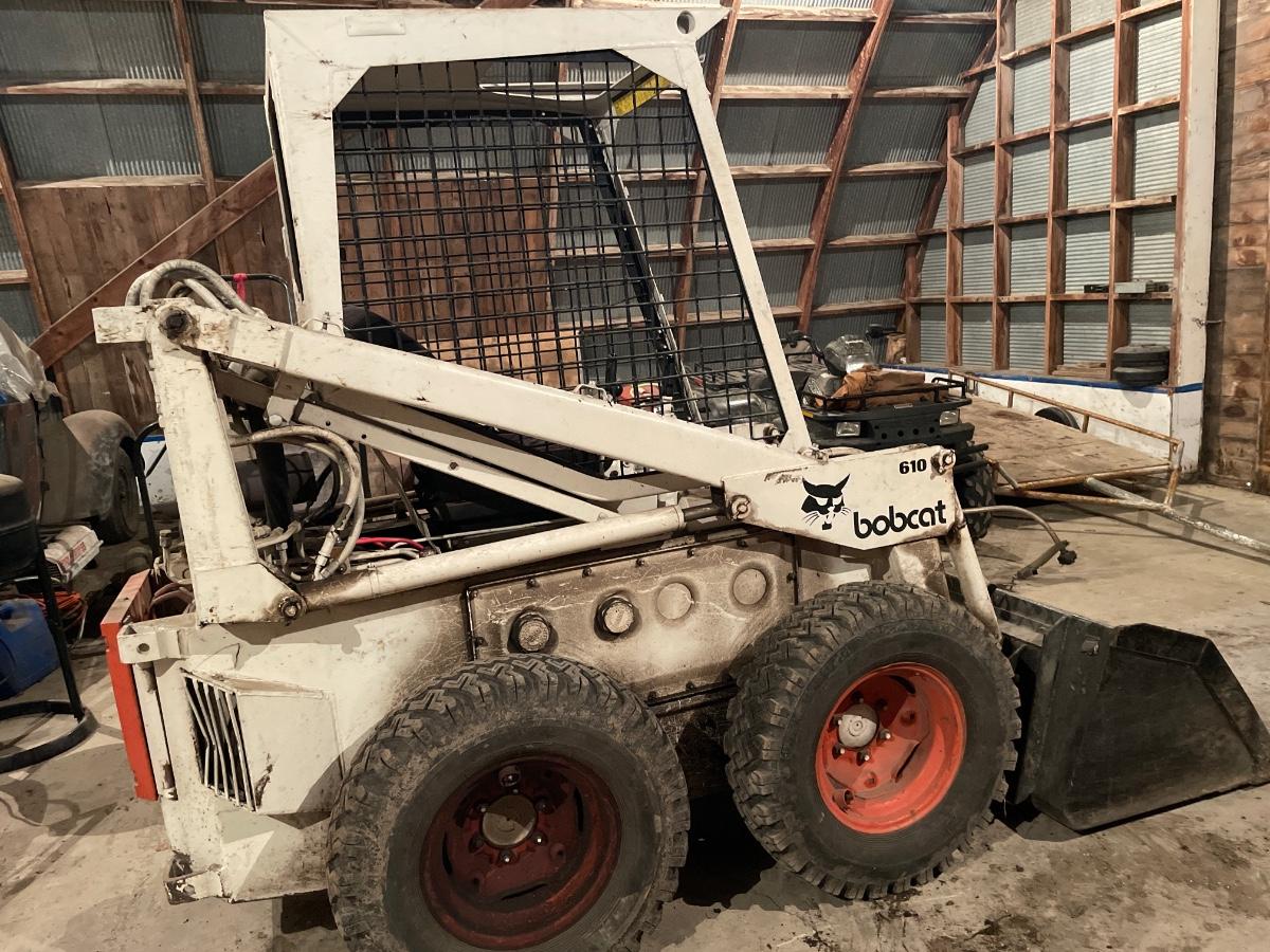 This Bobcat 610 skid steer weighs 3805 pounds and is shown on the left with a general bucket attachment.