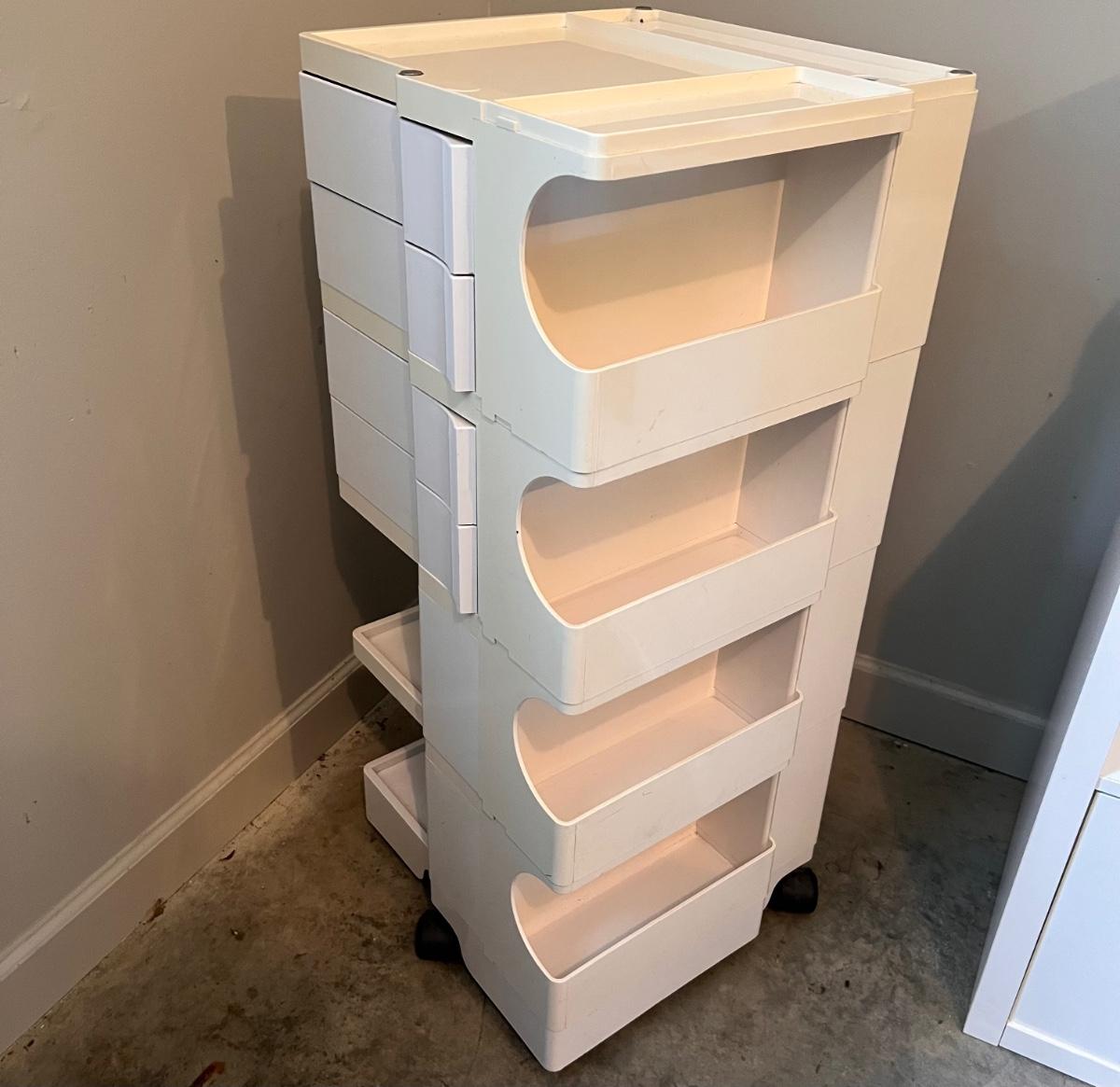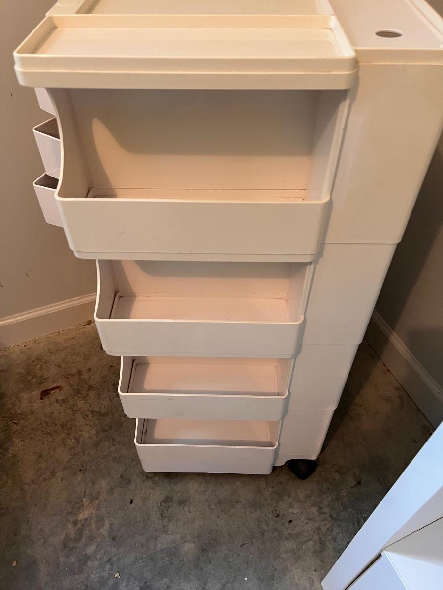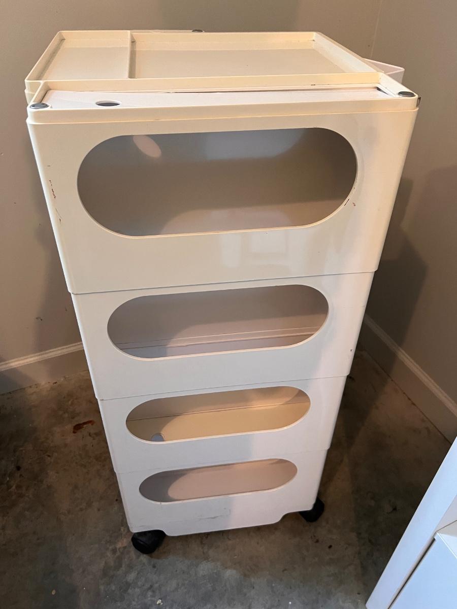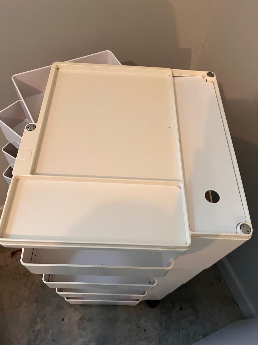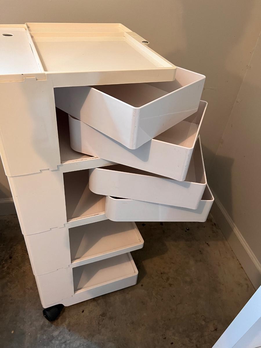 This super handy retro Boby trolley measures 17” x 16” x 37”H. It has lots of shelves, cubbies and pull-out trays, see pics. Made of plastic and an off-white color with white drawers.