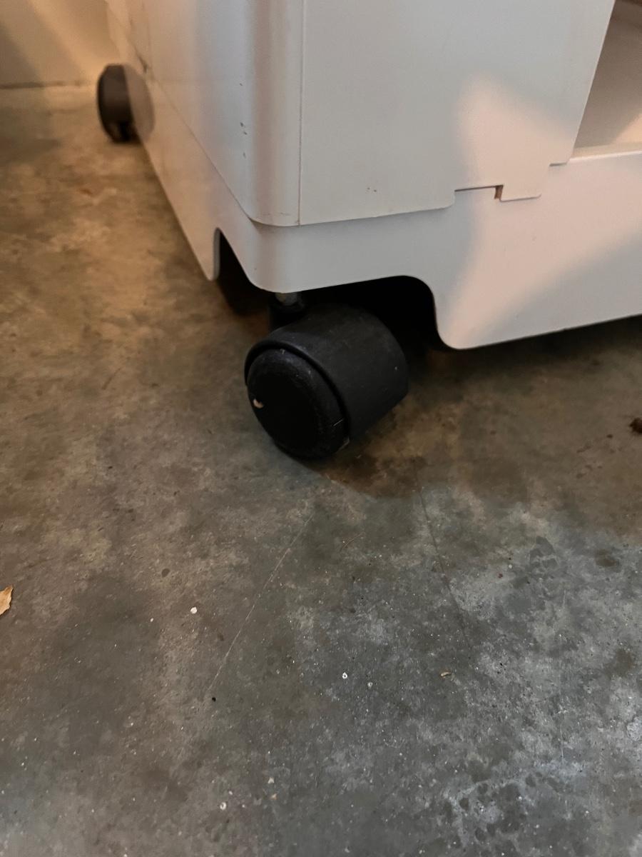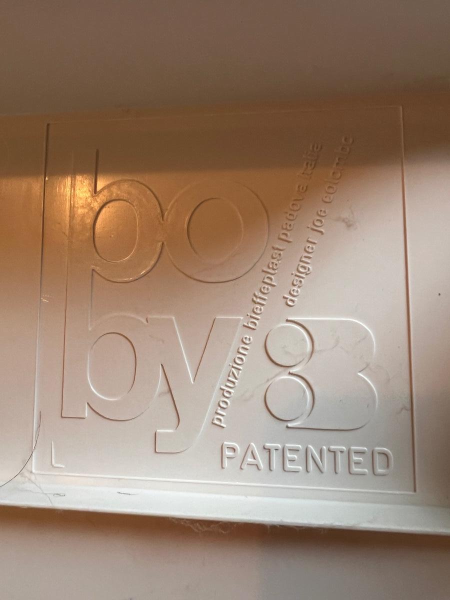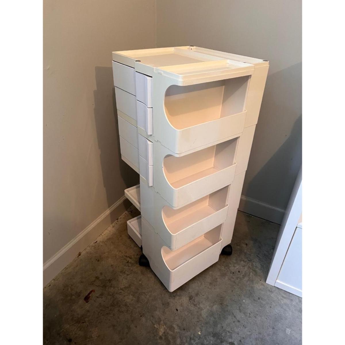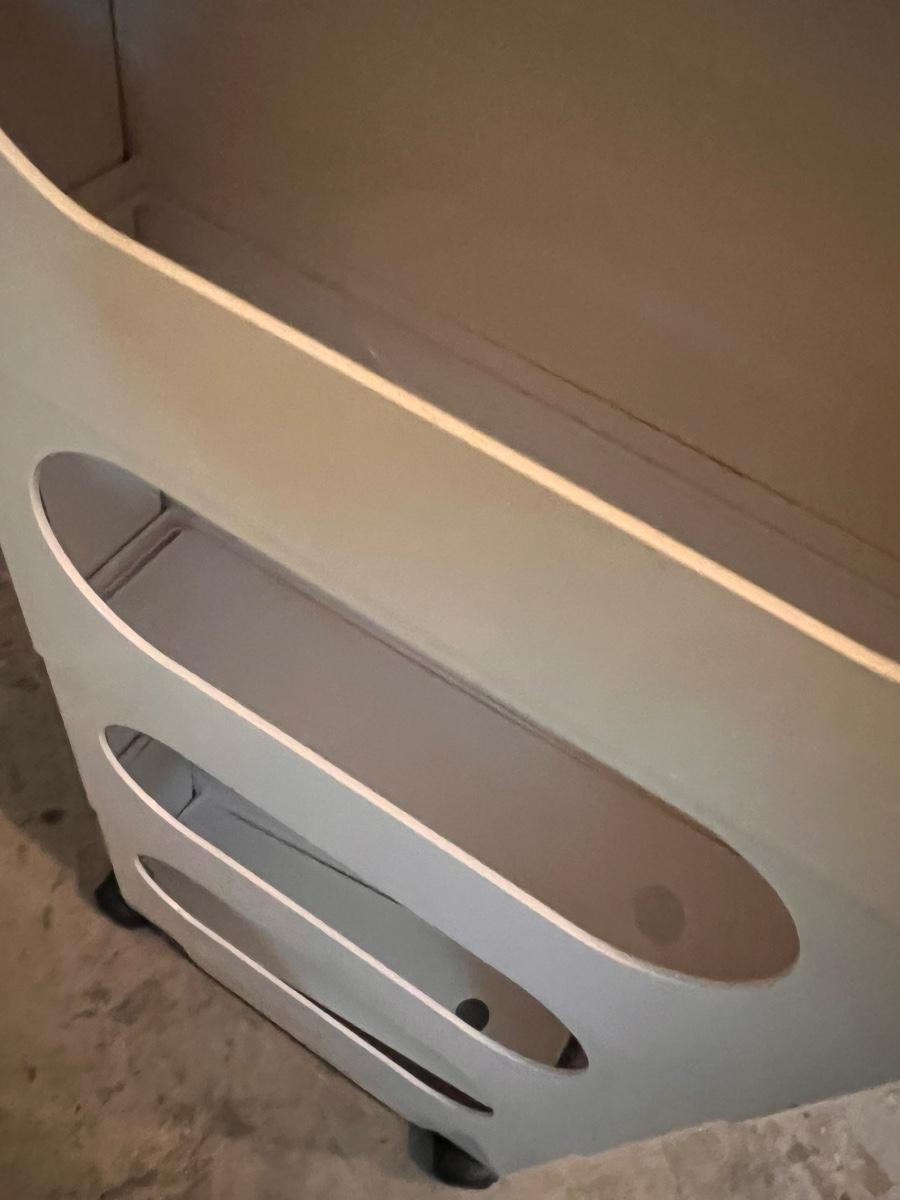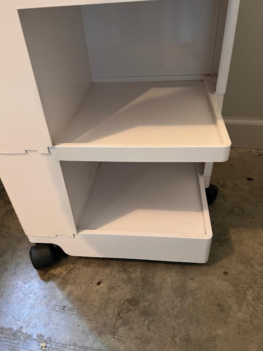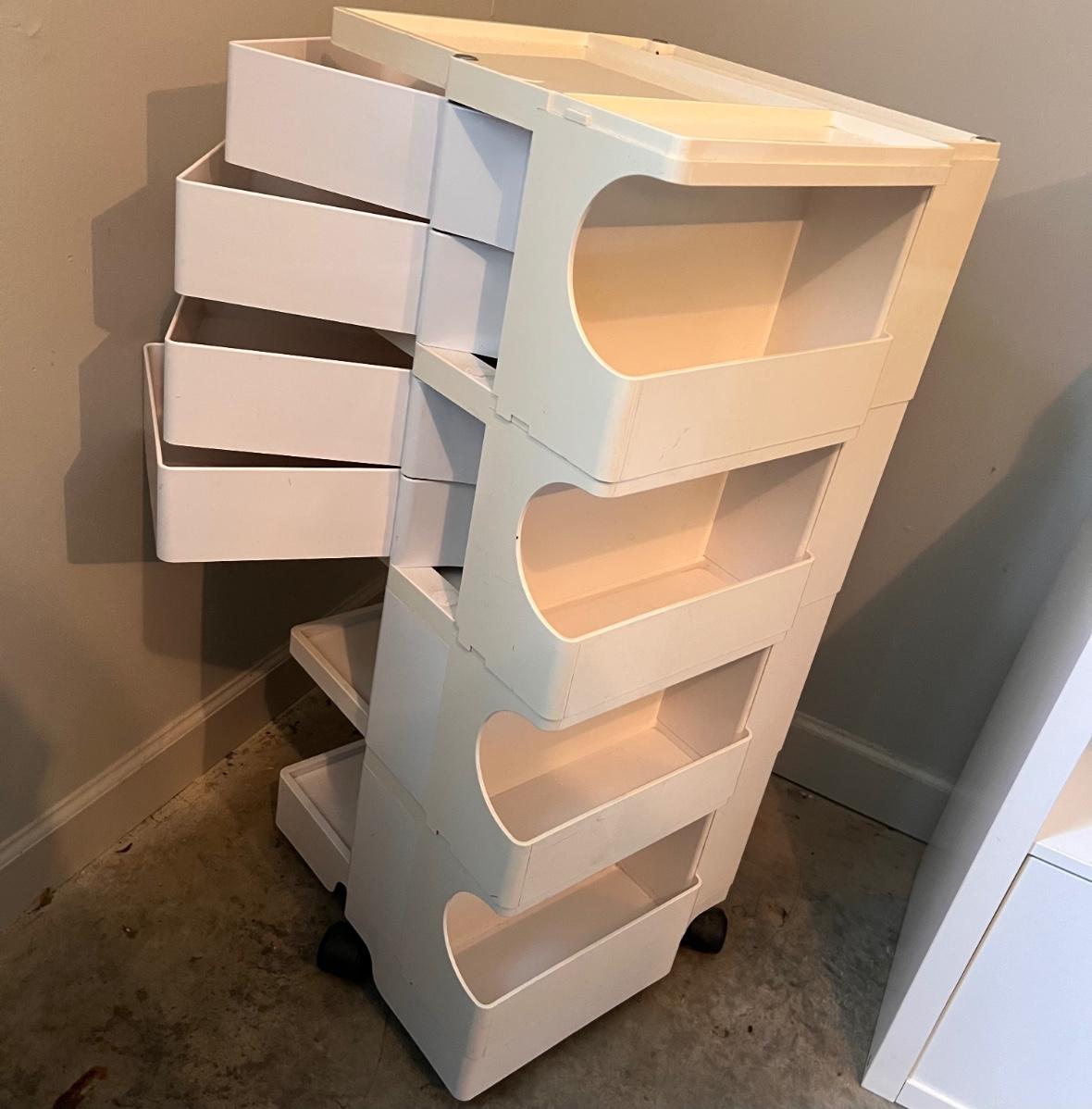 This super handy retro Boby trolley measures 17” x 16” x 37”H. It has lots of shelves, cubbies and pull-out trays, see pics. Made of plastic and an off-white color with white drawers.