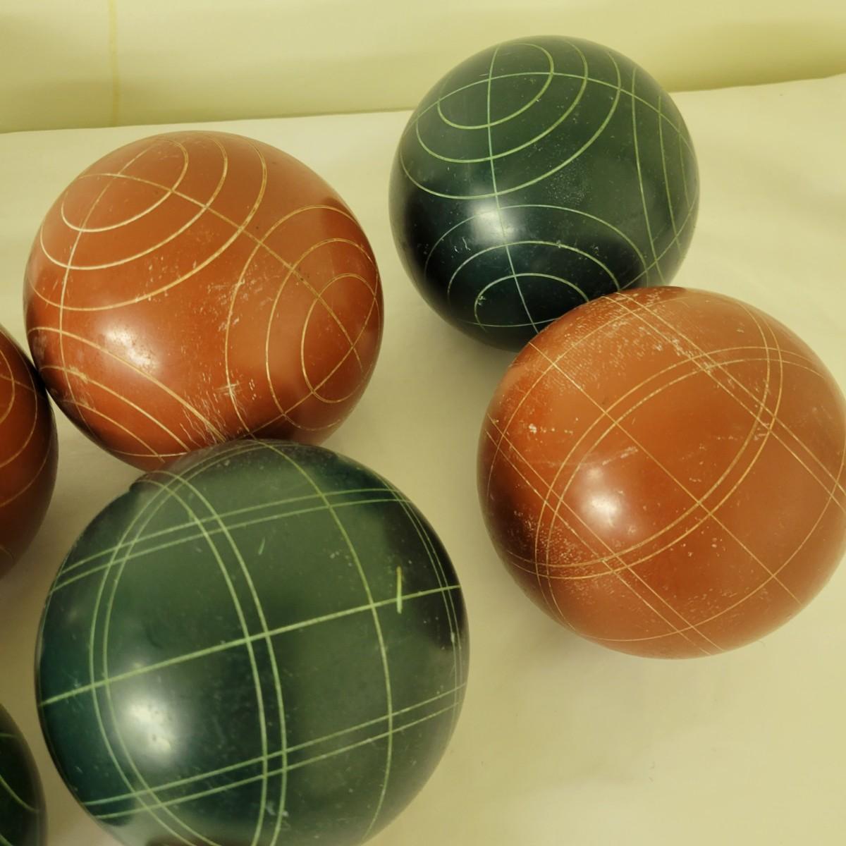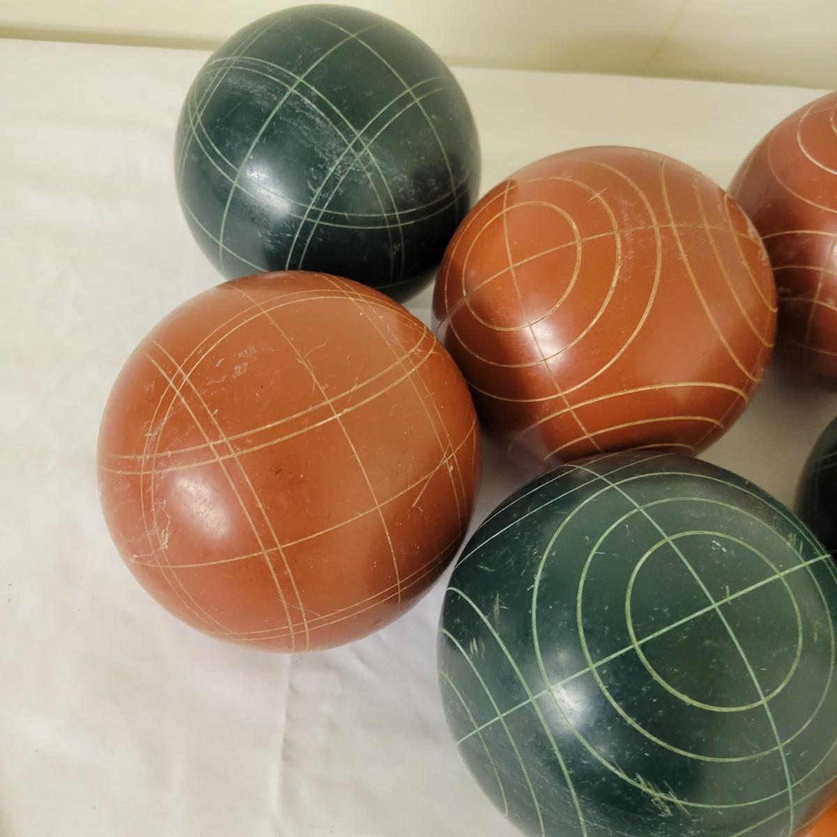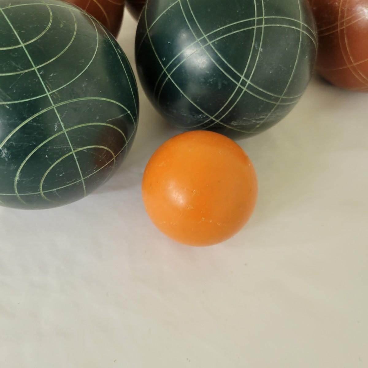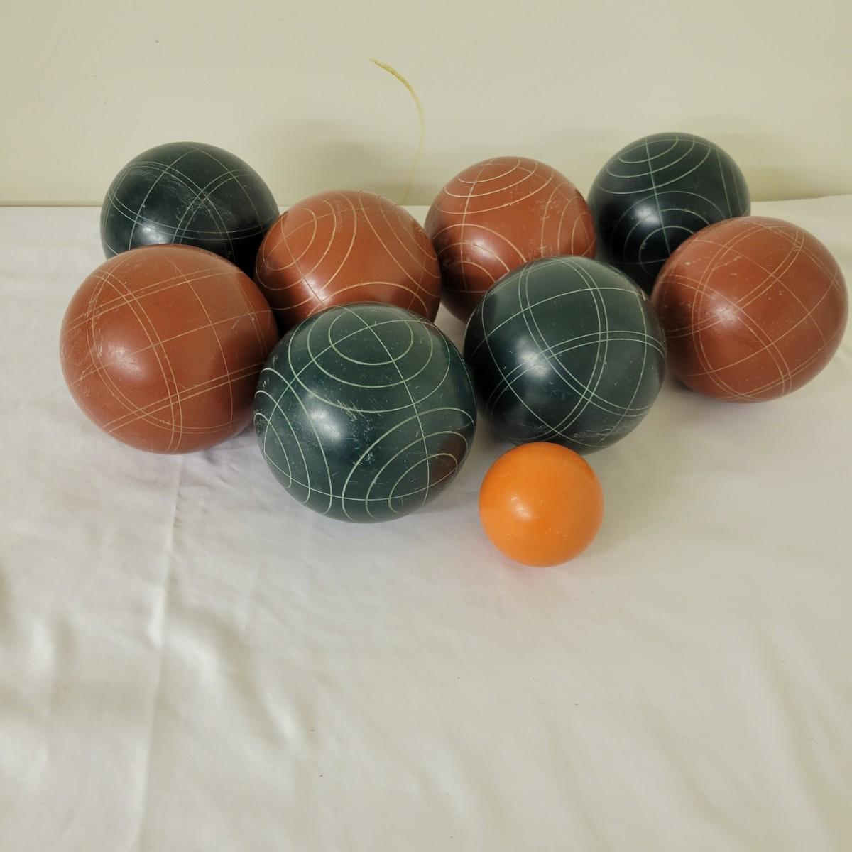 A set of bocce balls made of resin. Included are four blue balls and four that are reddish orange and also includes a small target ball. The balls are 4"D. Shipping available