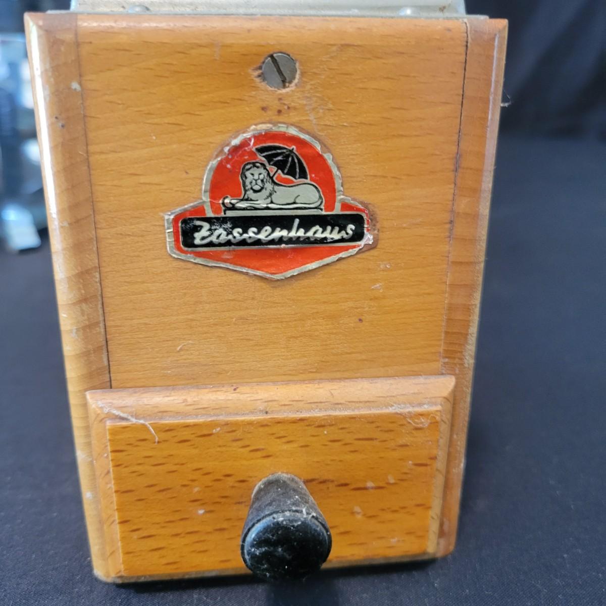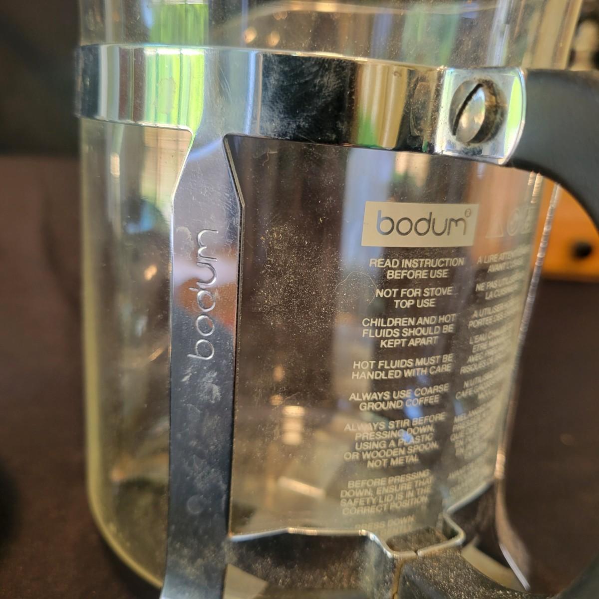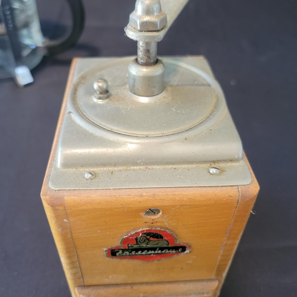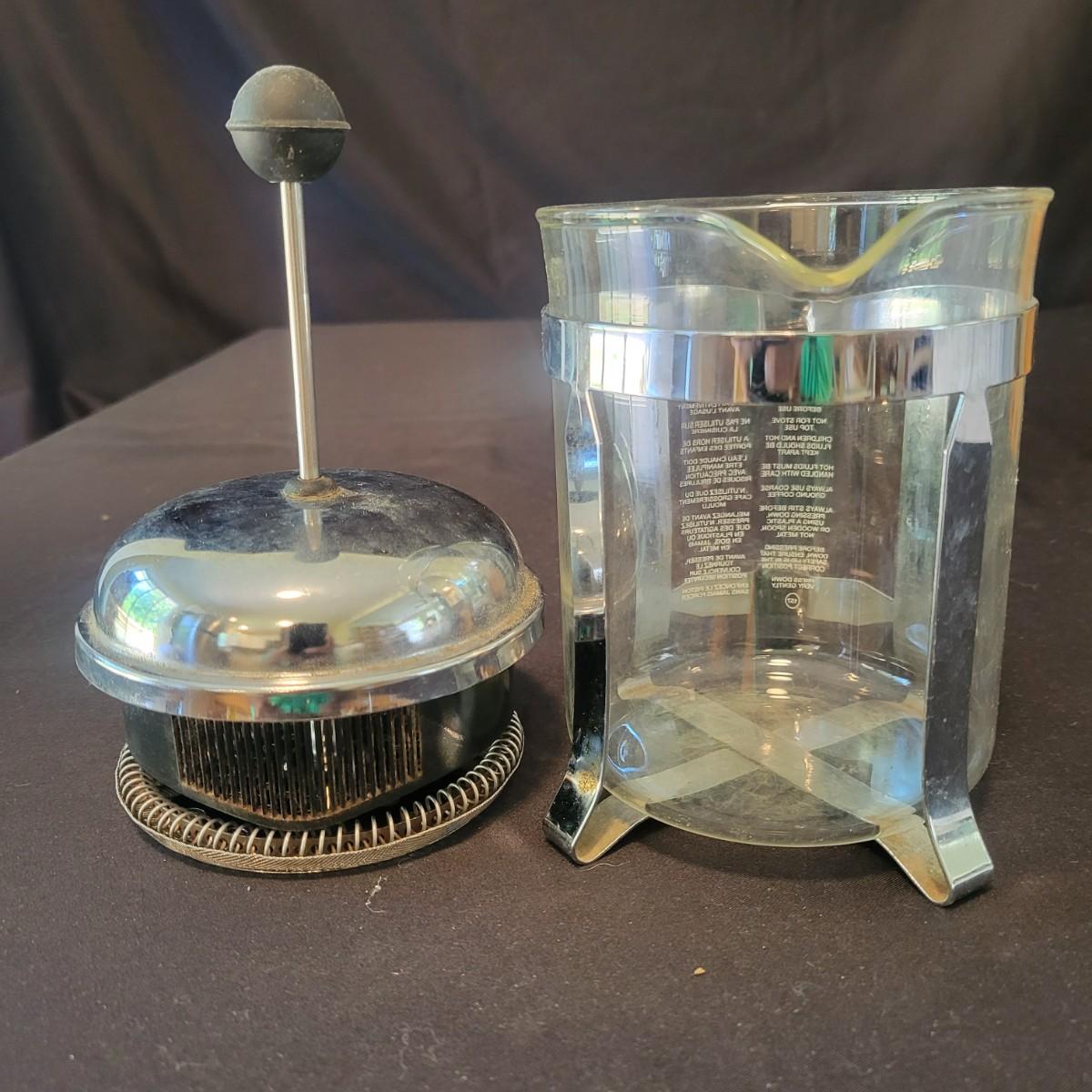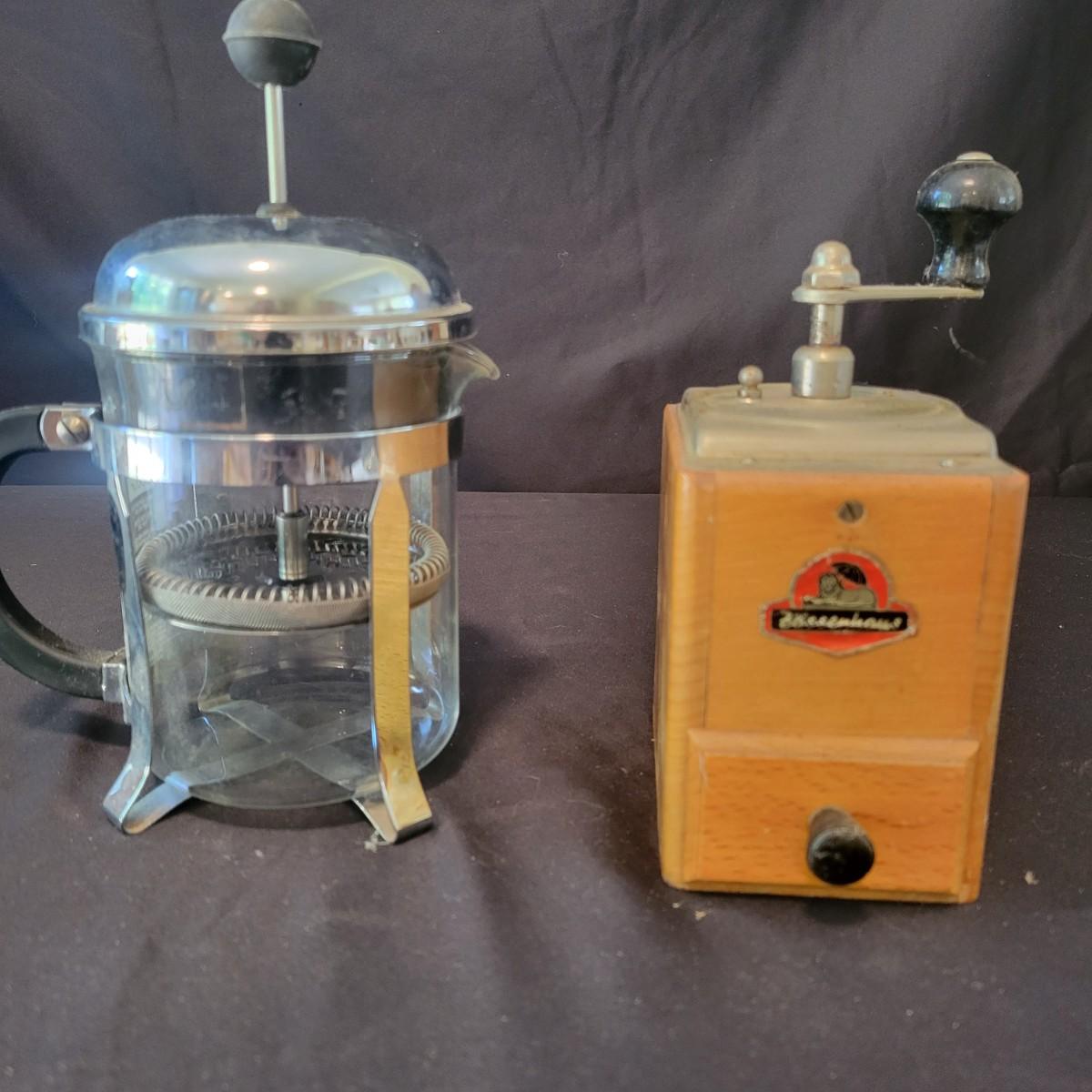 Glass and stainless Bodum French press in excellent condition measures approximately 4" x 8". Zassenhaus hand crank coffee grinder with a wooden base. Has a dovetailed drawer for collecting ground coffee. Crank turns. Shipping available