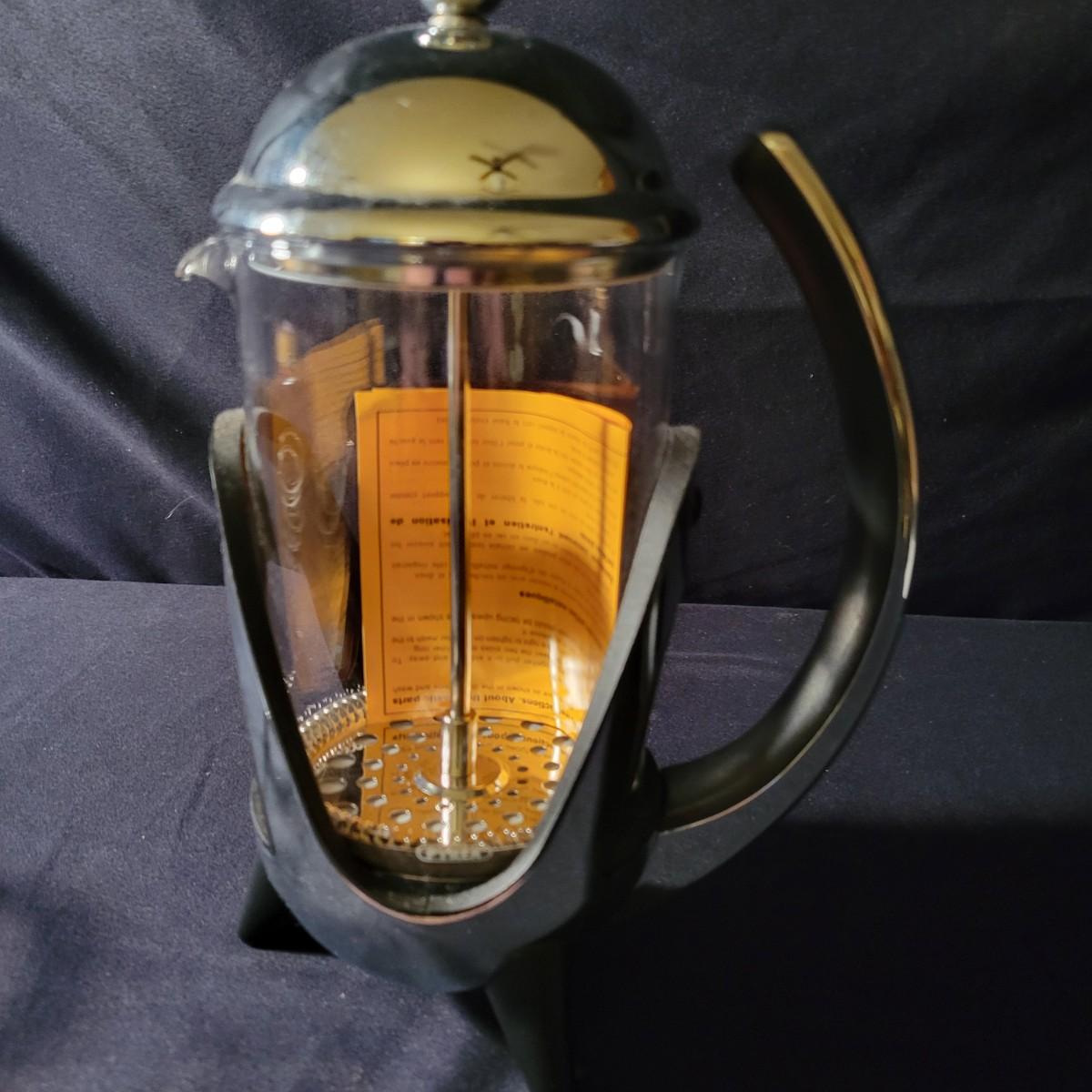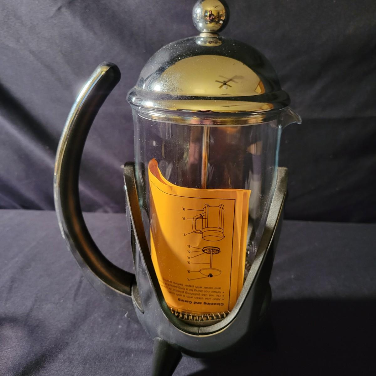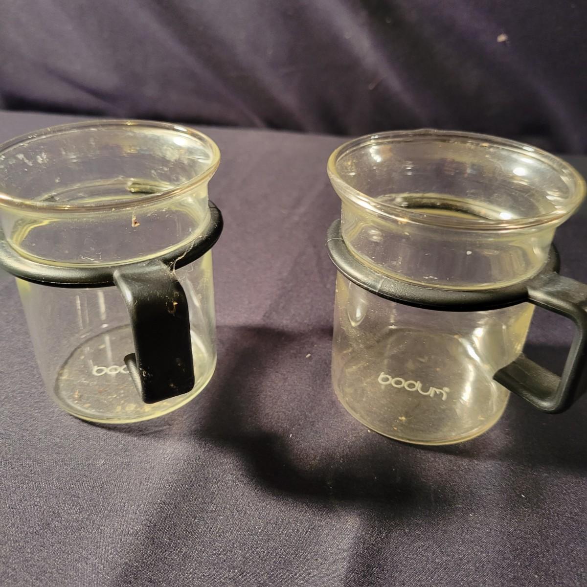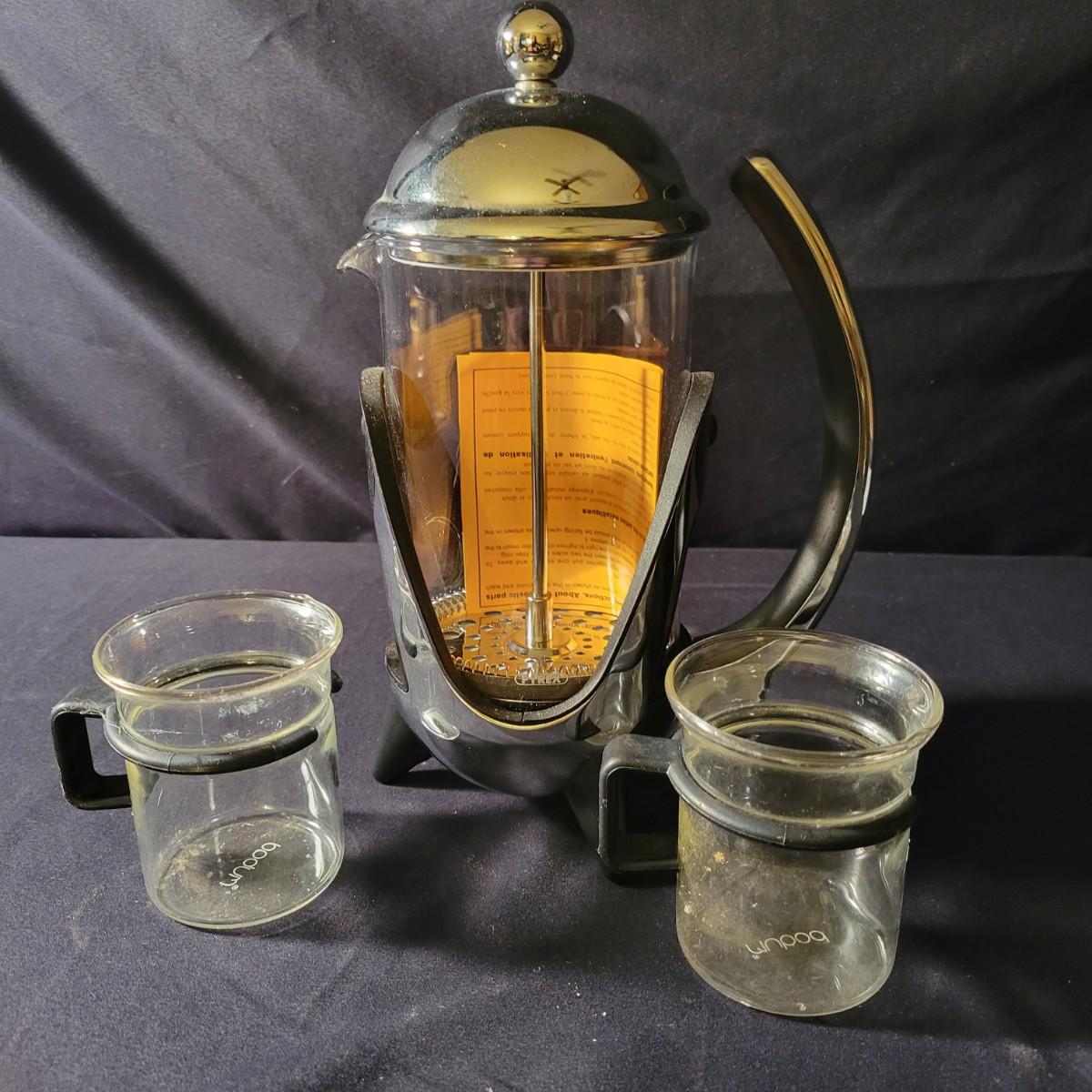 A Bodum Pyrex French Press and glasses in good condition. French Press appears to have never been used and the glasses are a little dirty. French Press measures approximately 6" x 10.5" Shipping available