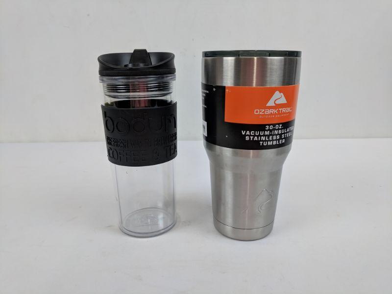 Bodum TRAVEL MUG, 15 oz, Plastic, Black & 30 oz Stainless Steel Tumbler, Ozark Trail - New