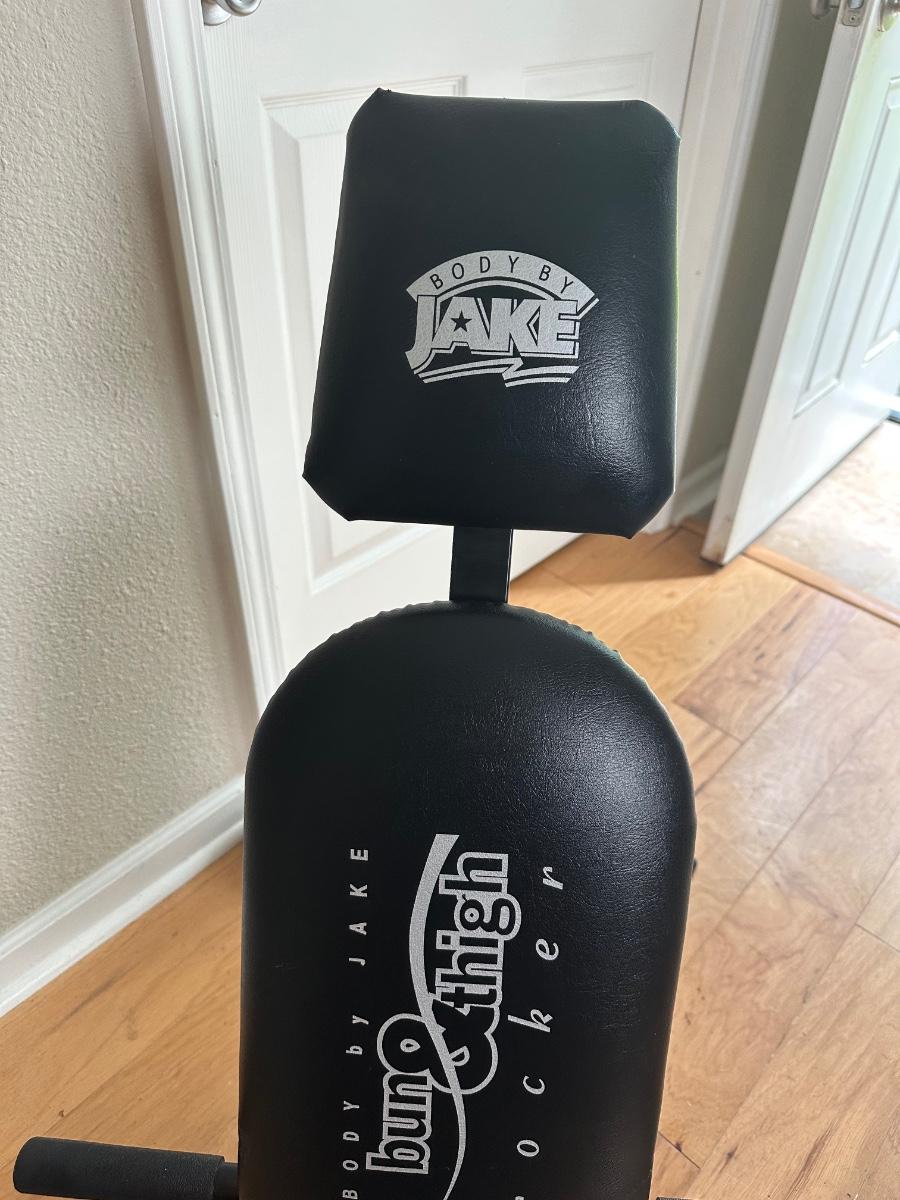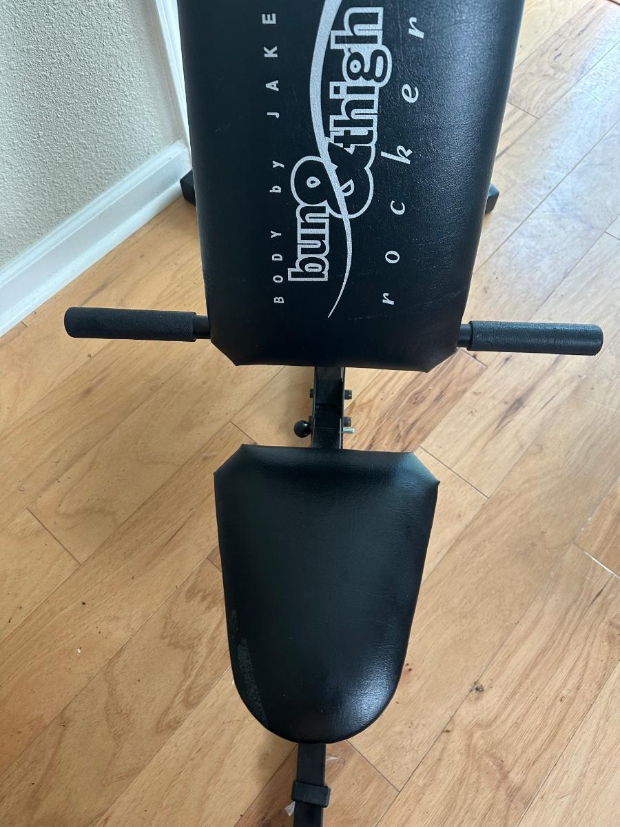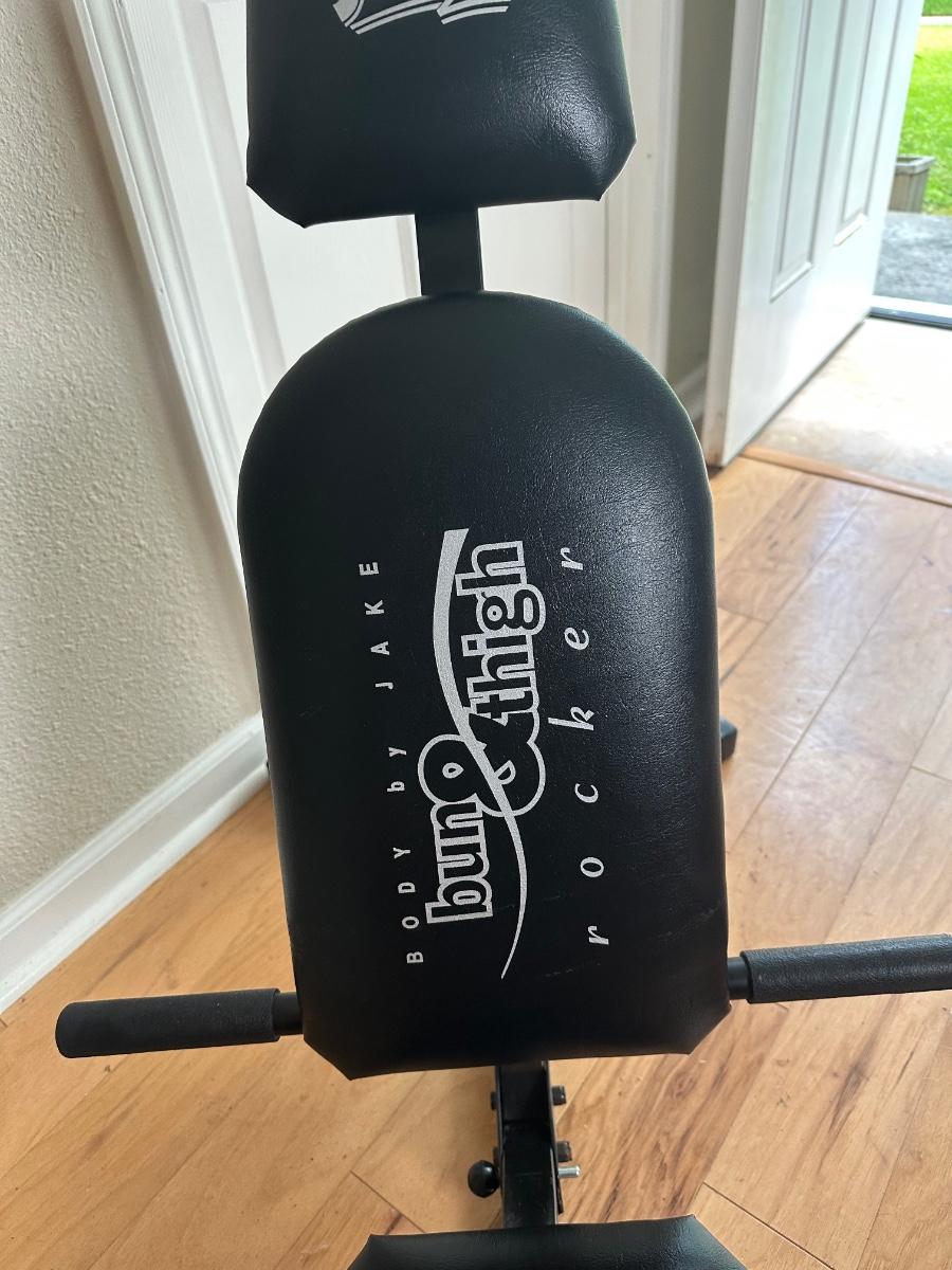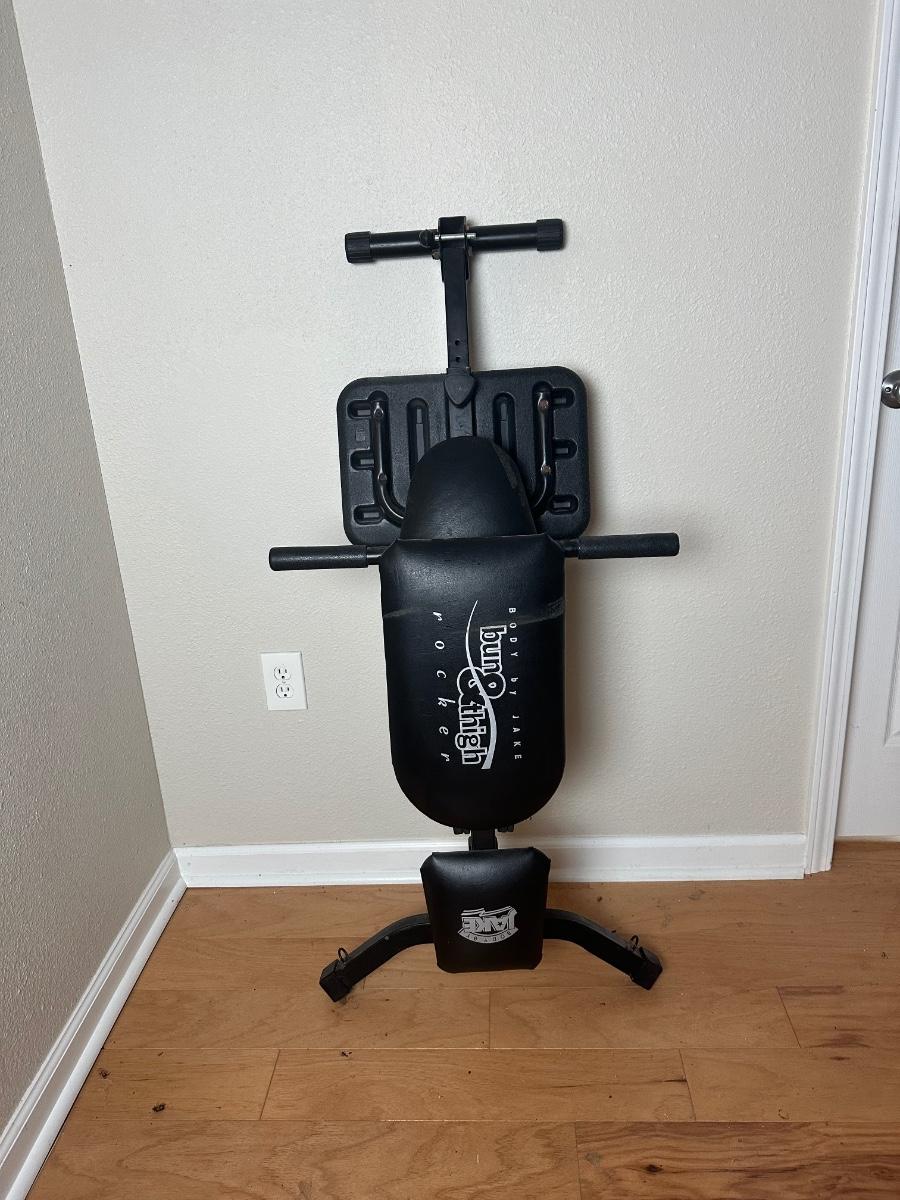 Folds away to slip under bed to easily store. BODY BY JAKE BUN & THIGH ROCKER W/ 4 RESISTANCE BANDS.