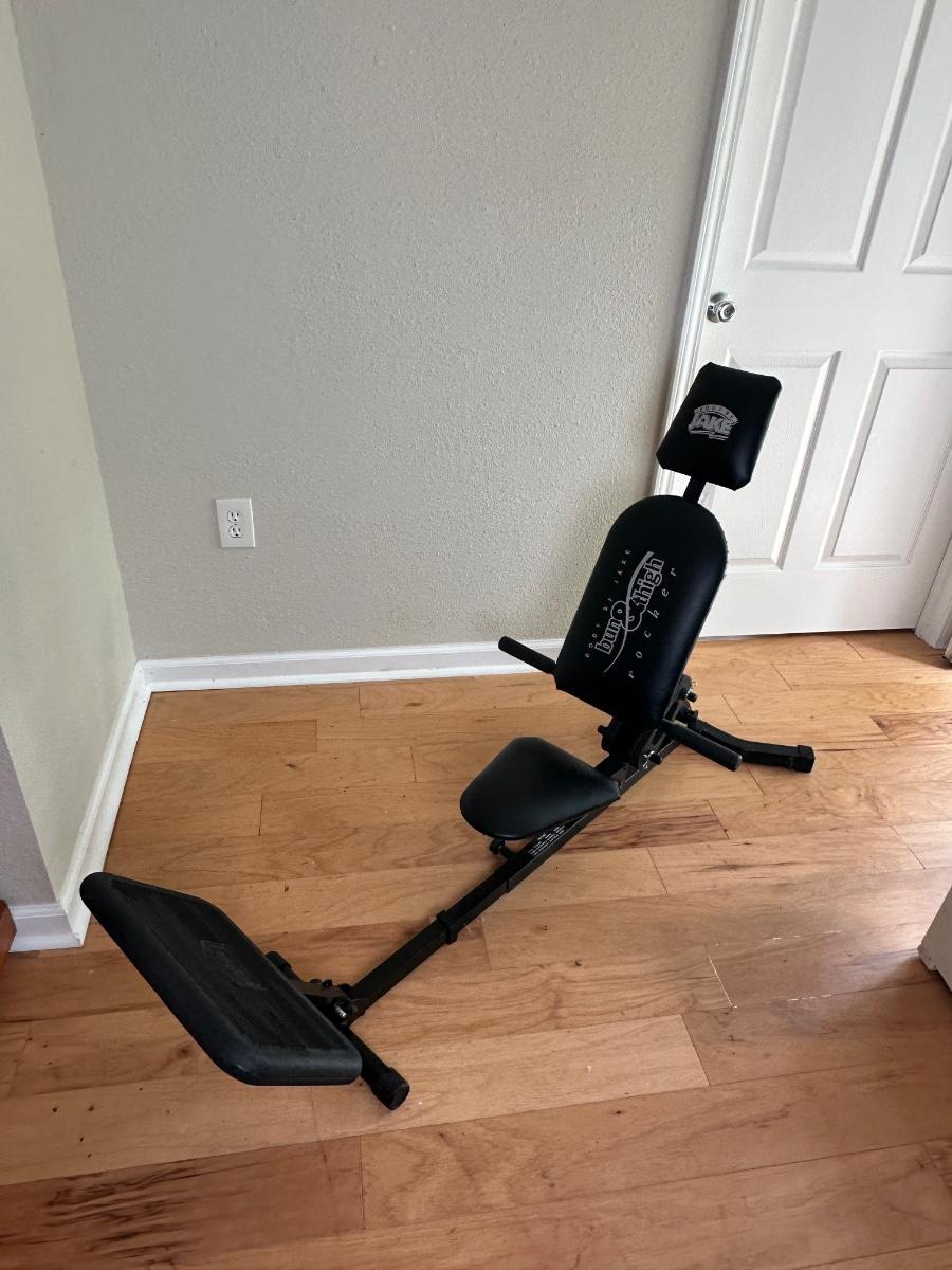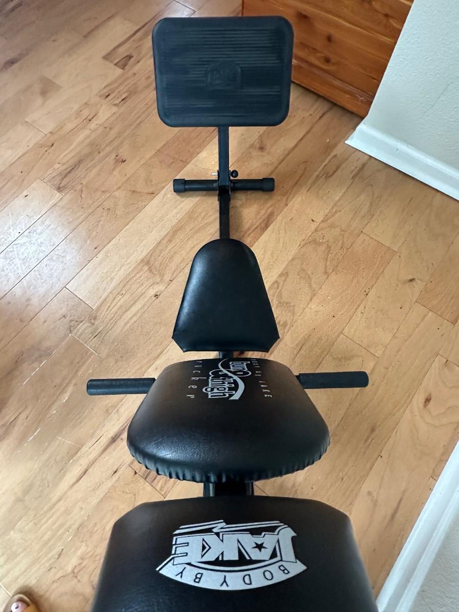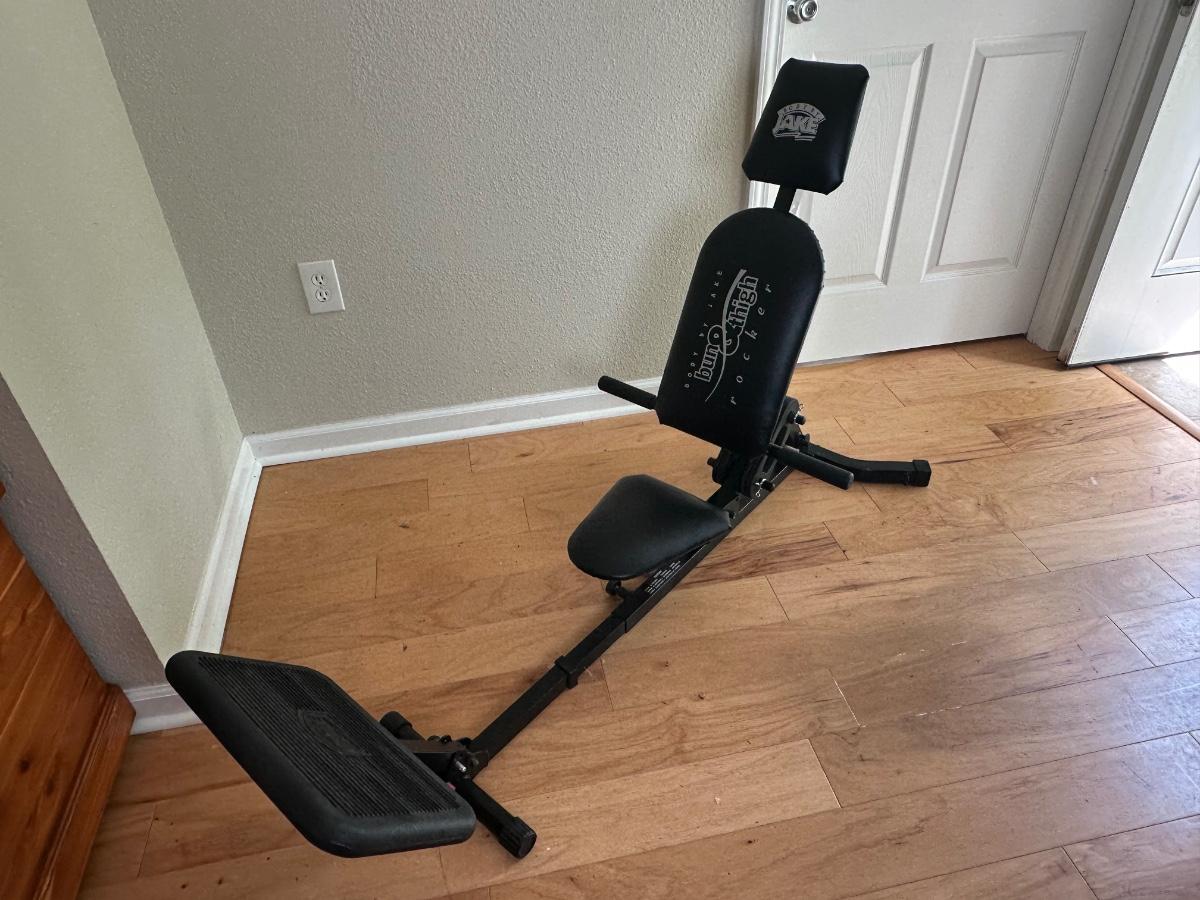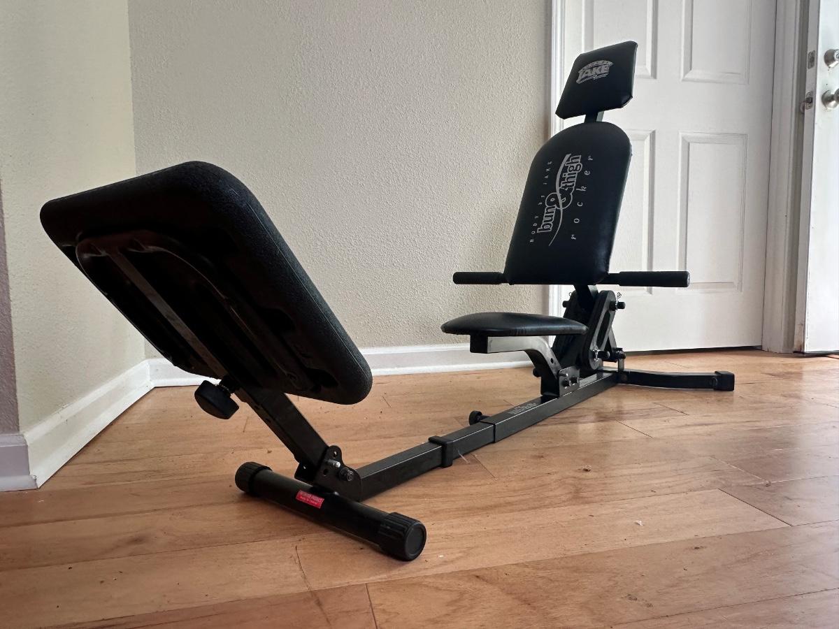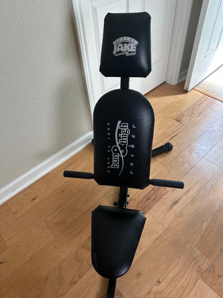 Folds away to slip under bed to easily store. BODY BY JAKE BUN & THIGH ROCKER W/ 4 RESISTANCE BANDS.