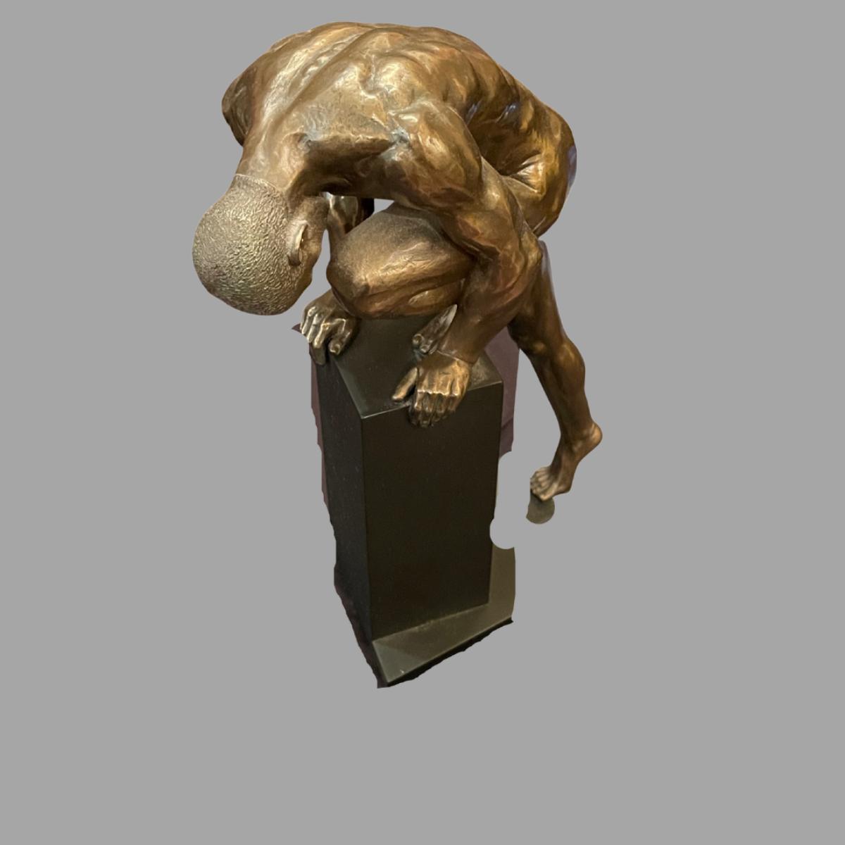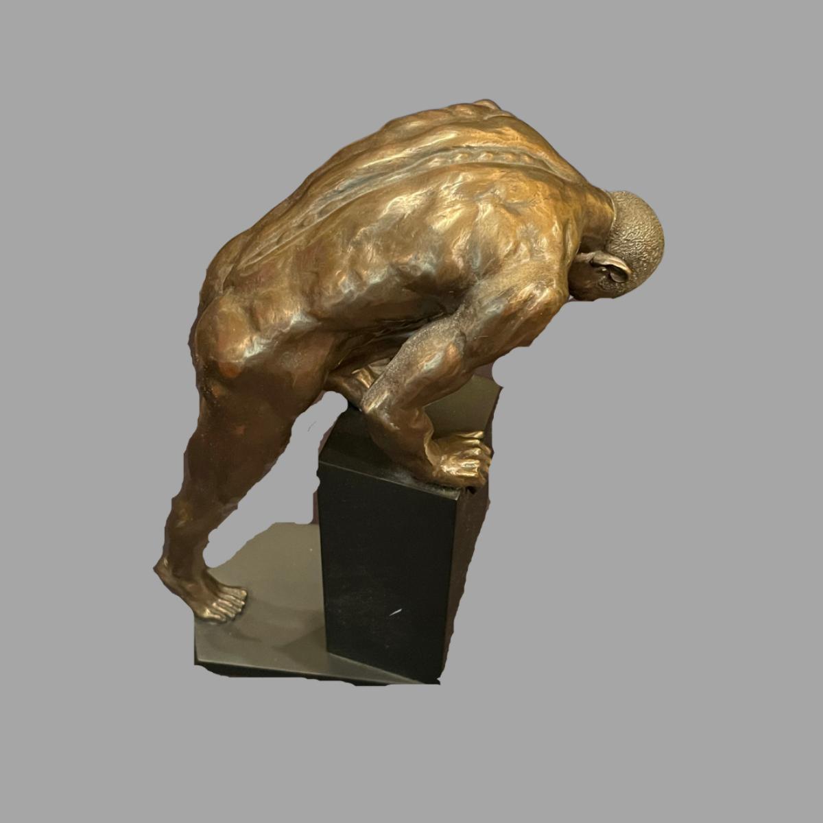 This stretching nude athlete body builder is a unique representation of the athlete. It is finished with a bronze patina.