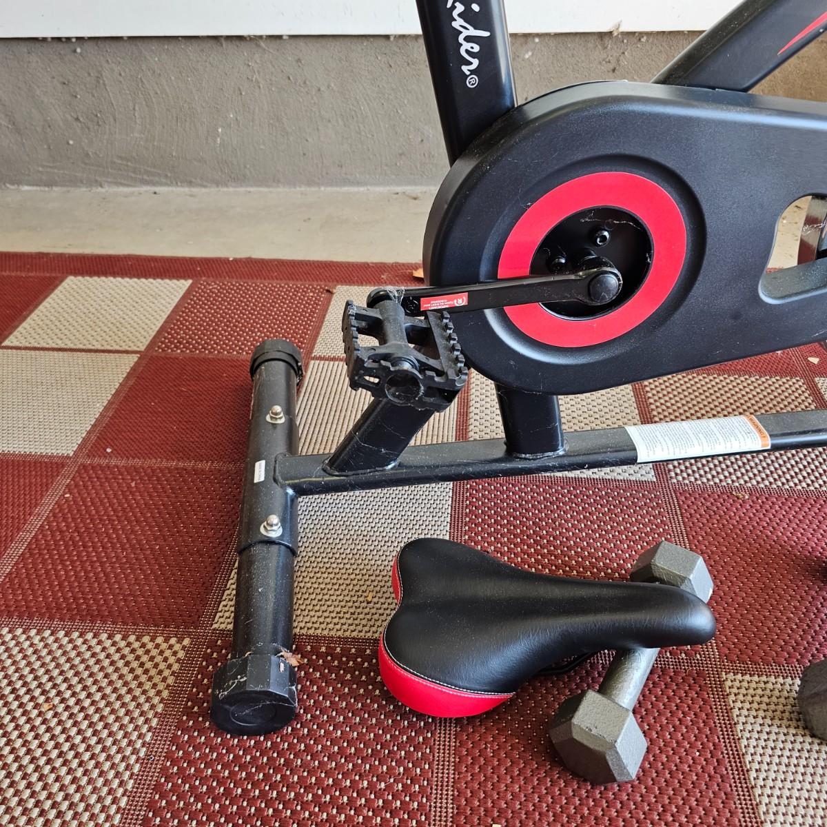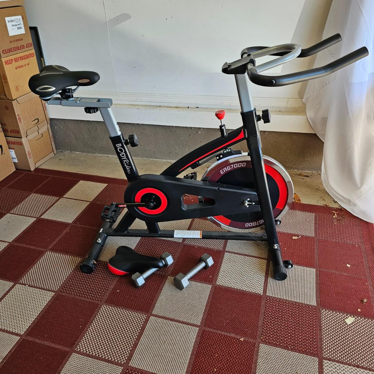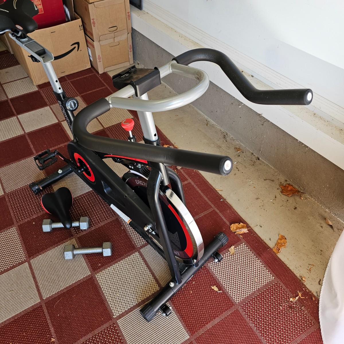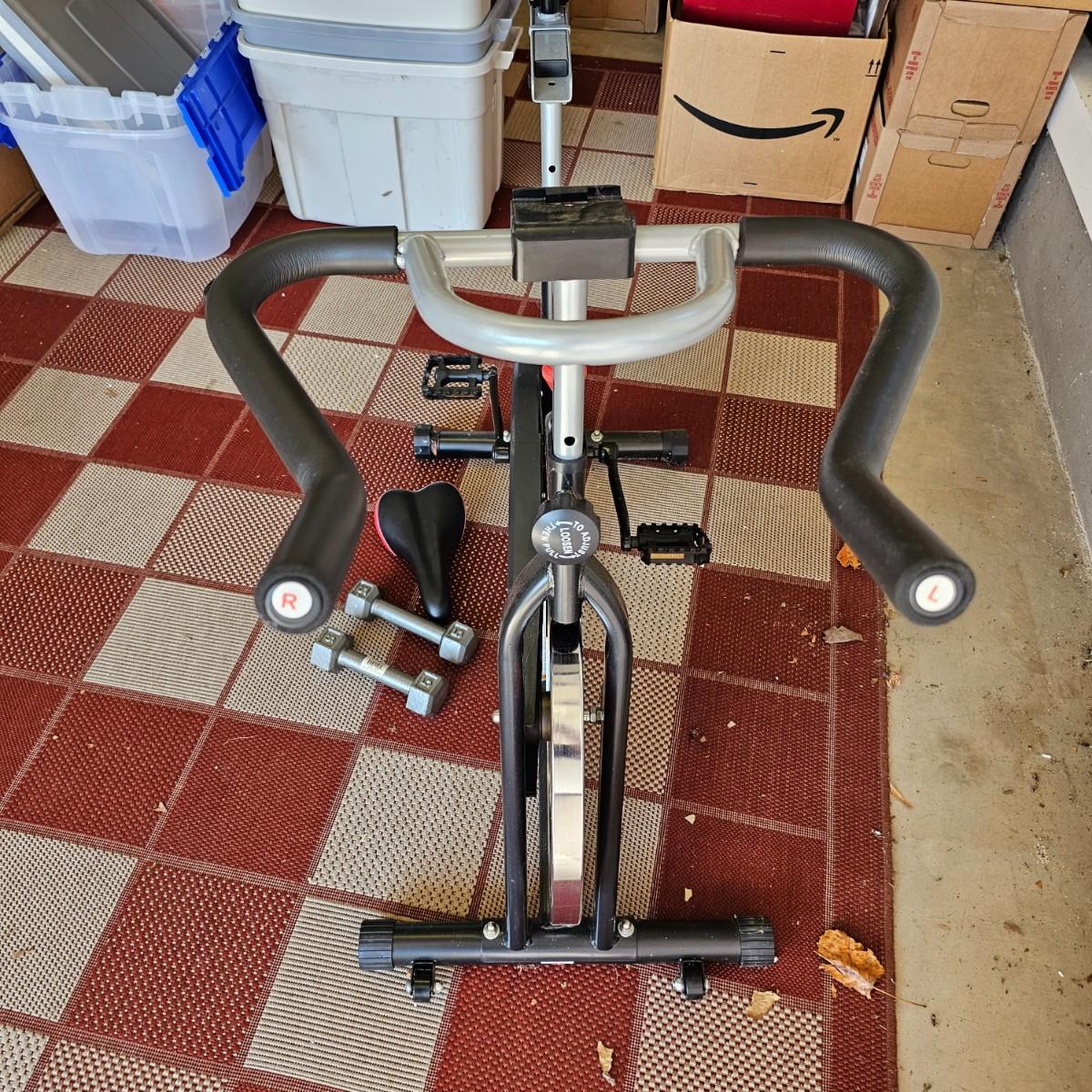 Exercise bike with centrifugal weighted wheel. Grip style pedals, adjustable seat and resistance. Extra seat and two 5 lb. hand weights are included. Bike measures 47" x 20" x 38"H. See photos for details. Local pickup only. Winning bidder must bring assistance to help move and load this item due to its weight and/or size.