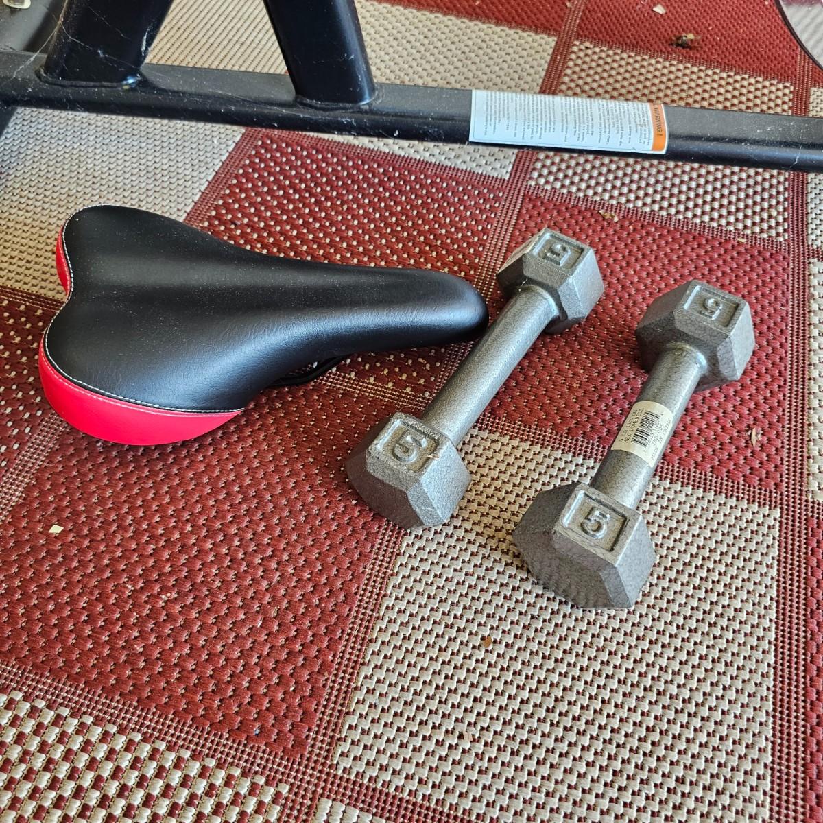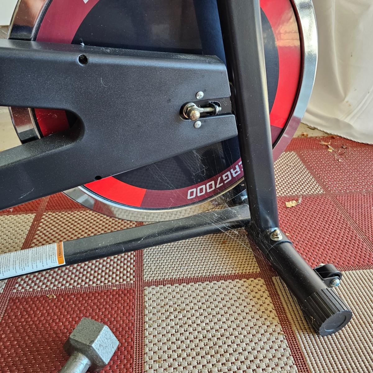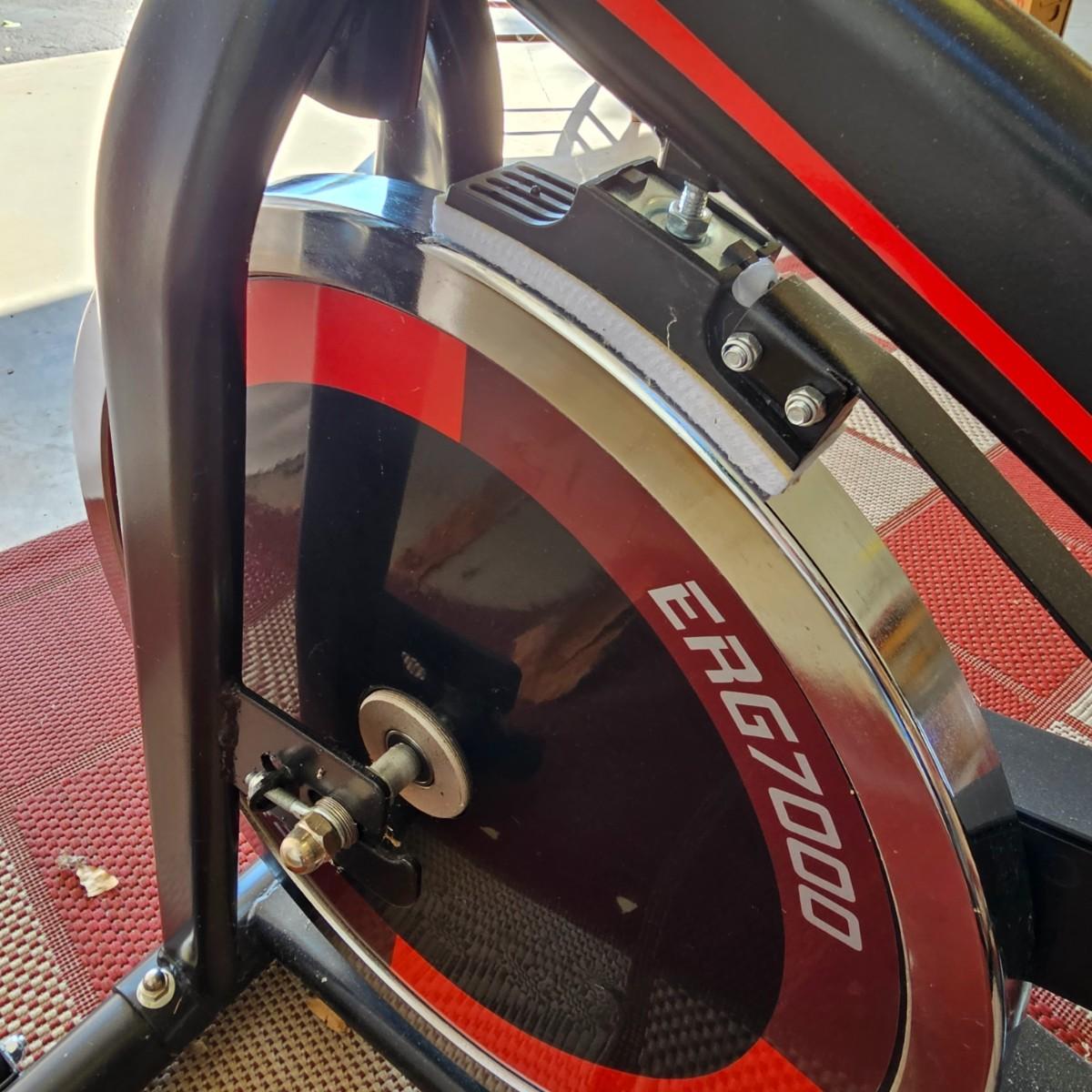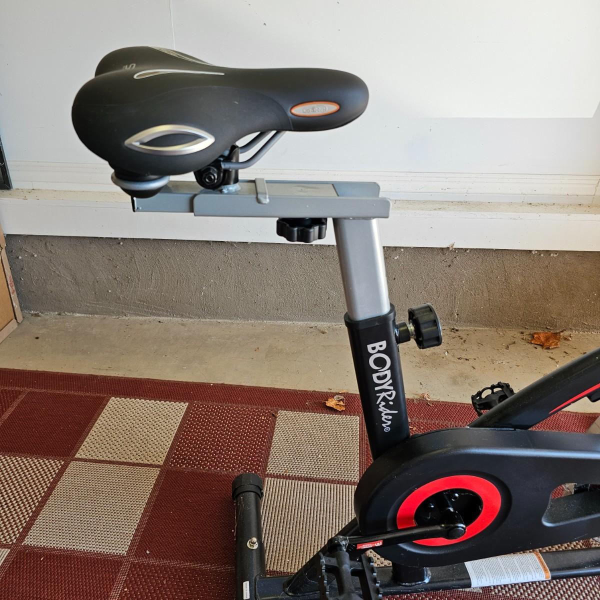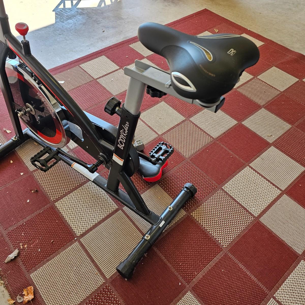 Exercise bike with centrifugal weighted wheel. Grip style pedals, adjustable seat and resistance. Extra seat and two 5 lb. hand weights are included. Bike measures 47" x 20" x 38"H. See photos for details. Local pickup only. Winning bidder must bring assistance to help move and load this item due to its weight and/or size.