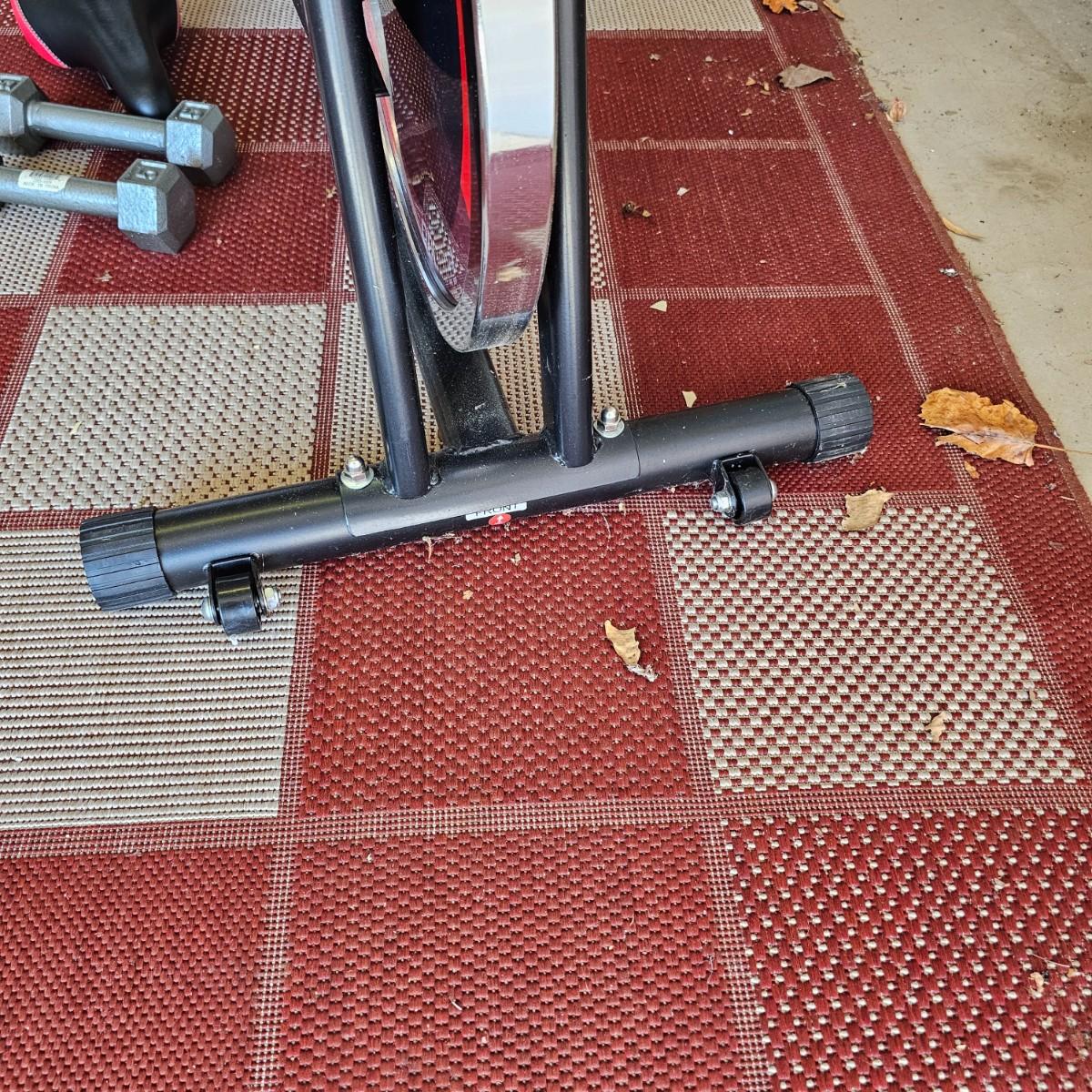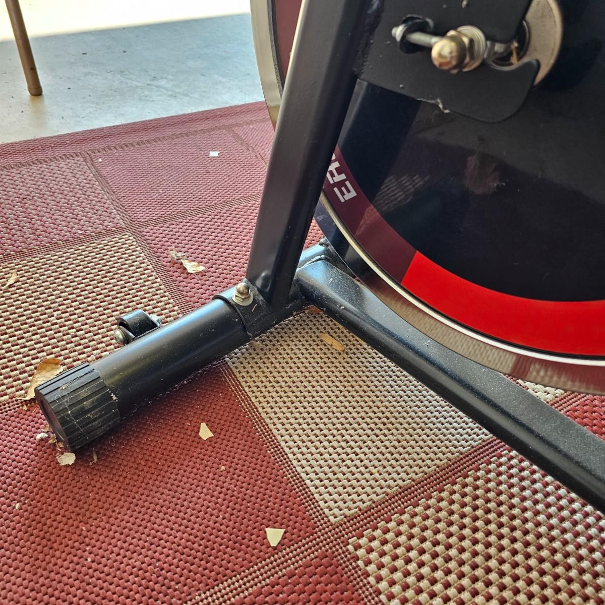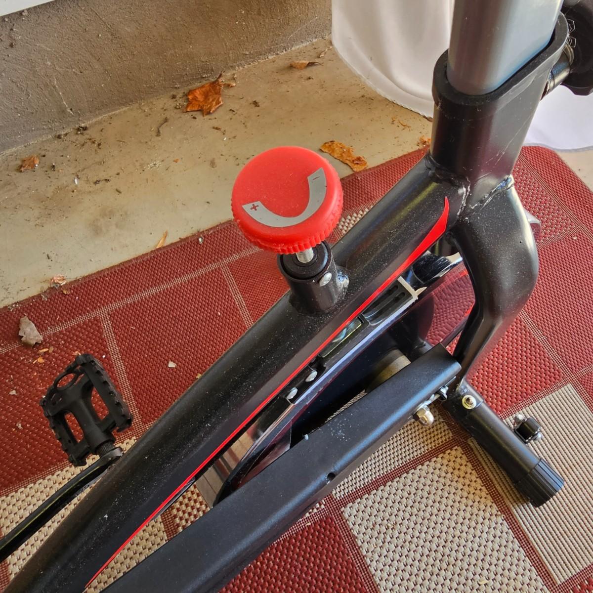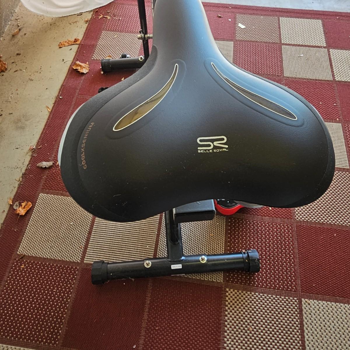 Exercise bike with centrifugal weighted wheel. Grip style pedals, adjustable seat and resistance. Extra seat and two 5 lb. hand weights are included. Bike measures 47" x 20" x 38"H. See photos for details. Local pickup only. Winning bidder must bring assistance to help move and load this item due to its weight and/or size.