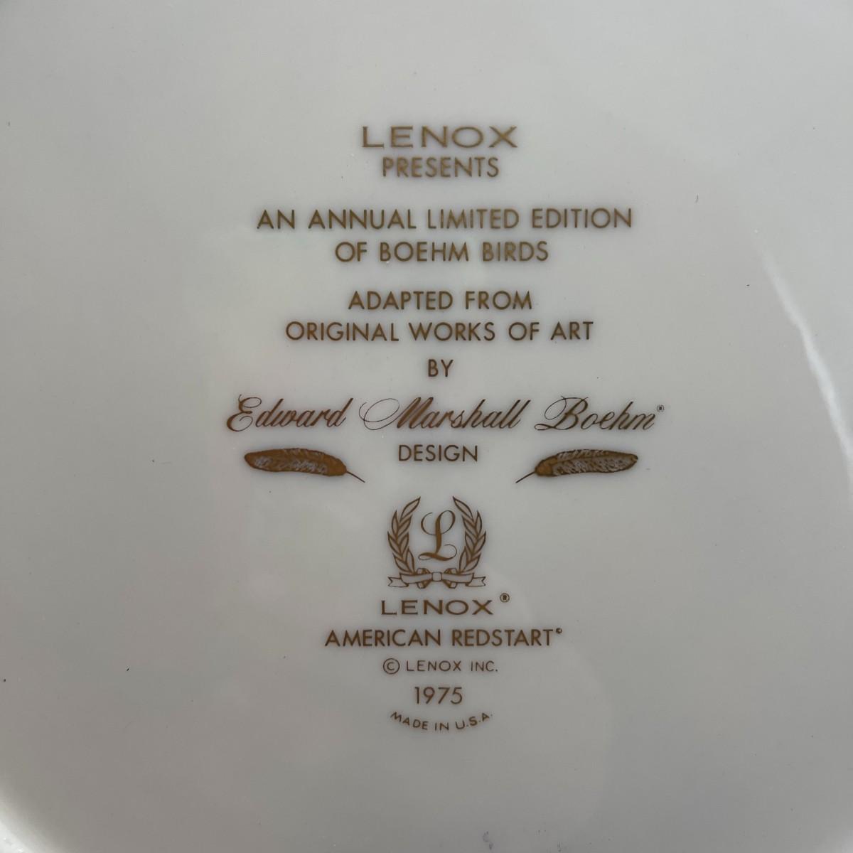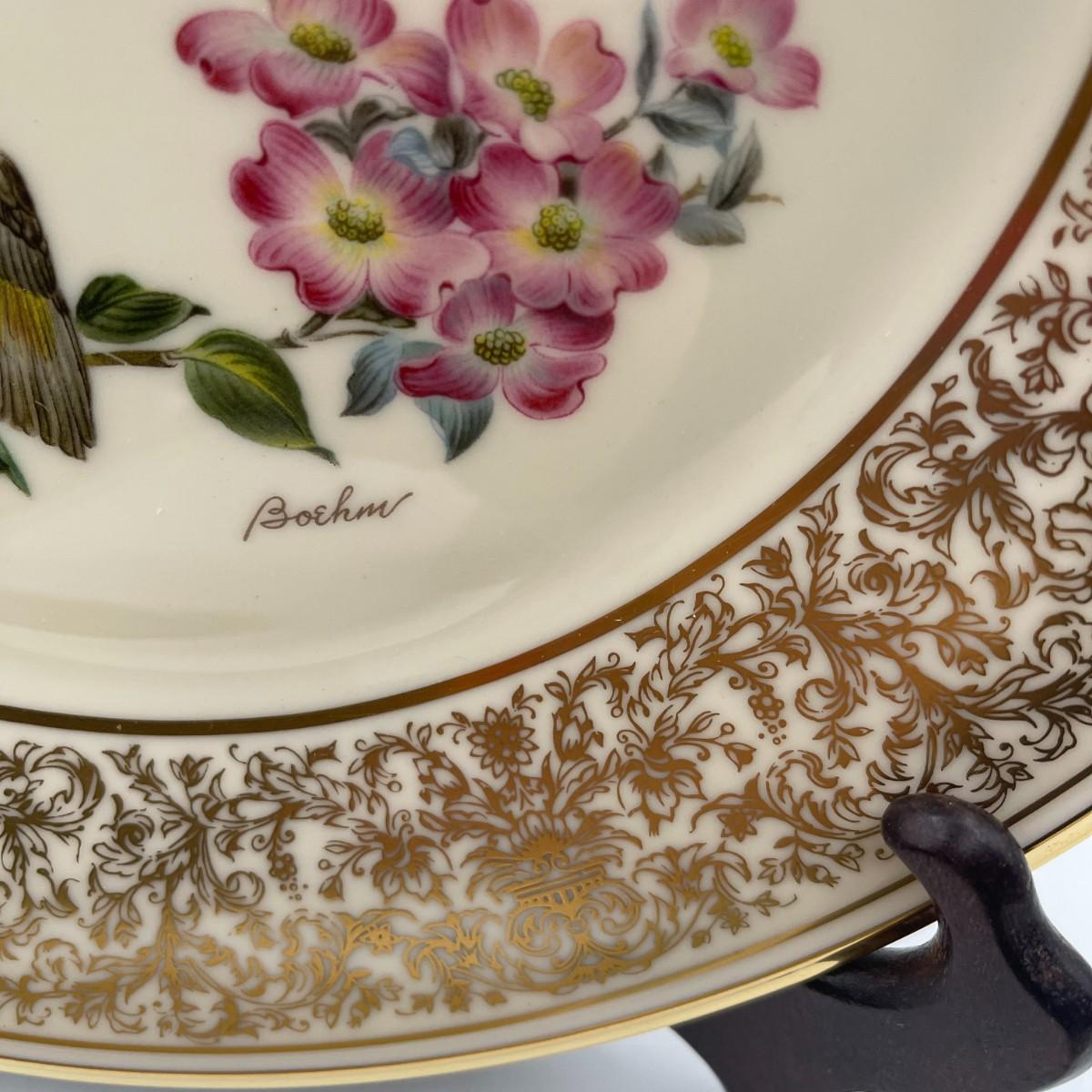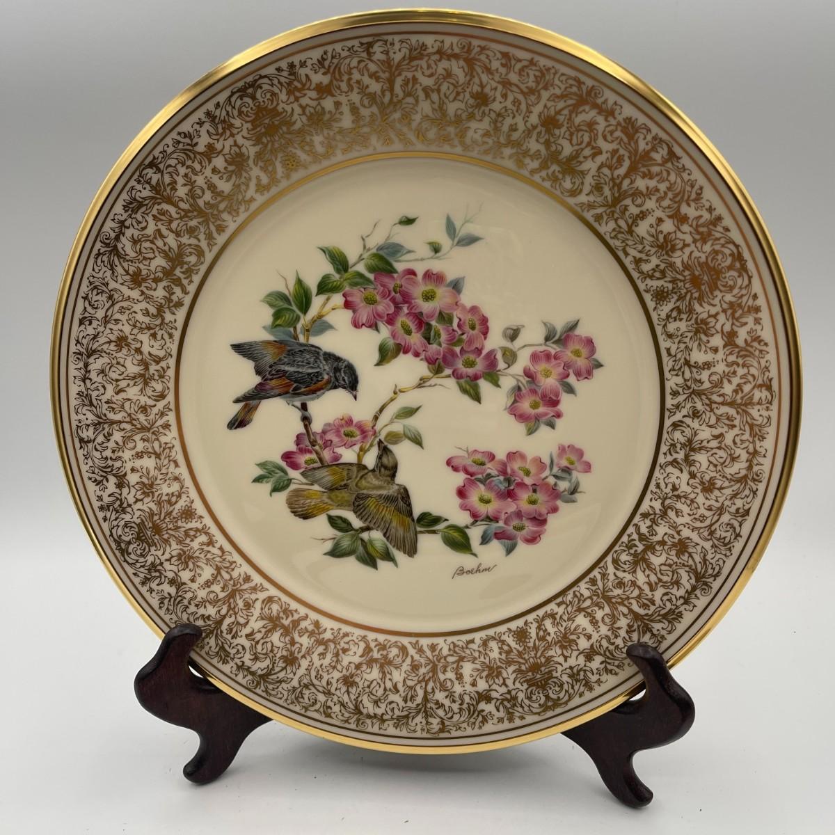 if you are a bird lover, Lenox collector, or fan of the art of Edward Marshall Boehm, you may need these plates to feather your nest. We have nine for you to choose from. These are fine, elegant pieces, hand painted after Boehm's work. Lovely gilded, lacy border. Pictured is the American Redstart. Can't you just hear them sing? 10" in Diameter # 850