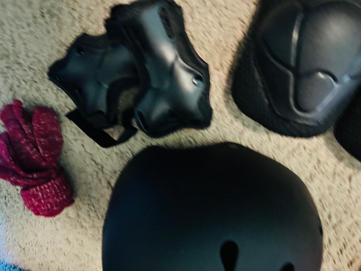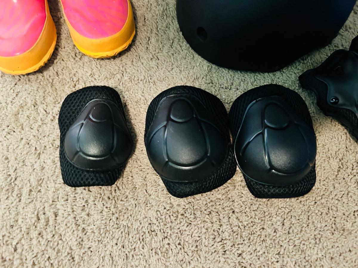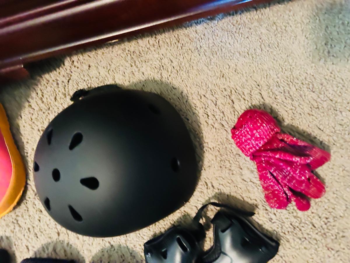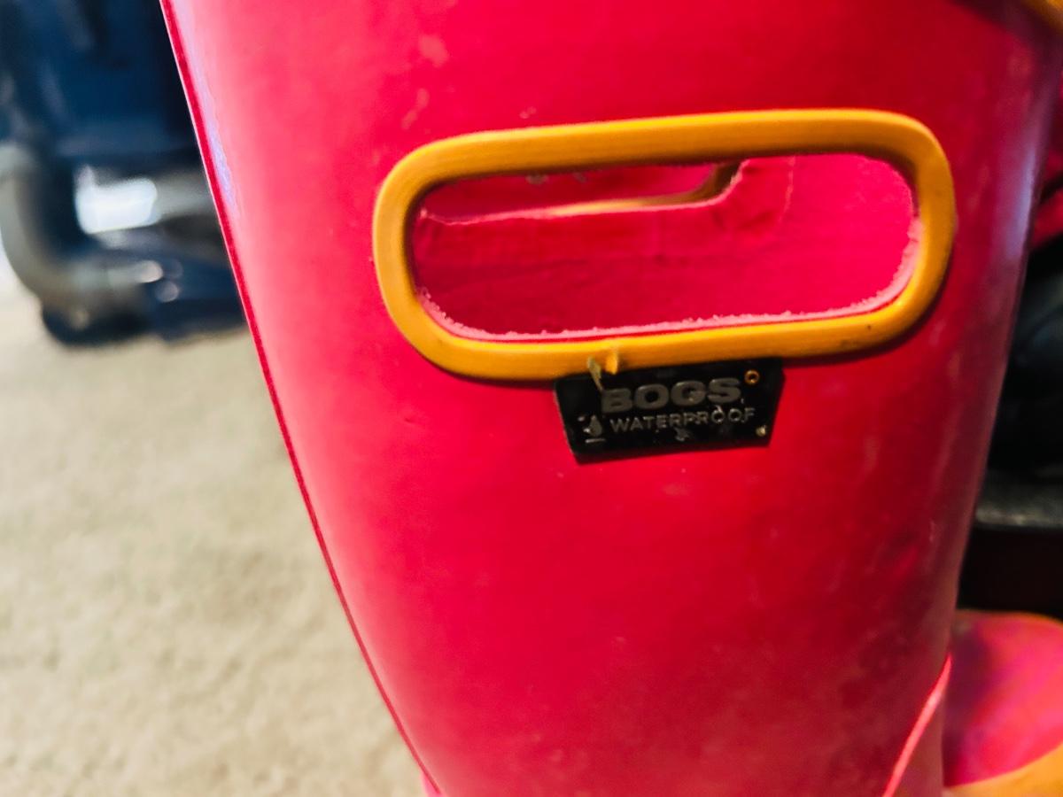 BOGS RAIN BOOTS AND CHILDREN'S HELMET KNEE PADS AND A SHOULDER PAD