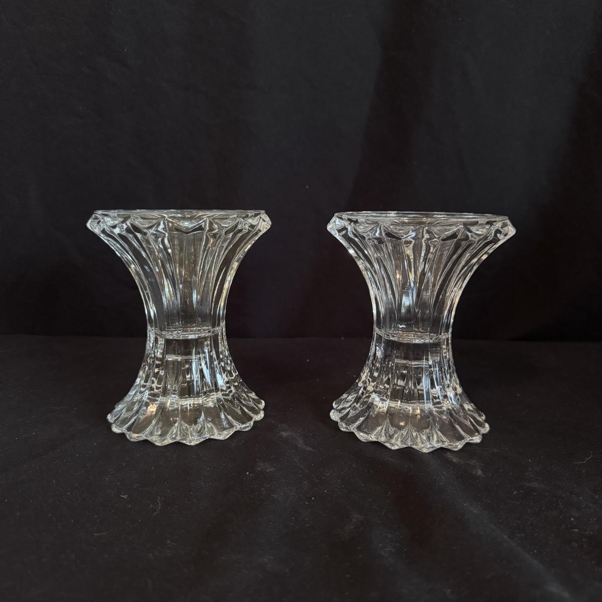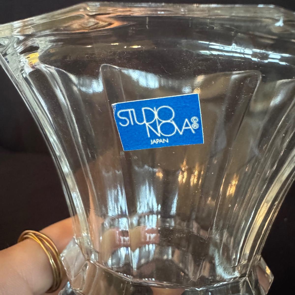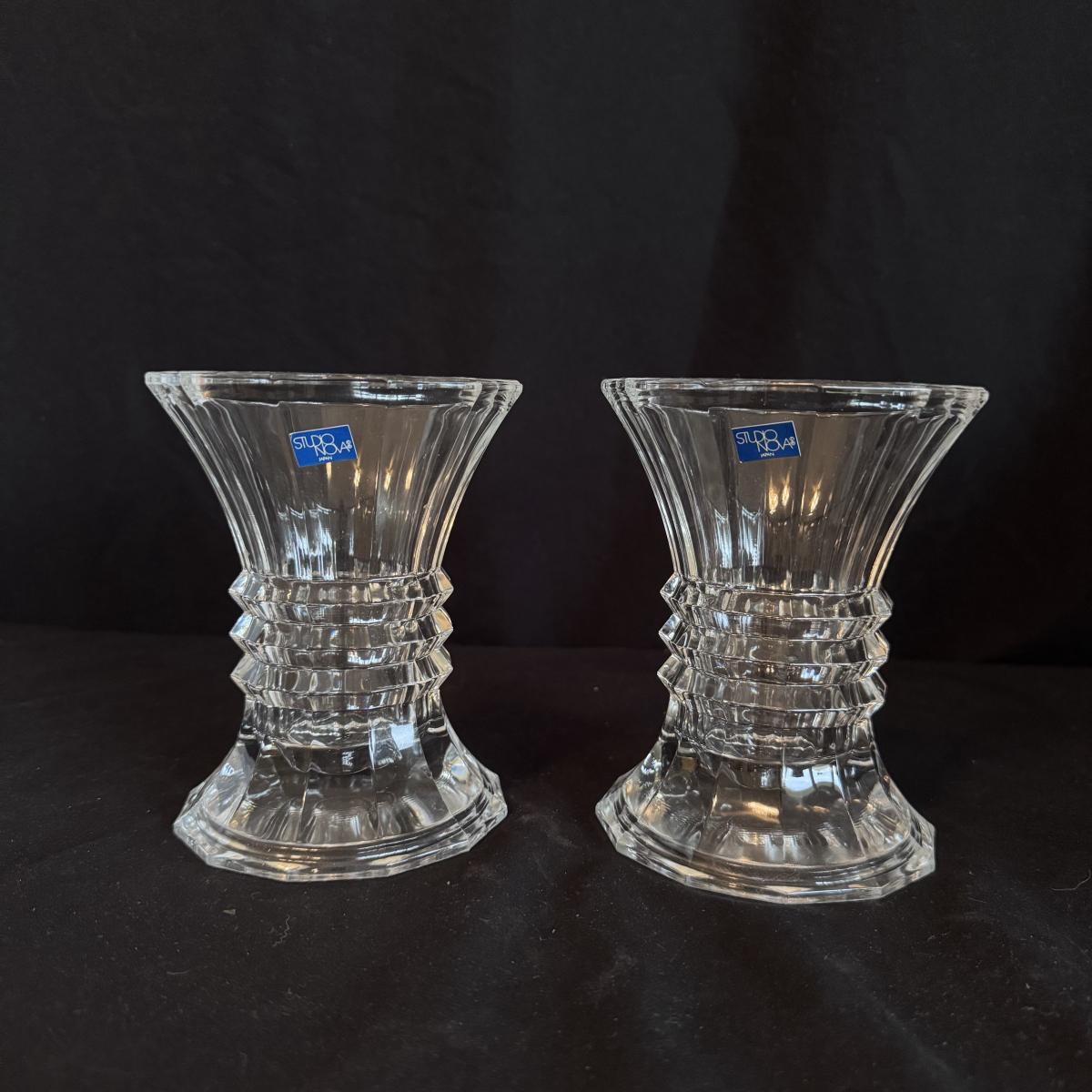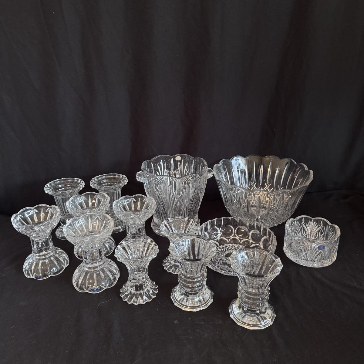 This lot includes four Bohemia crystal barbell candle holders, one Bohemia crystal candy bowl, and one Bohemia crystal ice bucket. Also included are two Studio Nova crystal bud vases, two unmarked crystal bowls, and two unmarked crystal barbell candleholders. The largest bowl measures 11.5”D x 7”H. Shipping available.