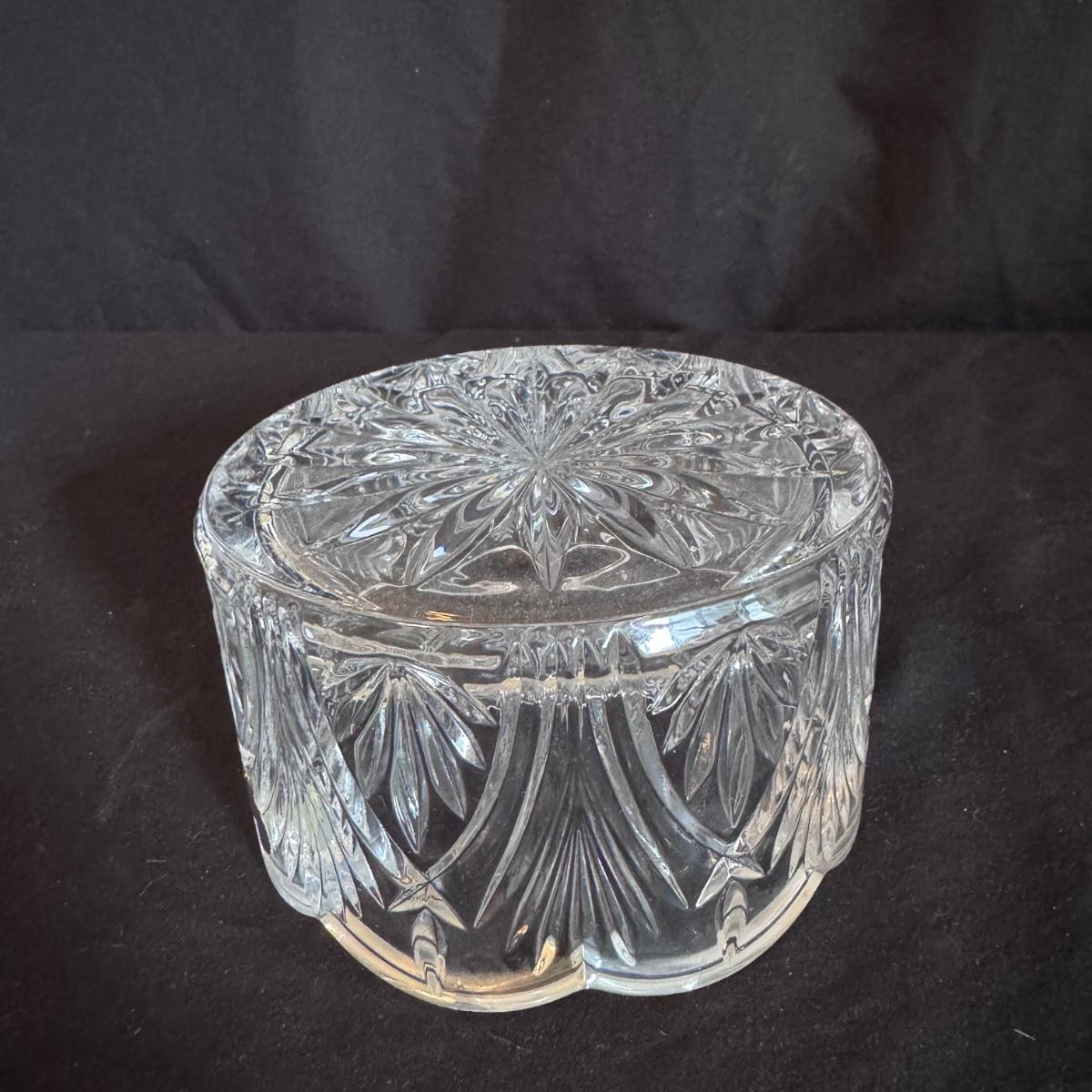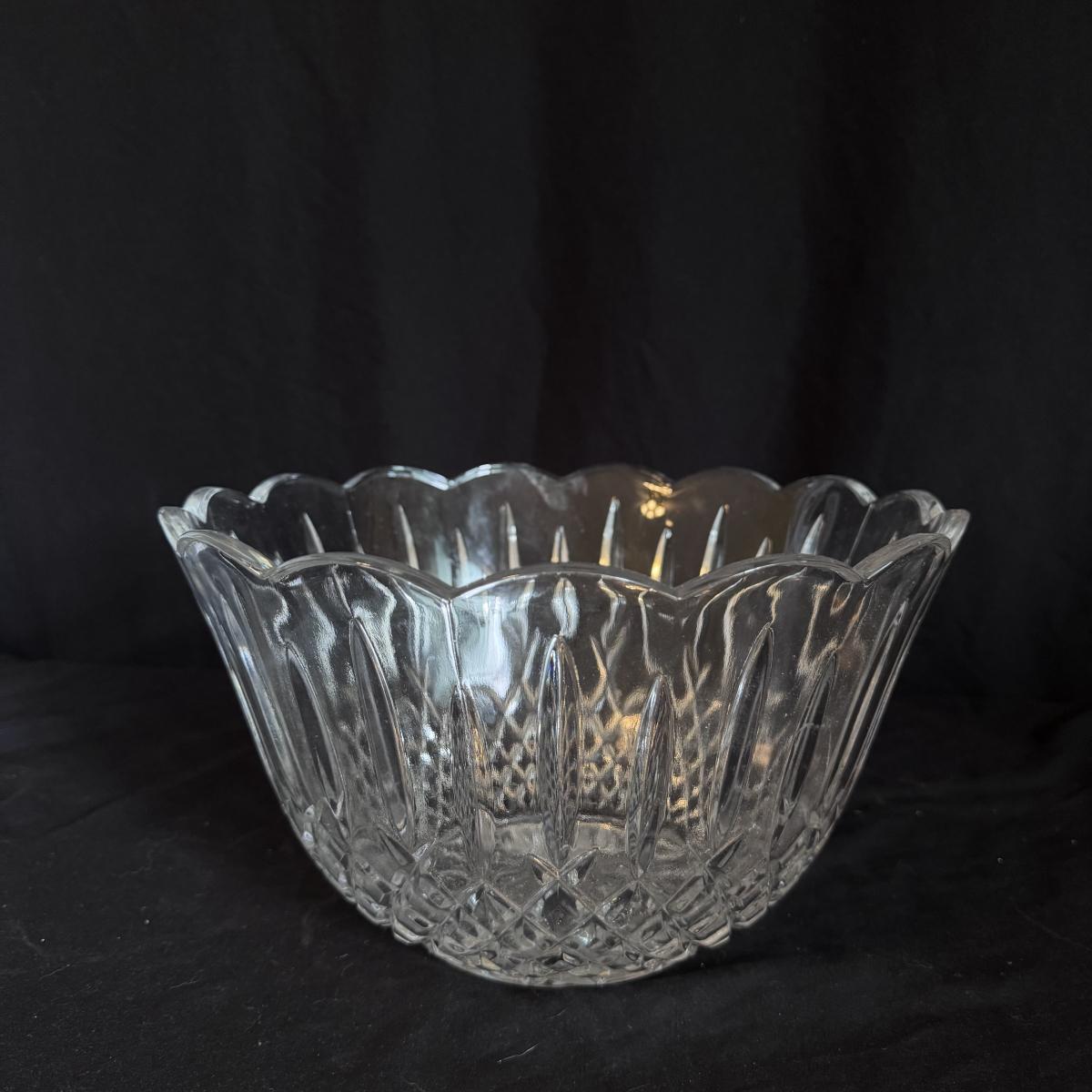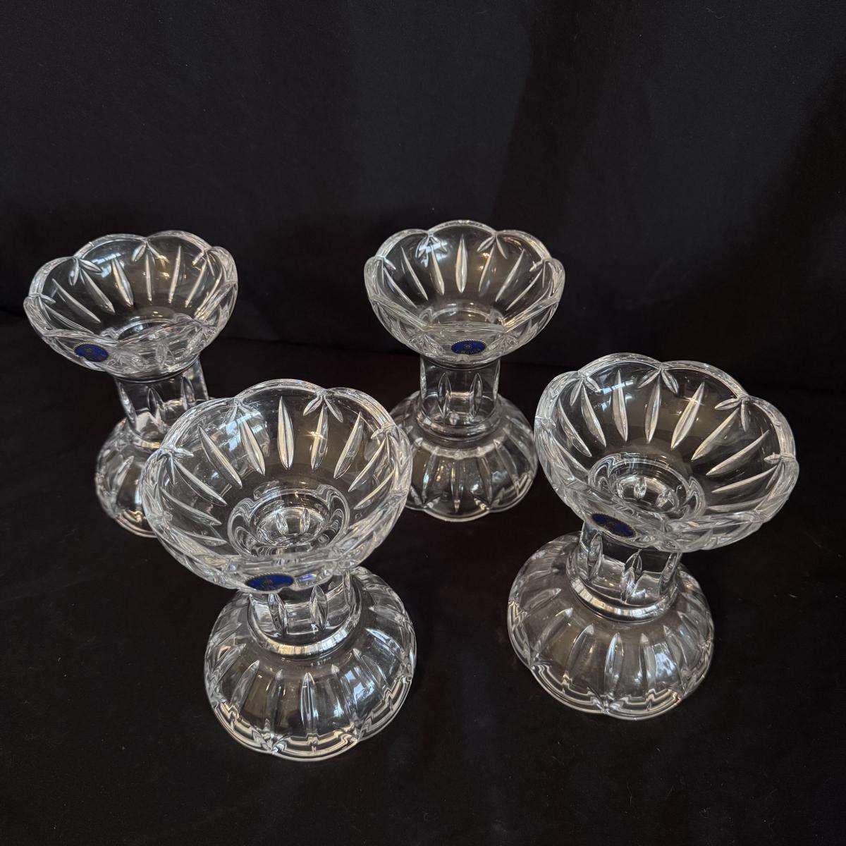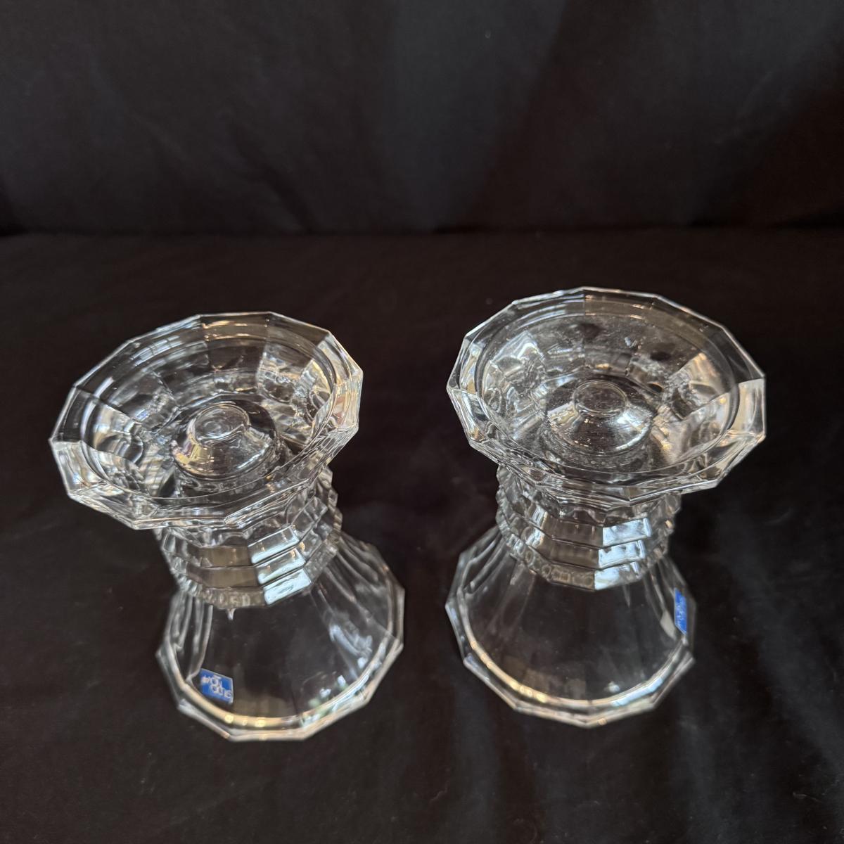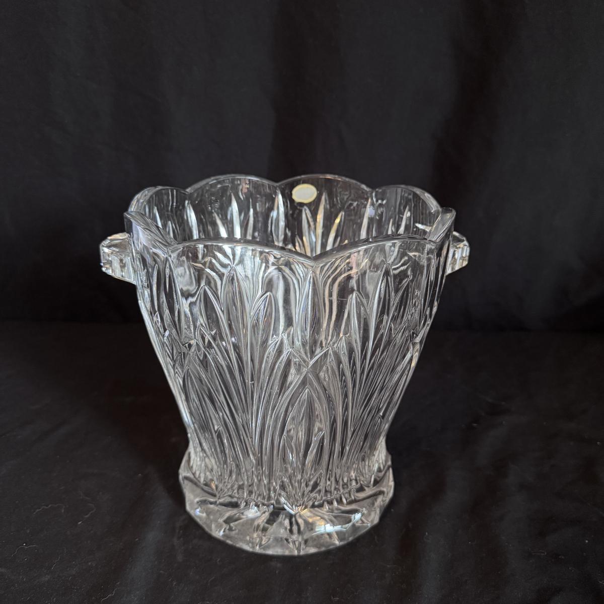 This lot includes four Bohemia crystal barbell candle holders, one Bohemia crystal candy bowl, and one Bohemia crystal ice bucket. Also included are two Studio Nova crystal bud vases, two unmarked crystal bowls, and two unmarked crystal barbell candleholders. The largest bowl measures 11.5”D x 7”H. Shipping available.