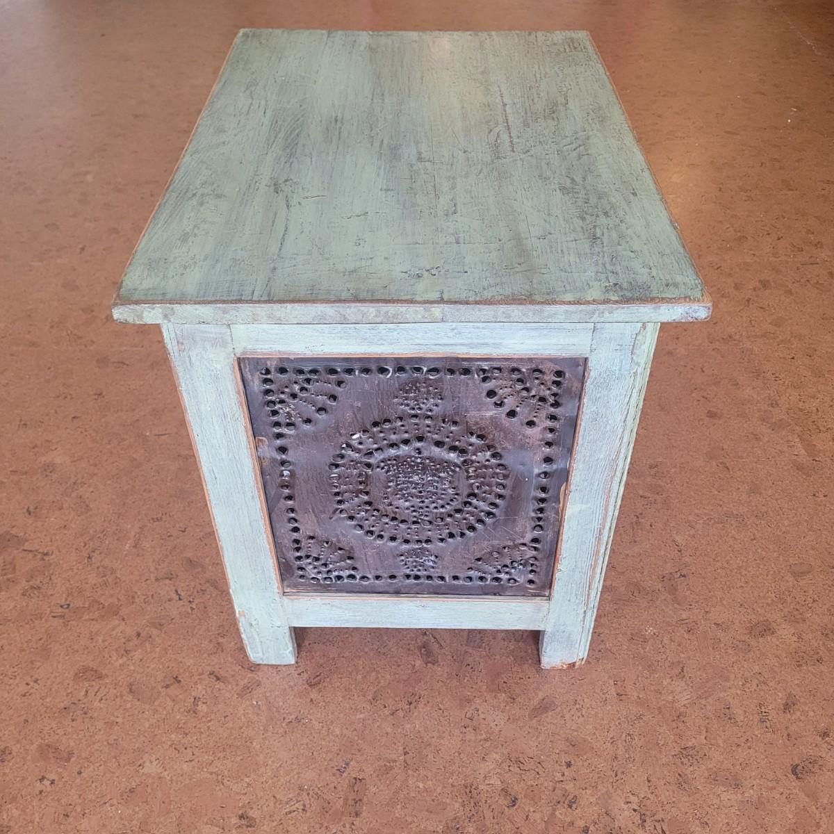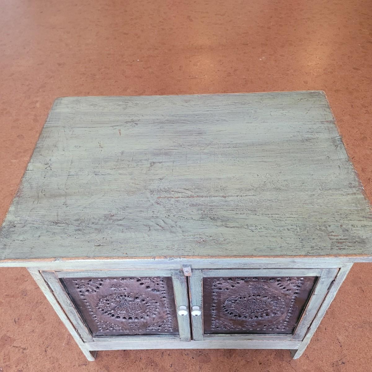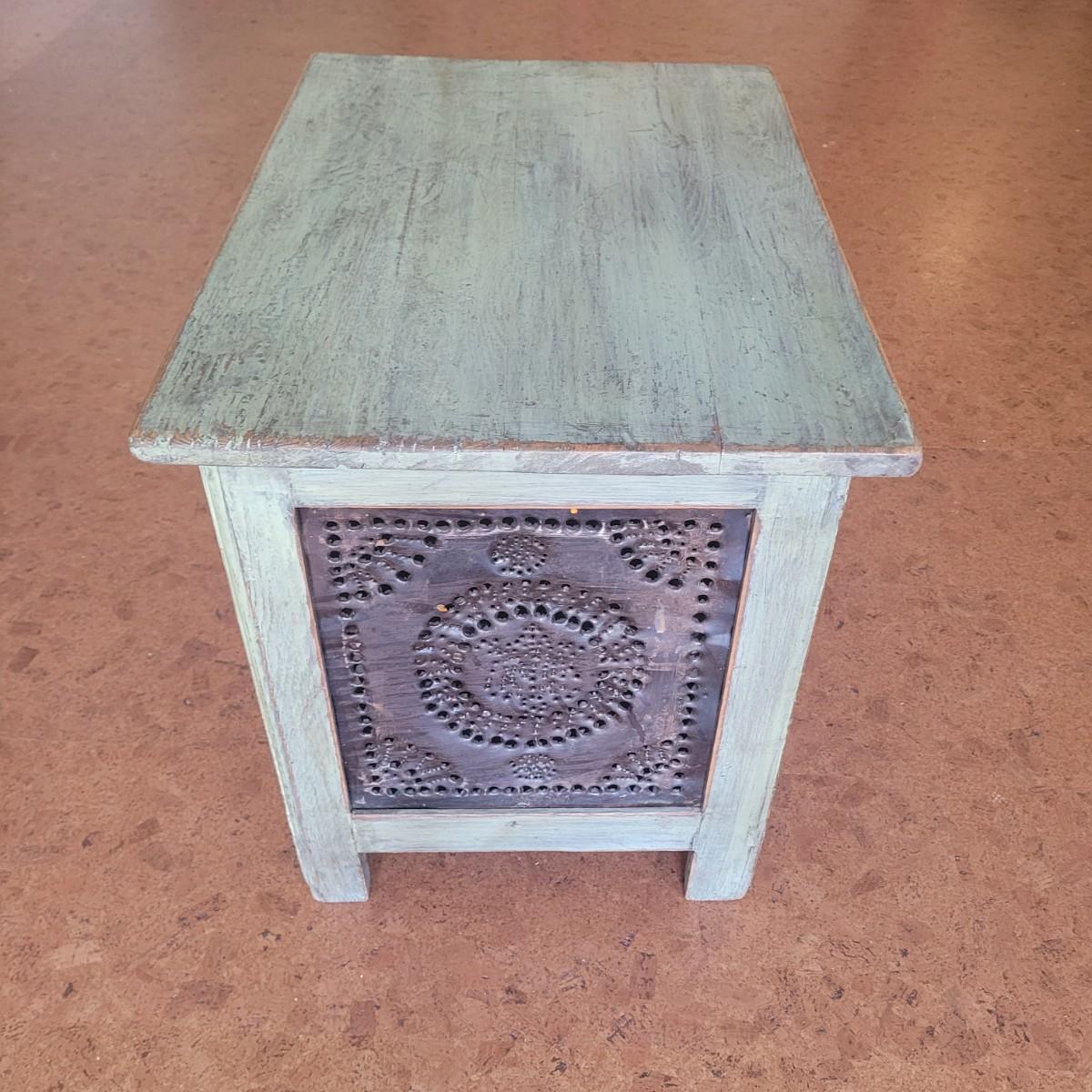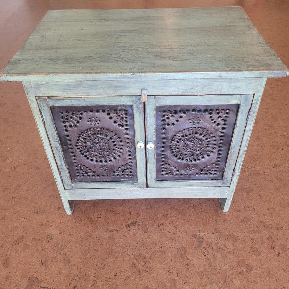 A small pie safe cabinet/end table. It is made from wood that has been distressed and punctured tin. The wood has been painted distressed green and the punctured tin features detailed pattern work. The table features two swinging doors with a wooden latch that open to a one shelf wooden interior. Item measures 26" x 18.5" x 22.5"H.